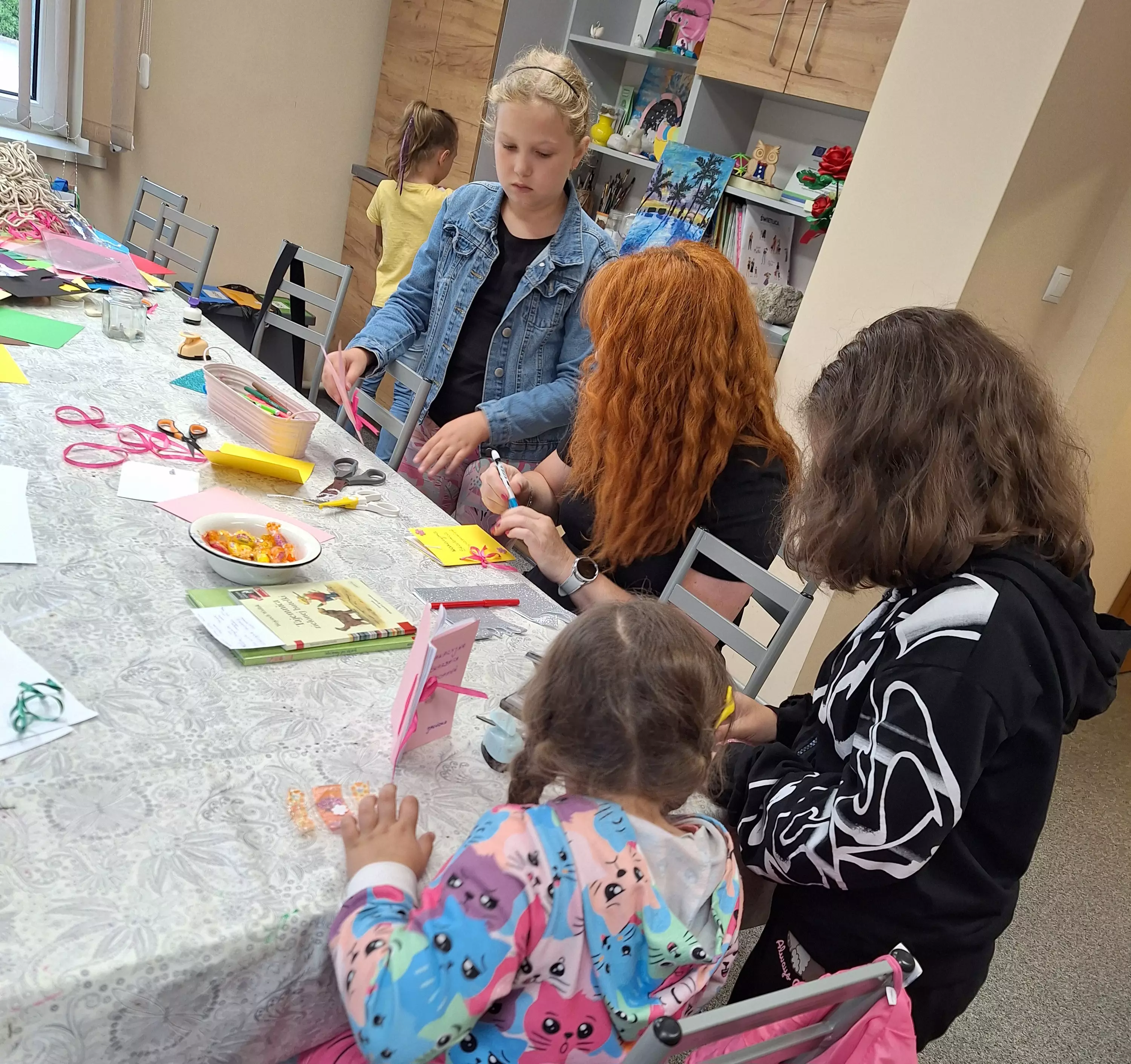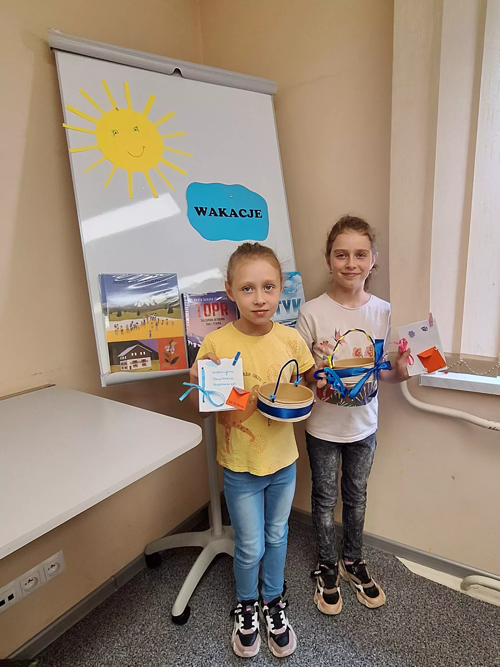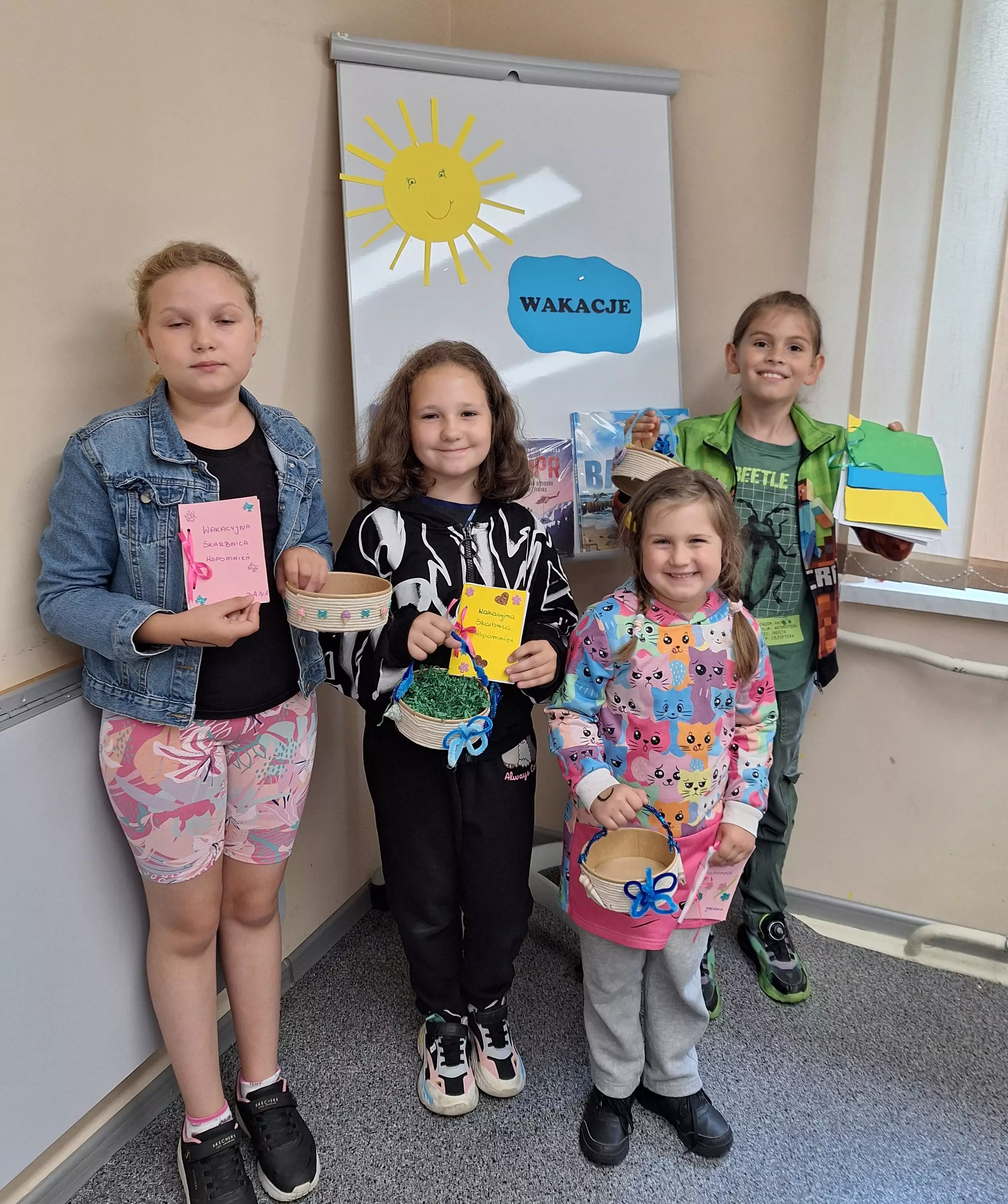 Dziewczynki wycinają motylki z papieru.Chłopczyk okleja sznurkiem koszyczek.Dziewczynka wycina serduszka z brokatowego papieru.Dziewczynka przykleja małą kopertę do swojej książeczki.Dziewczynka przykleja motylka do koszyczka. w tyle dziewczyna rozwija sznurek.Dziewczyny rozwijają sznurek.Chłopczyk wykleja w środku swój koszyczek wakacyjny.Wspólne zdjęcie dwóch dziewczynek po zajęciach w bibliotece.Wspólne zdjęcie dzieci po zajęciach.