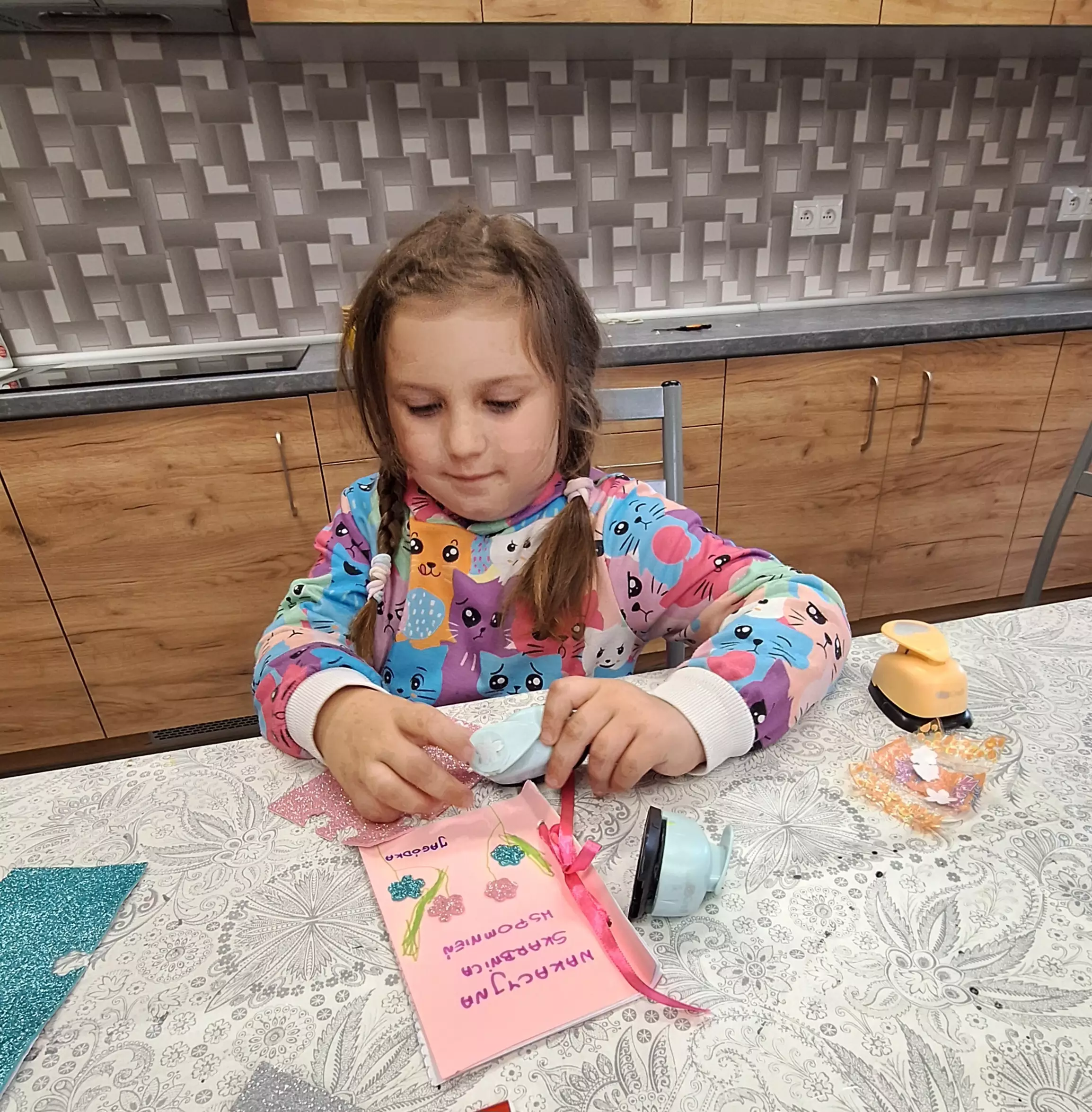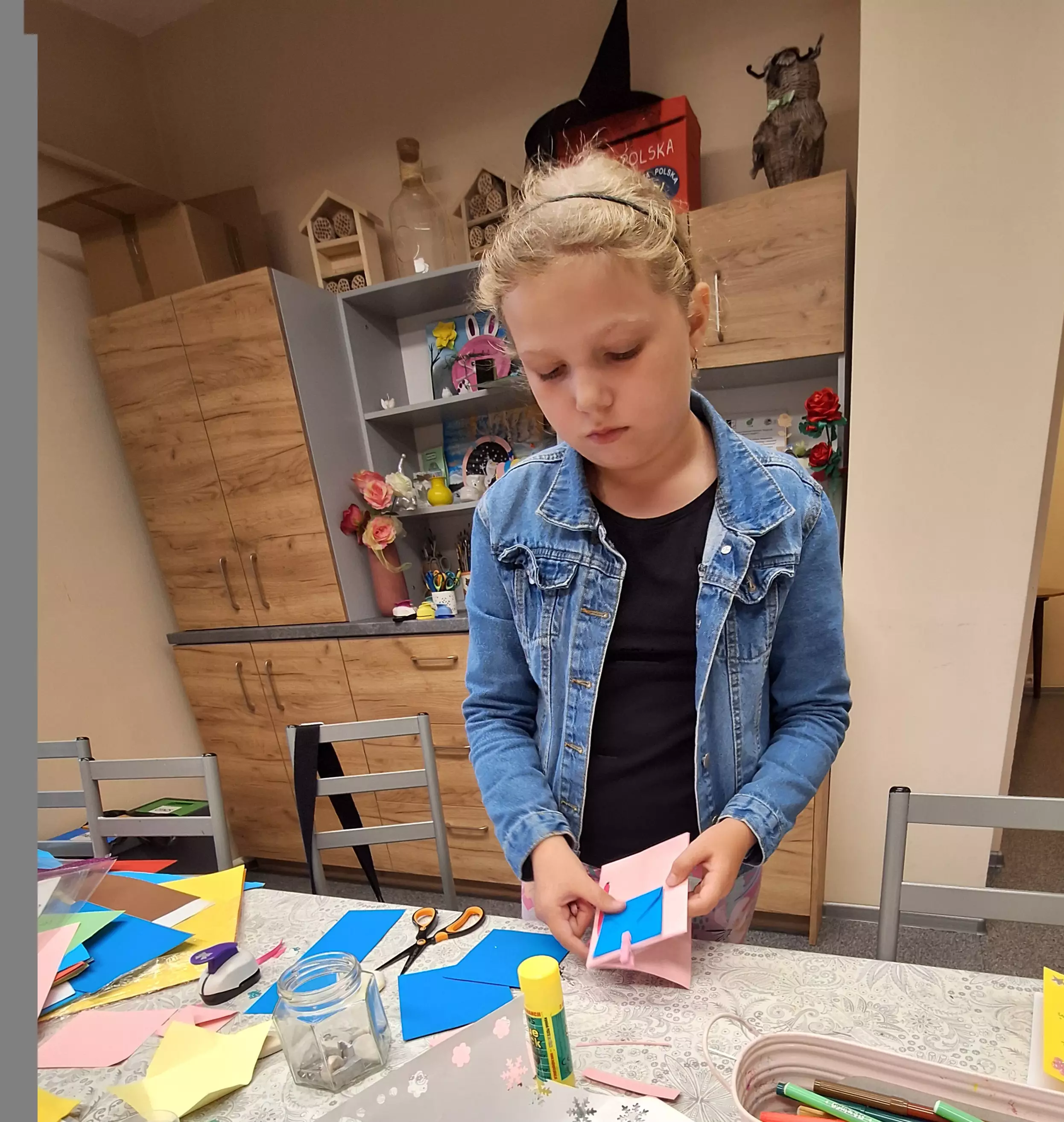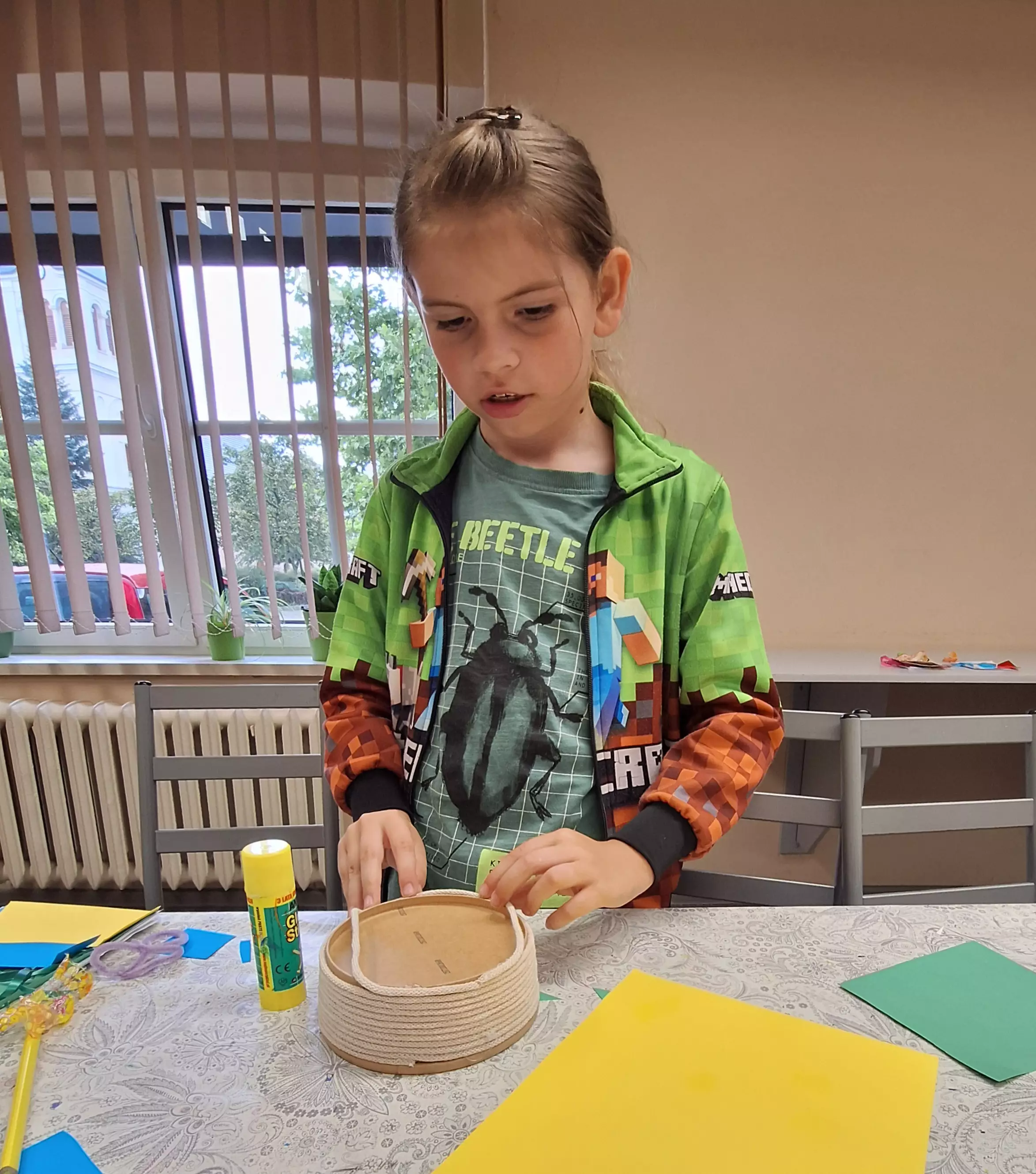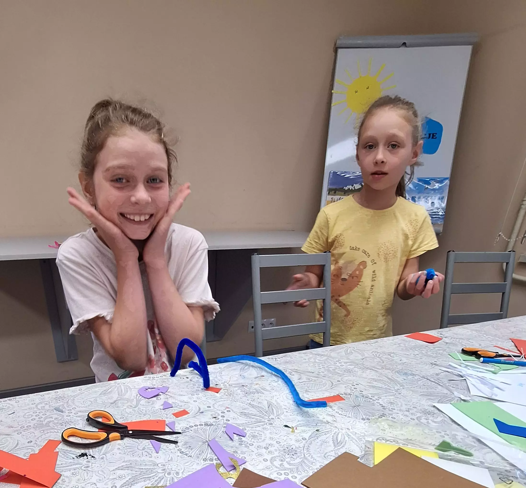 Dziewczynki wycinają motylki z papieru.Chłopczyk okleja sznurkiem koszyczek.Dziewczynka wycina serduszka z brokatowego papieru.Dziewczynka przykleja małą kopertę do swojej książeczki.Dziewczynka przykleja motylka do koszyczka. w tyle dziewczyna rozwija sznurek.Dziewczyny rozwijają sznurek.Chłopczyk wykleja w środku swój koszyczek wakacyjny.Wspólne zdjęcie dwóch dziewczynek po zajęciach w bibliotece.Wspólne zdjęcie dzieci po zajęciach.