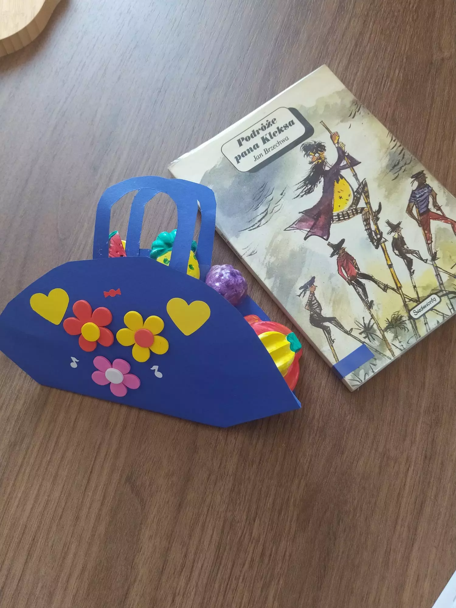 Praca plastyczna - koszyczek wykonany przez dzieci i książka.