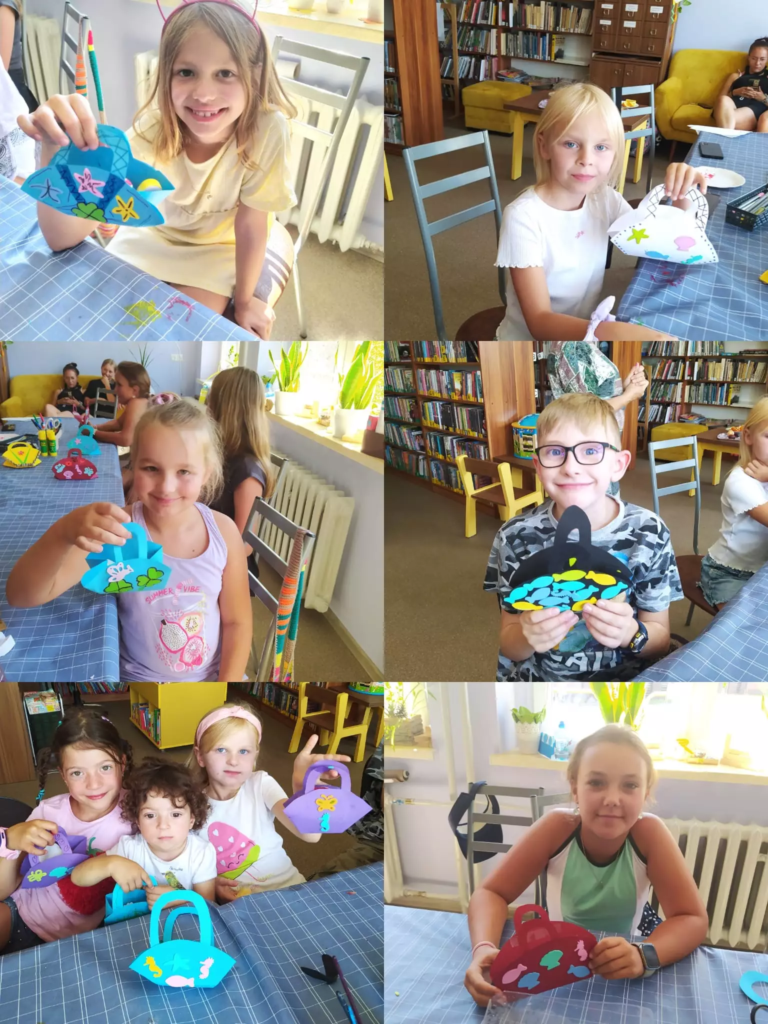 Kolaż zdjęć z zajęć bibliotecznych.Dzieci siedzą na podłodze i wykonują ćwiczenia gimnastyczne.Kolaż zdjęć z zajęć bibliotecznych.Prace plastyczne - koszyczki wykonane przez dzieci.Dzieci malują farbami owocowe figurki.Dzieci malują farbami owocowe figurki.Dzieci malują farbami owocowe figurki.Dzieci malują farbami owocowe figurki.Kolaż zdjęć z zajęć bibliotecznych.