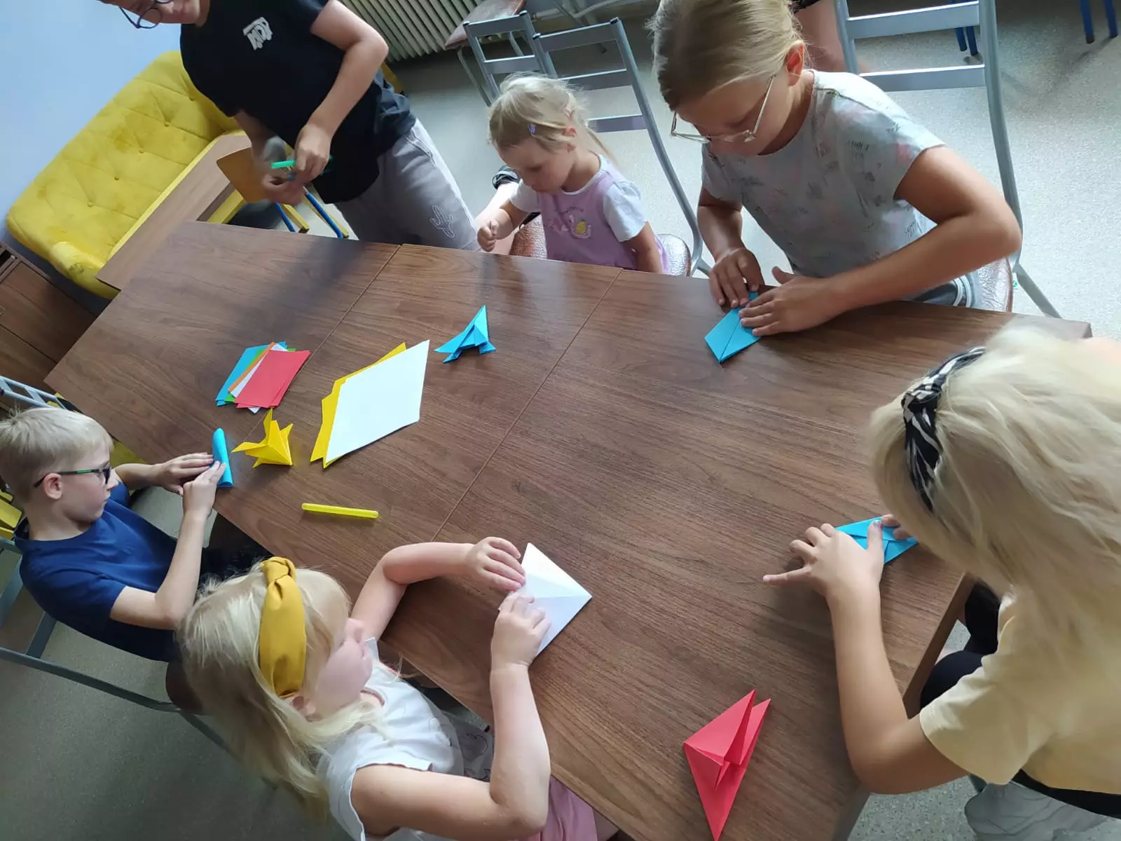 Uczestnicy zajęć składają zakładki i statki metodą origami.
