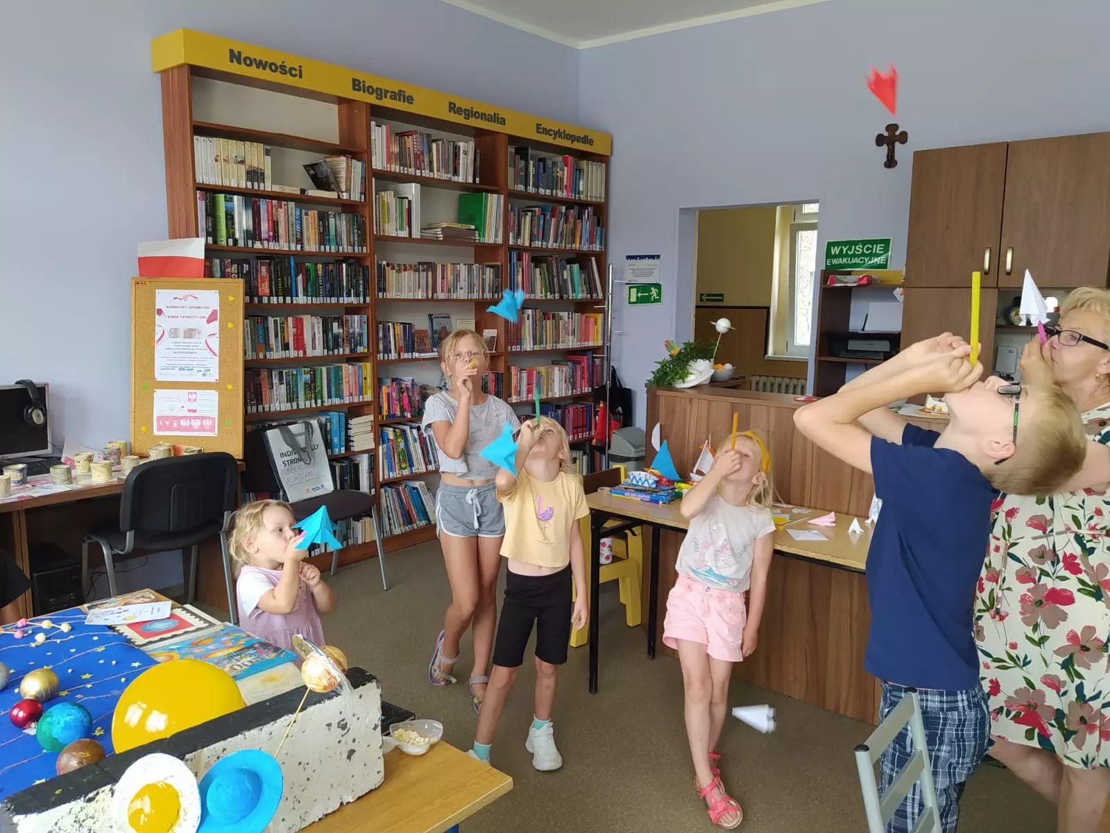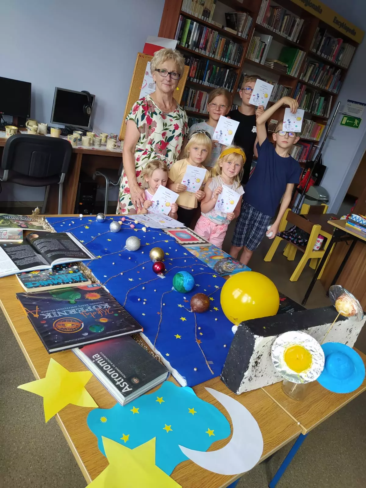 Kolejne zajęcia literacko-plastyczne w bibliotece w Gwoździanach to kontynuacja tematu o kosmosie, podczas których powstały latające rakiety metodą origami oraz zakładki do książek z Mikołajem Kopernikiem (patronem roku), świetną zabawą okazały się celne rzuty do "czarnej dziury". Wszyscy uczestnicy otrzymali dyplomy znawcy kosmosu.