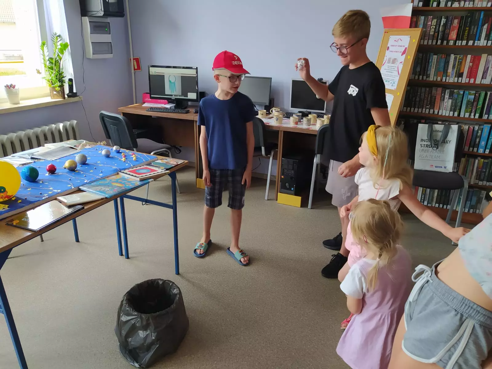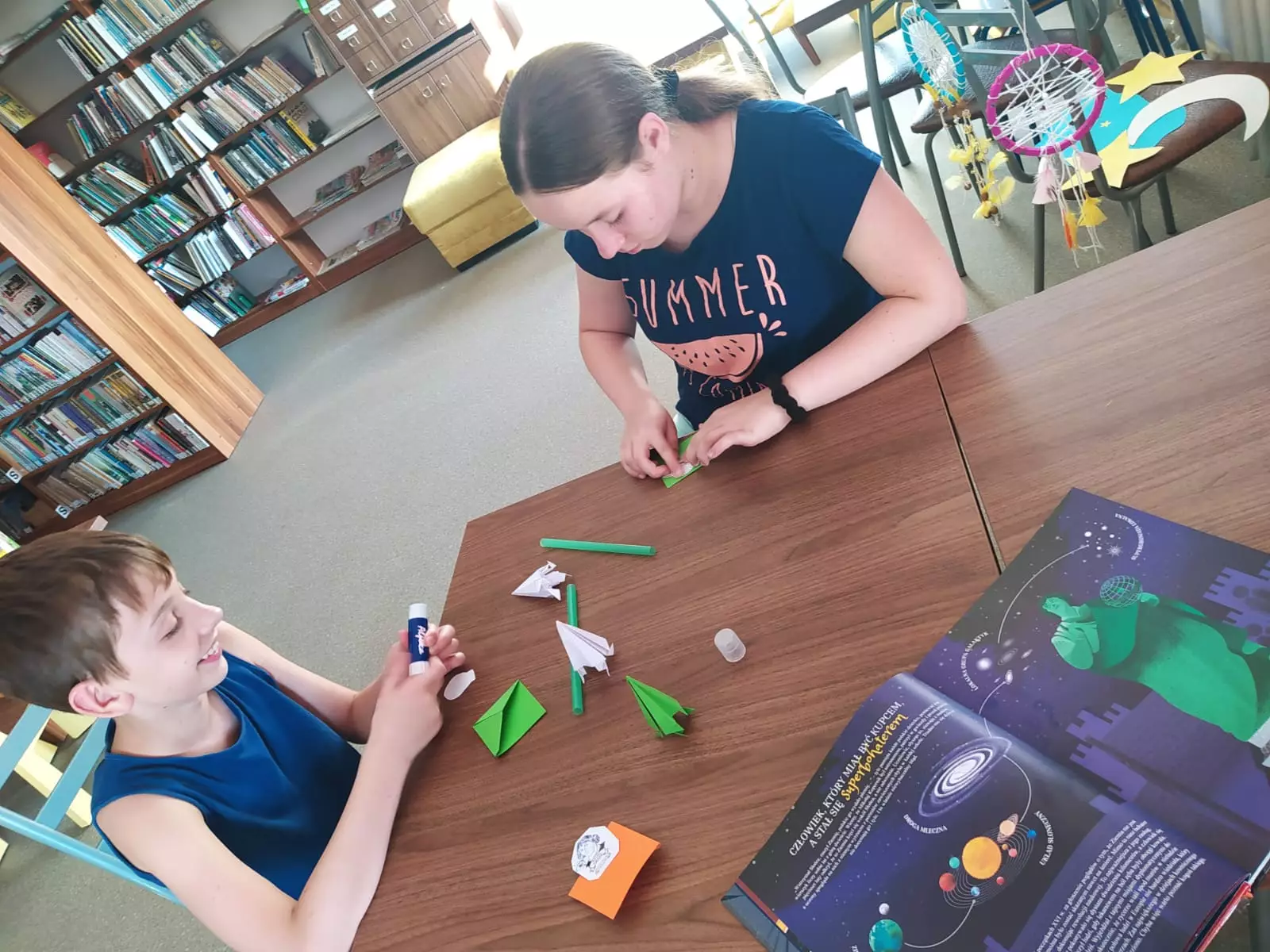 Dzieci bawią się w grę czarna dziura.Dzieci siedzą przy wspólnym stole i wykonują prace plastyczne metodą origami.Uczestnicy zajęć stoją przed makietą kosmosu, którą wykonali.Dzieci składają metodą origami latające stateczki.Dzieci dmuchają rurką stateczki kosmiczne.Dzieci wykonują kolorowe łapacze snów.Dzieci pokazują kolorowe łapacze snów, które wykonali.Zdjęcie przedstawiające prace plastyczne.