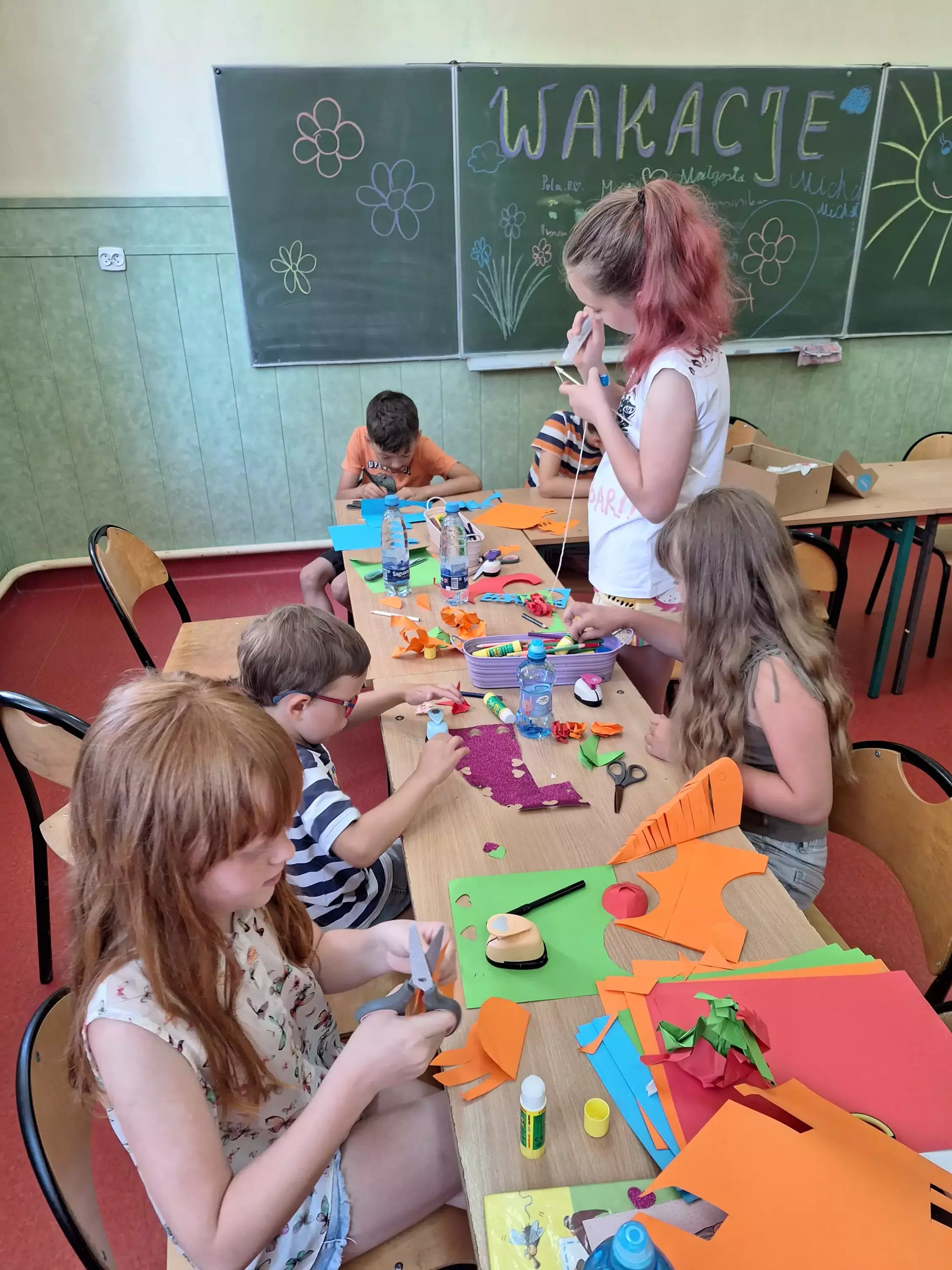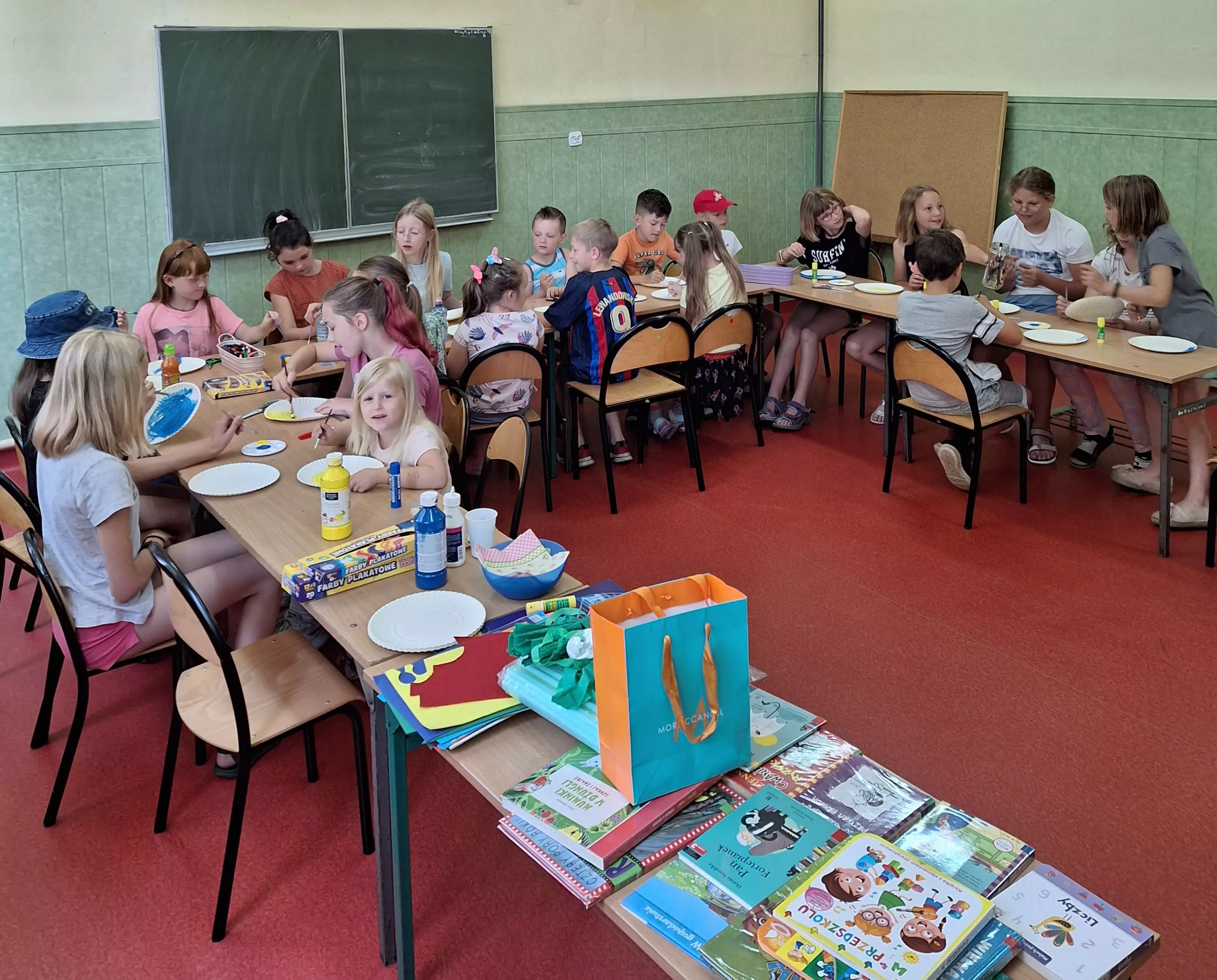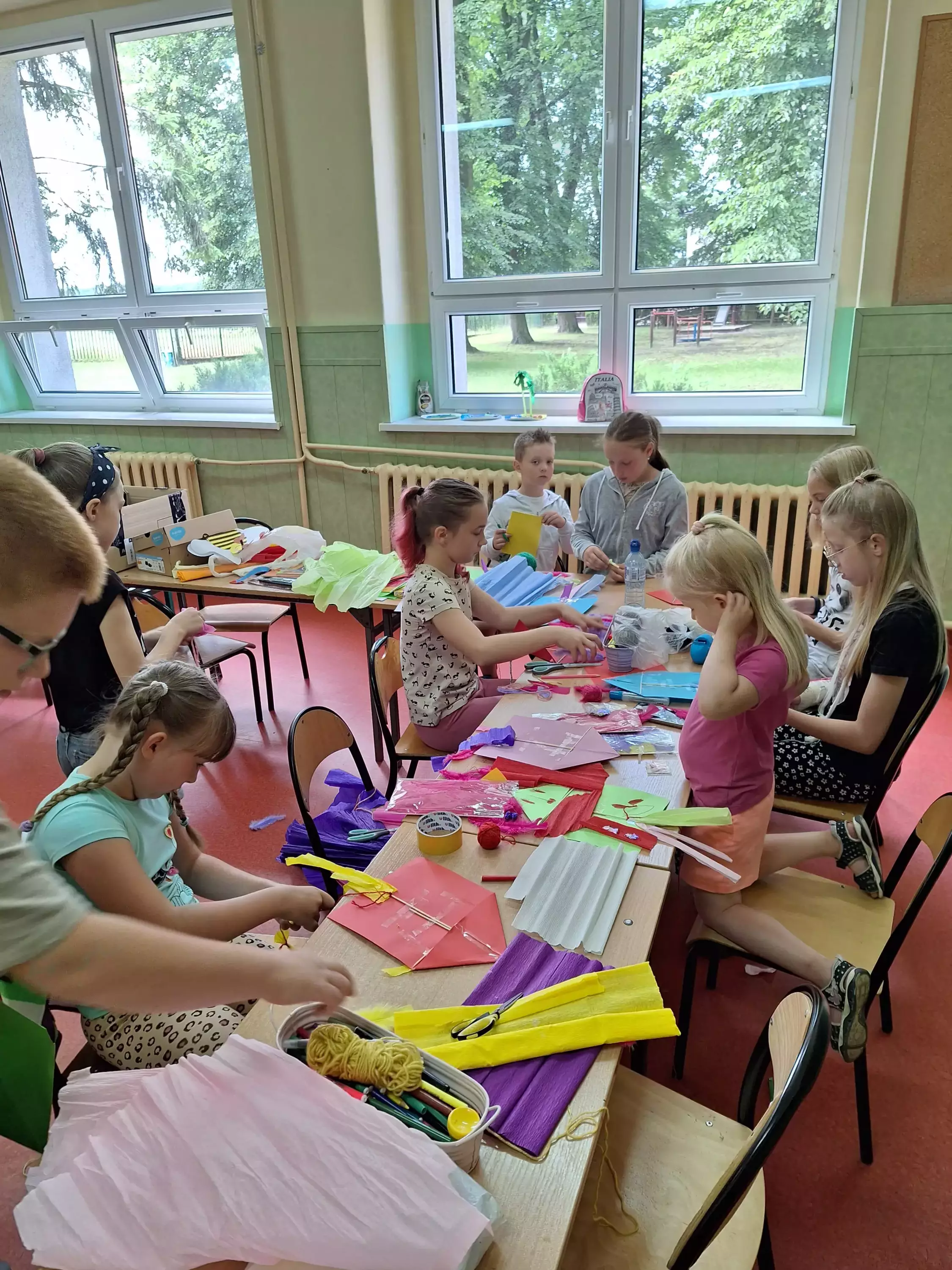 Uczestnicy na talerzykach papierowych przyklejają palmy.Dzieci siedzą przy stolikach i malują farbami talerzyki papierowe.Dzieci bawią się w zbieranie kolorowych papierków rurką plastikową.Uczestnicy zajęć sklejają latawce z kolorowego papieru.Uczestnicy zajęć kleją kolorowe latawce z papieru.Dzieci pozują do wspólnego zdjęcia trzymając latawce w rękach.Dzieci biegają po boisku i puszczają latawce.Dzieci wycinają z papieru kolorowe rybki.Dzieci łowią rybki zrobione z kolorowego papieru.Chłopcy puszczają statki wykonane z gąbki do mycia naczyń.Dziewczynki puszczają na wodę statki zrobione z gąbki do mycia naczyń.Dzieci siedzą na kocu piknikowym, jedzą chrupki i słuchają czytanej bajki.