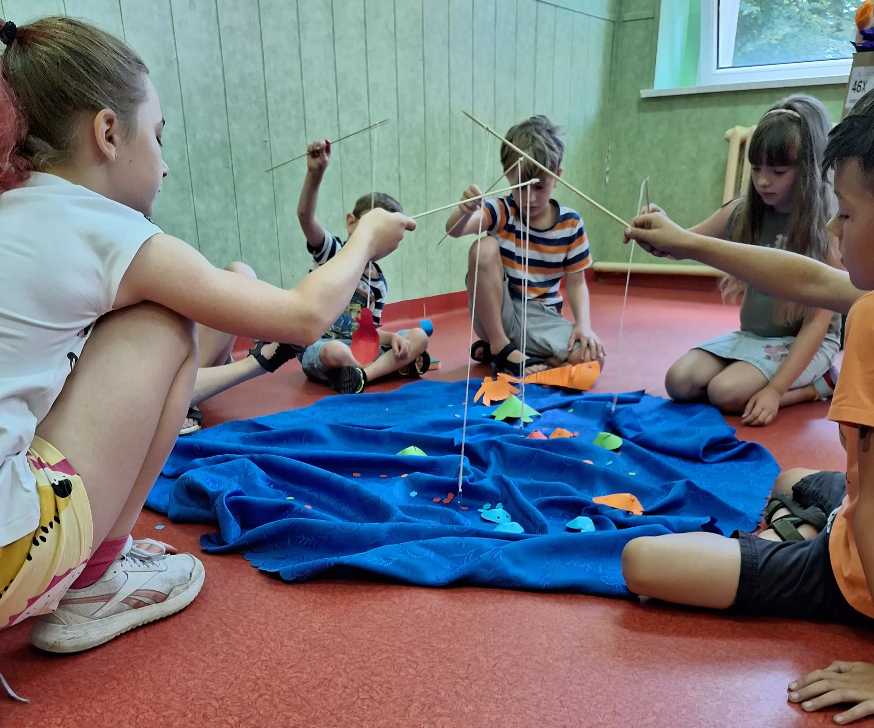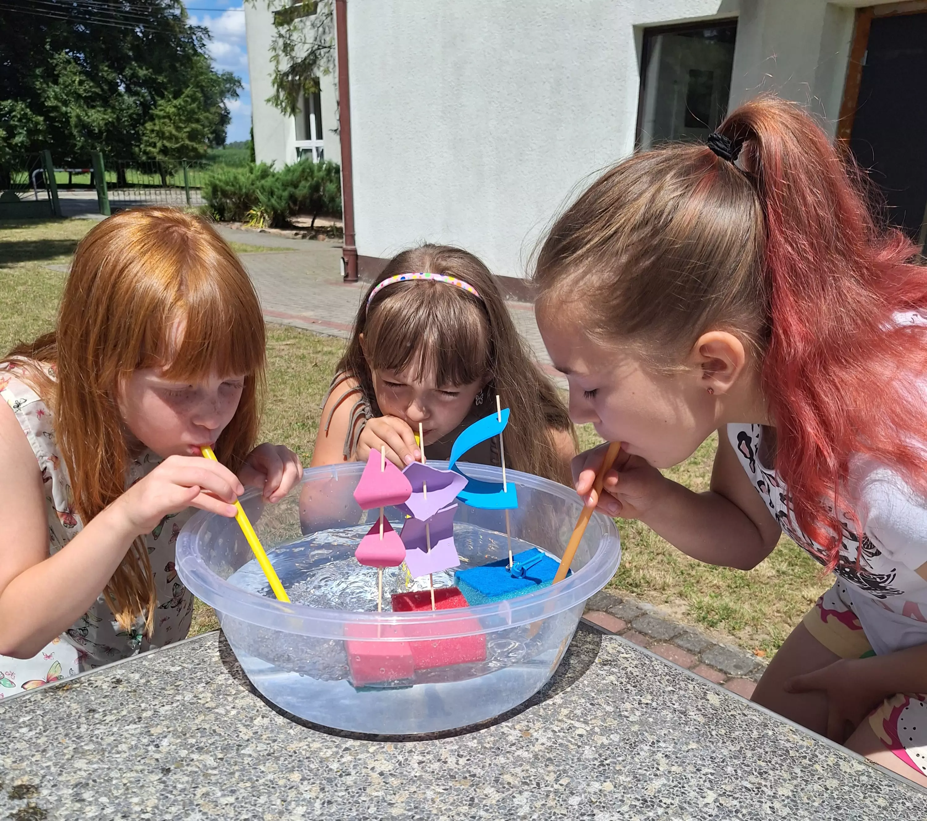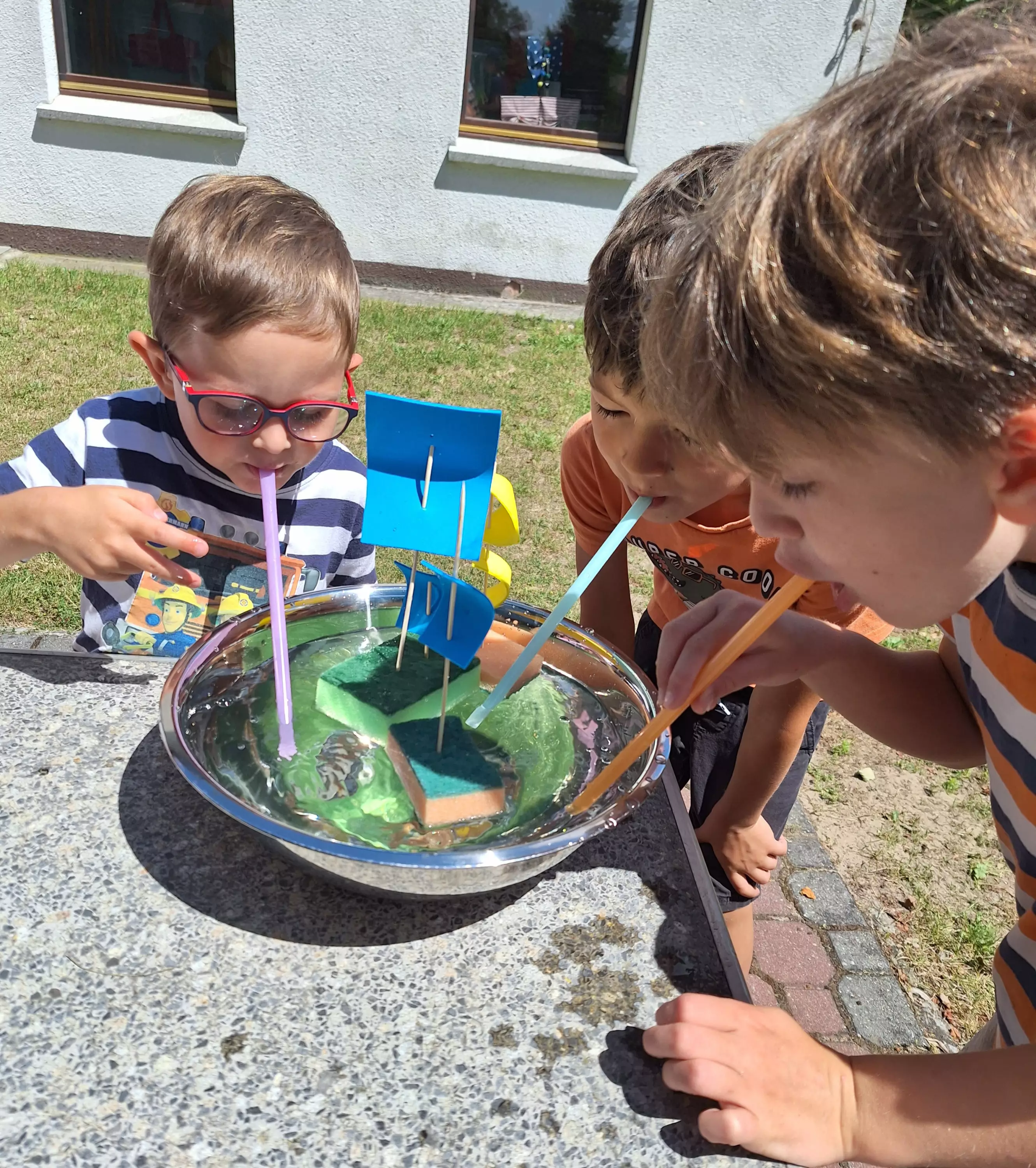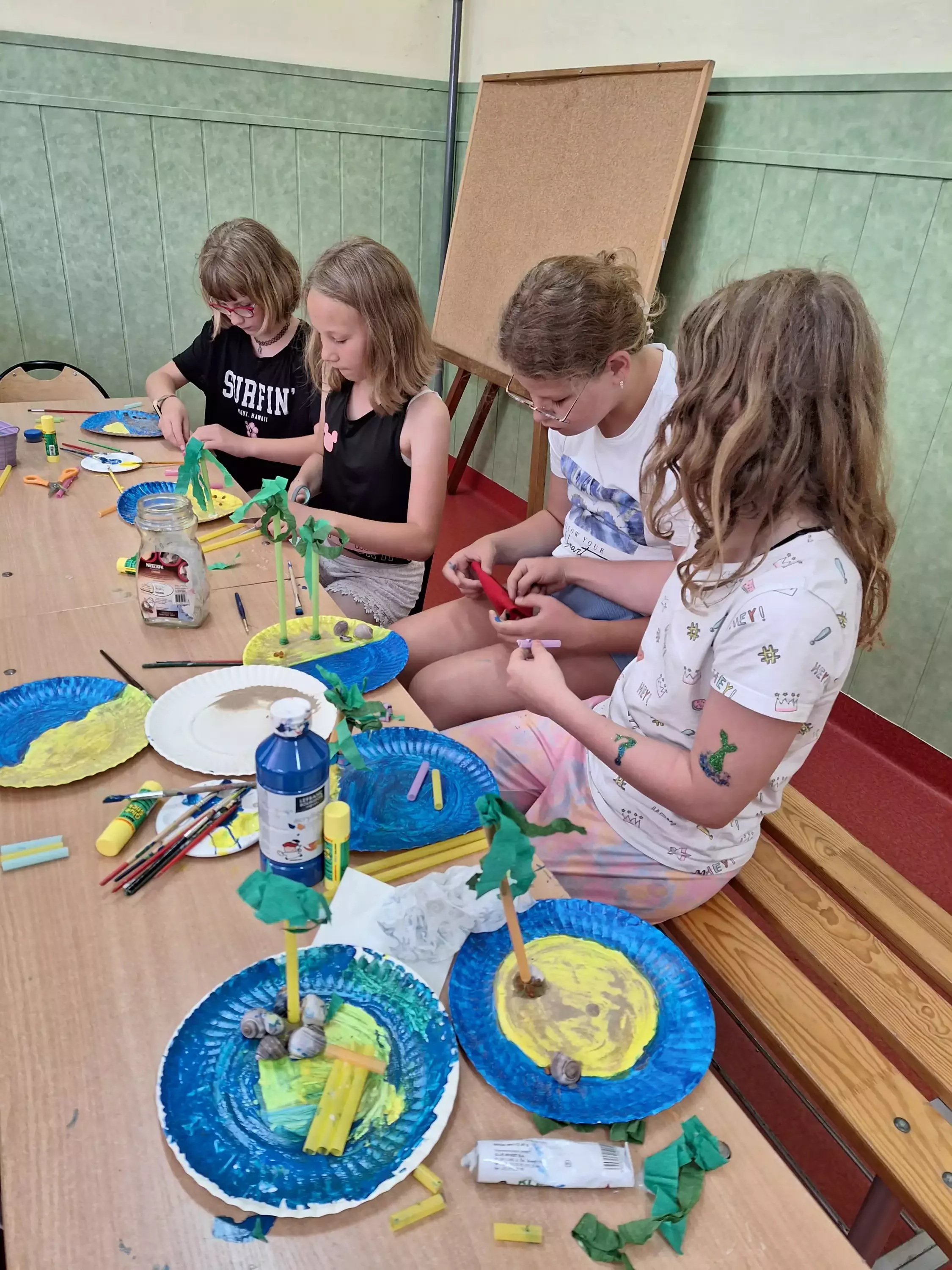 Uczestnicy na talerzykach papierowych przyklejają palmy.Dzieci siedzą przy stolikach i malują farbami talerzyki papierowe.Dzieci bawią się w zbieranie kolorowych papierków rurką plastikową.Uczestnicy zajęć sklejają latawce z kolorowego papieru.Uczestnicy zajęć kleją kolorowe latawce z papieru.Dzieci pozują do wspólnego zdjęcia trzymając latawce w rękach.Dzieci biegają po boisku i puszczają latawce.Dzieci wycinają z papieru kolorowe rybki.Dzieci łowią rybki zrobione z kolorowego papieru.Chłopcy puszczają statki wykonane z gąbki do mycia naczyń.Dziewczynki puszczają na wodę statki zrobione z gąbki do mycia naczyń.Dzieci siedzą na kocu piknikowym, jedzą chrupki i słuchają czytanej bajki.
