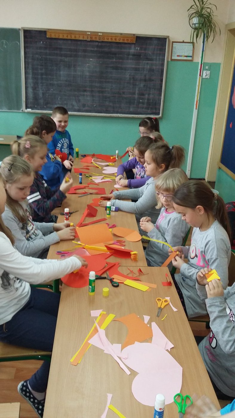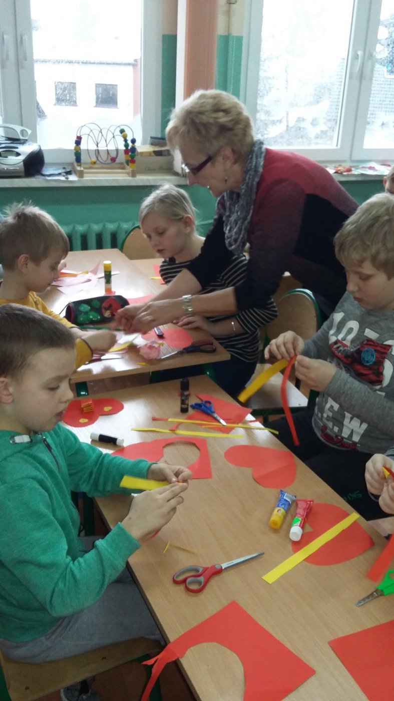 Następnie uczniowie wykonali z kolorowego papieru walentynkowe serduszka z których byli ogromnie zadowoleni.