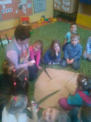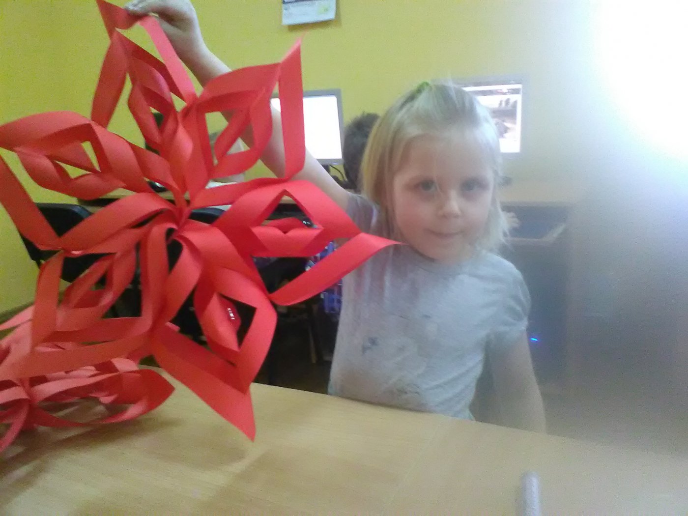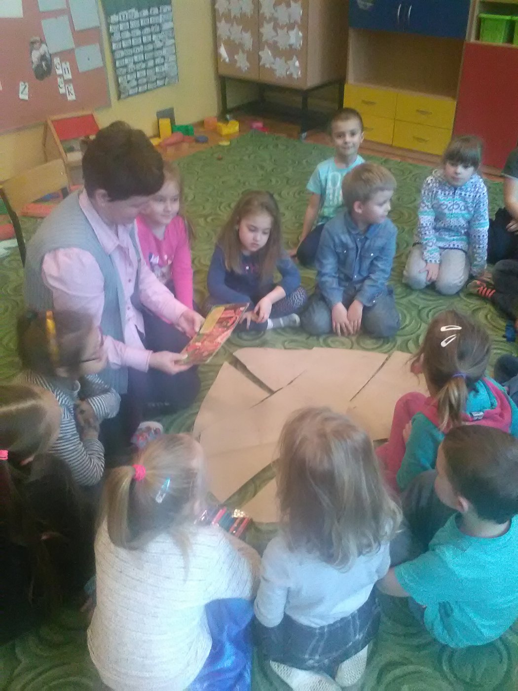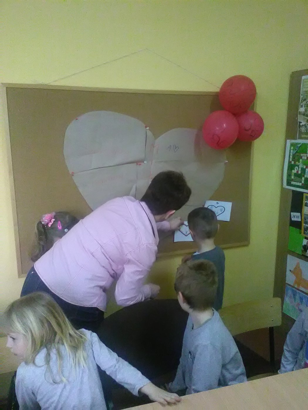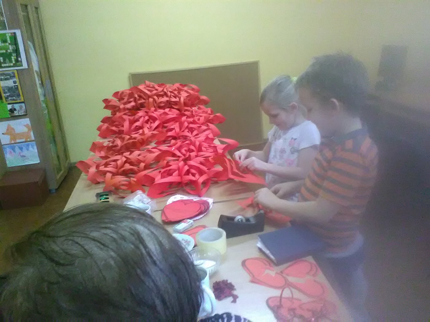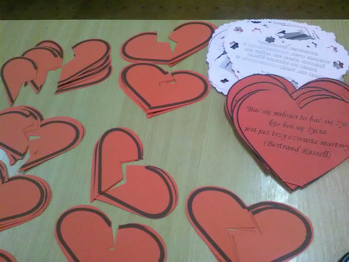 Z okazji Święta Zakochanych Pani Jola przeprowadziła lekcję biblioteczna dla najmłodszych w przedszkolu. Po wysłuchaniu przeczytanej przez bibliotekarkę baśni o parze rodzeństwa pt.” Jaś i Małgosia” dzieci z kawałków papieru ułożyły serce. Następnie umieściły na nim cechy prawdziwej miłości i przyjaźni. Przedszkolaki pokolorowały też walentynkowe serca, które później przyniosły do biblioteki. Starsze dzieci już przed walentynkami brały udział w zajęciach plastycznych, wykonały czerwone gwiazdy, które były piękną ozdobą sali podczas walentynkowej zabawy dla dorosłych.