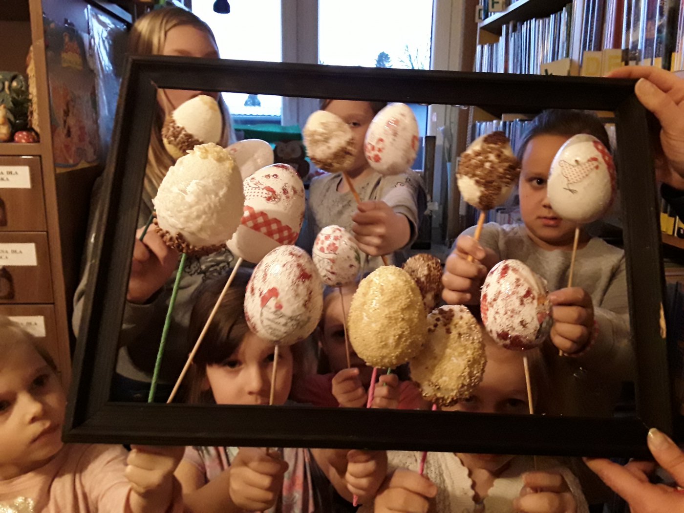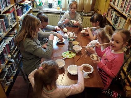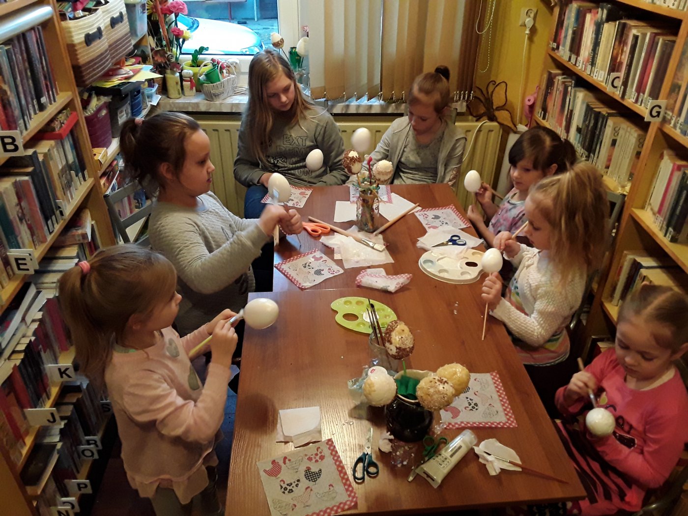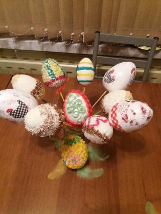 Młodzież ozdabiała styropianowe jajka metodą quillingu. Dzieci jako ozdoby wykorzystały wszelkiego rodzaju kasze oraz wielkanocne motywy z serwetek stosując metodę decoupage. Dorośli wykonali swoje dzieła także stosując technikę decoupagu. Uczenie się nowych sposobów ozdabiania jajek sprawiło wszystkim uczestnikom zajęć wiele frajdy, a wykonanymi pracami mogli pochwalić się także w swoich domach.