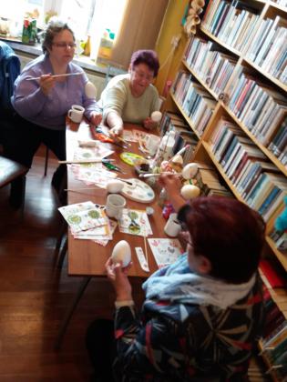 W bibliotece w Gwoździanach w okresie przedświątecznym odbył się cykl warsztatów zdobienia pisanek różnymi metodami. Zajęcia prowadziła bibliotekarka Jadwiga Kukowka.