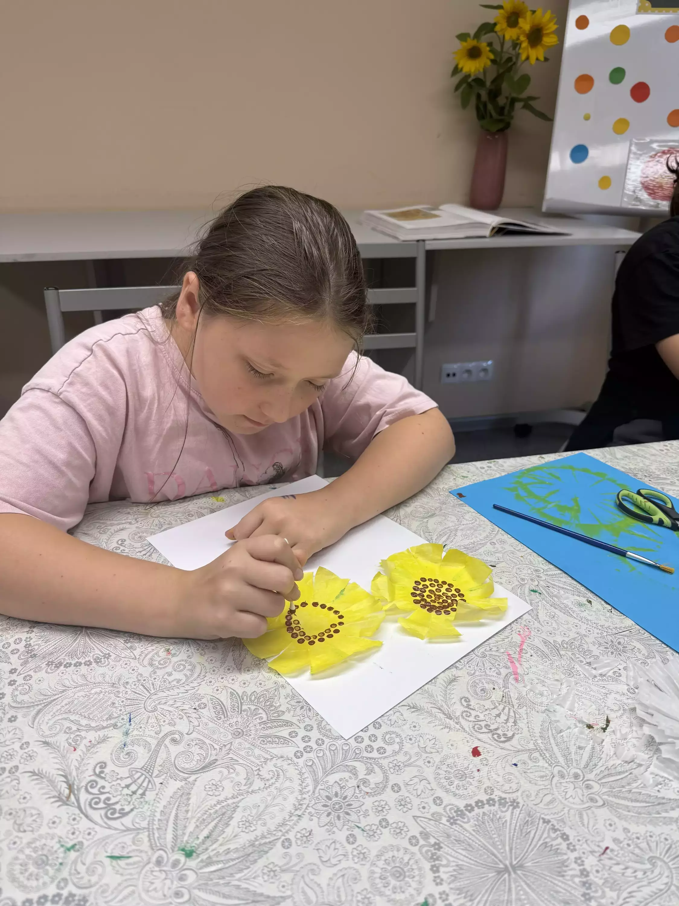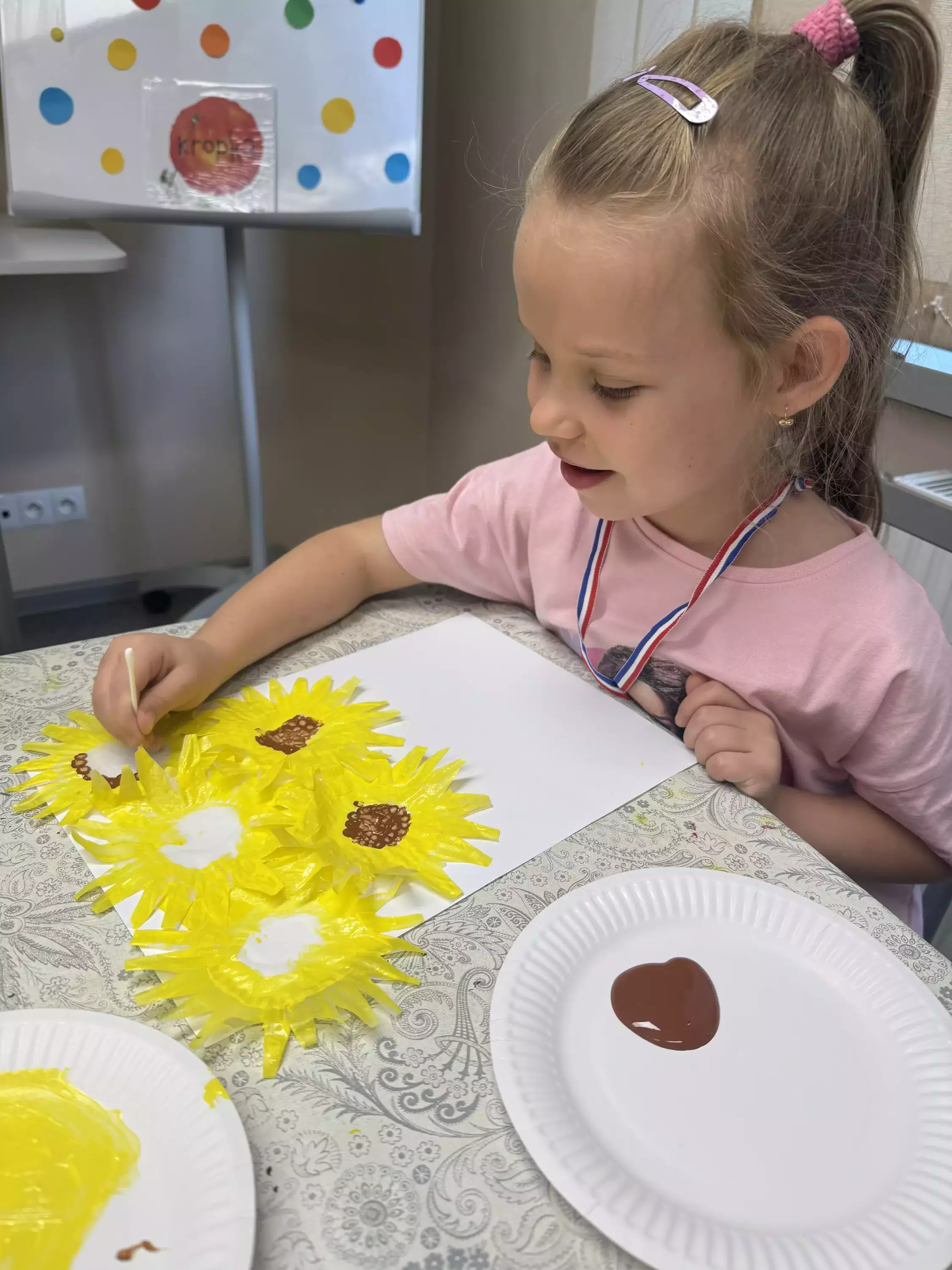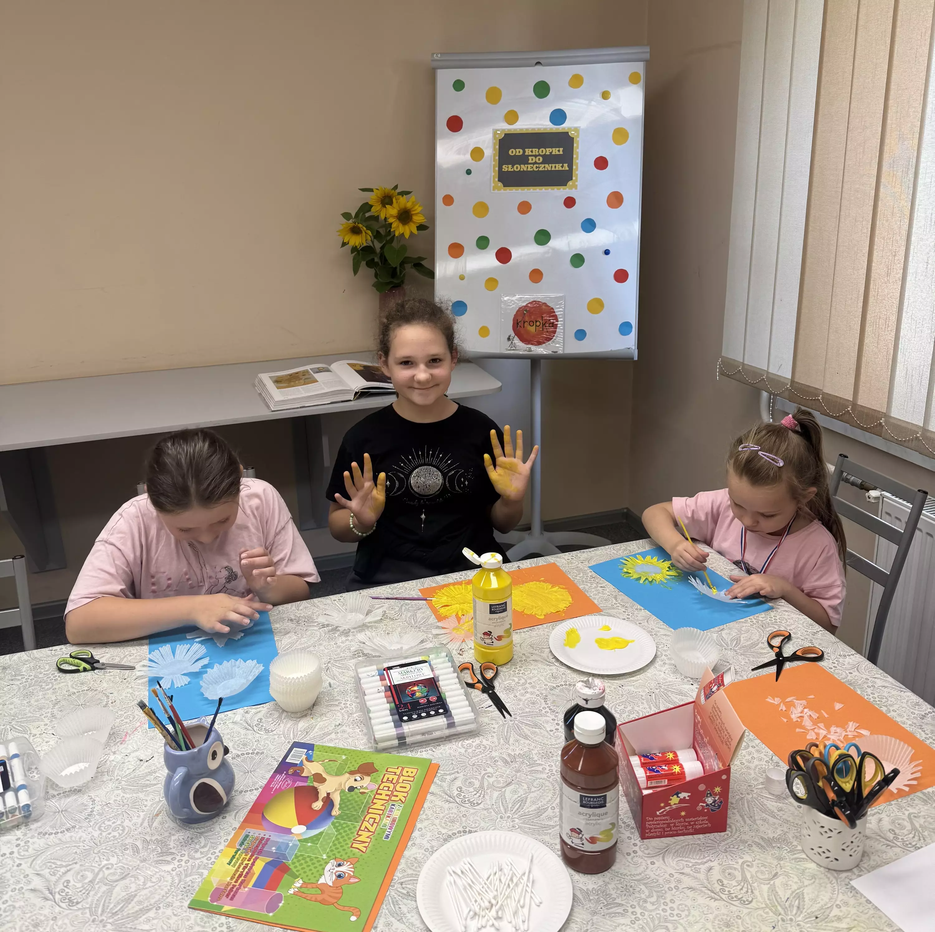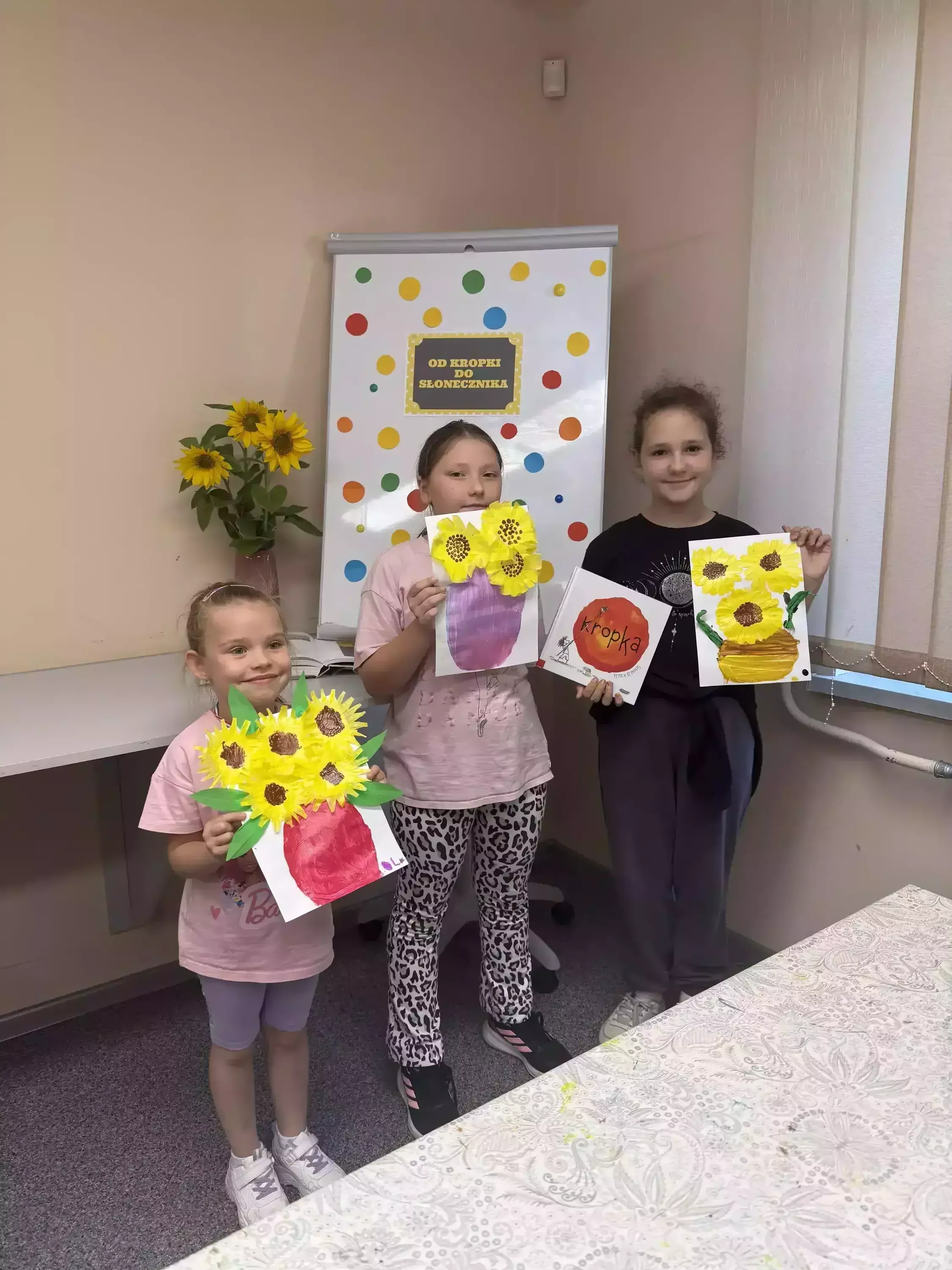 Dzieci poznają książkę Kropka Petera H. Reynoldsa, inspirują się obrazem Słoneczniki Vincenta van Gogha i tworzą własne prace plastyczne: słoneczniki z kropki, papilotek i farb. Wesoła, kolorowa atmosfera zajęć.