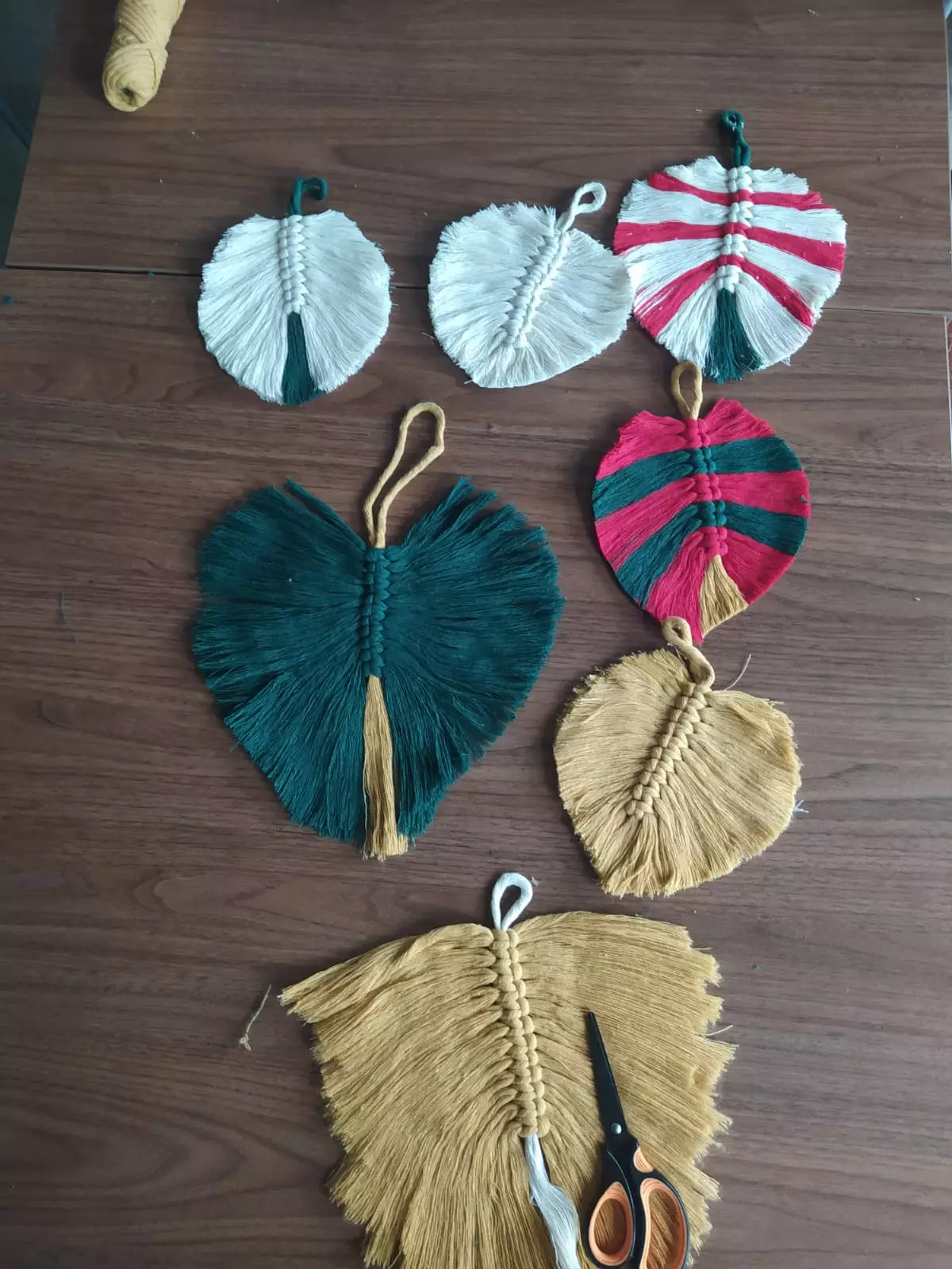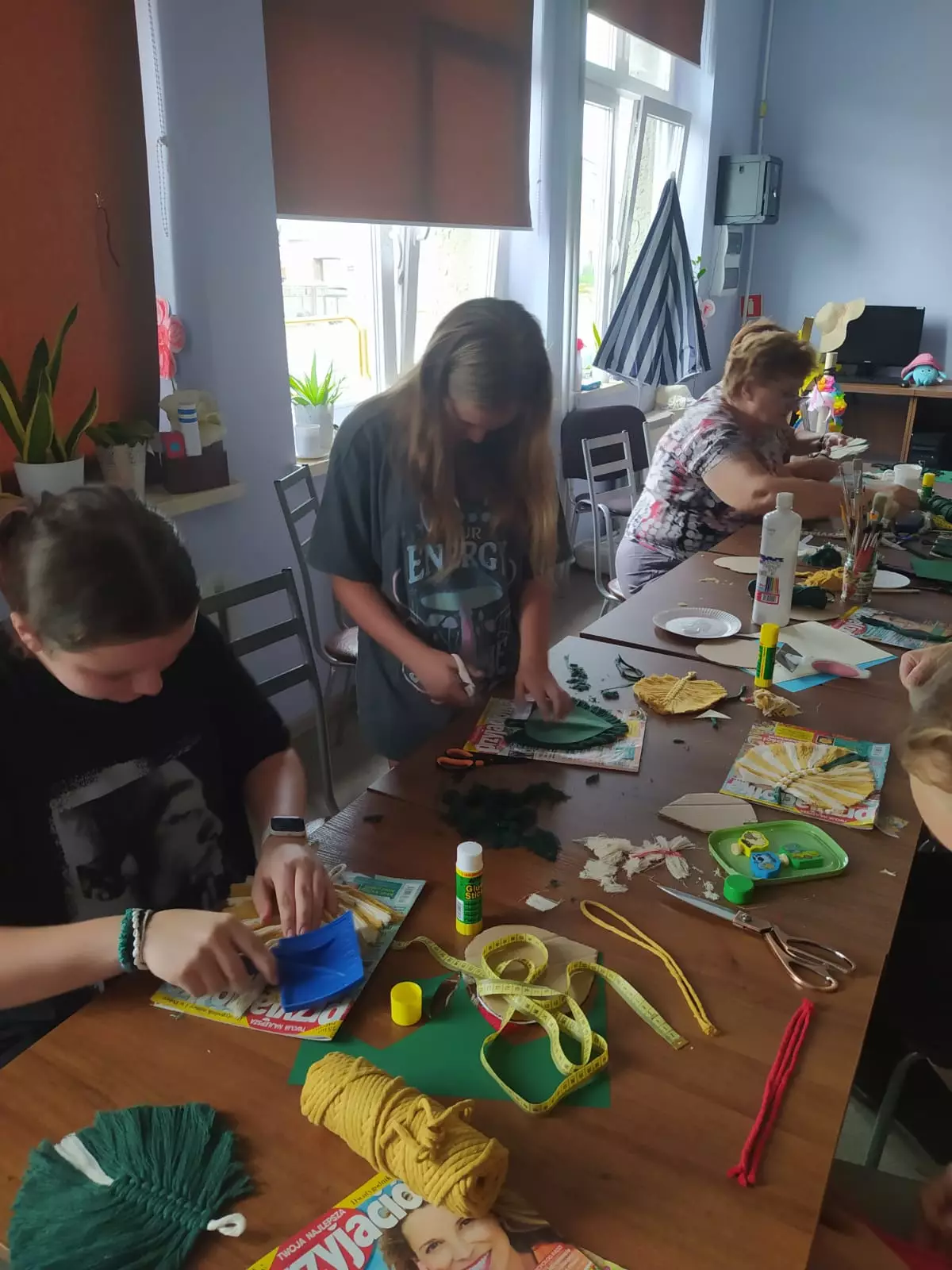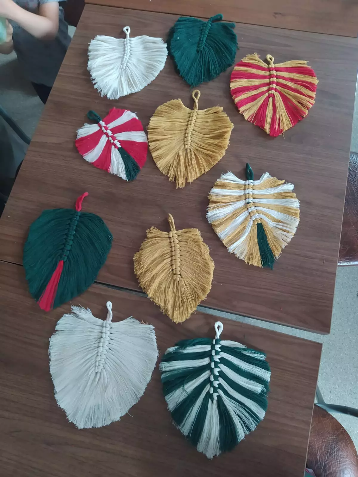 Kolaż zdjęć z warsztatów makramowych.Listki wykonane ze sznurka techniką makramy.Listki wykonane ze sznurka techniką makramyUczestnicy warsztatów siedzą przy stole i wyczesują szczotką wełniane sznurki.Listki wykonane ze sznurka techniką makramyUczestniczki przyklejają listki do tekturki.Uczestniczki wycinają sznurki, wyczesują oraz przyklejają listki do tekturki.Uczestniczki wycinają sznurki, wyczesują oraz przyklejają listki do tekturki.Uczestniczki wycinają sznurki, wyczesują oraz przyklejają listki do tekturki.