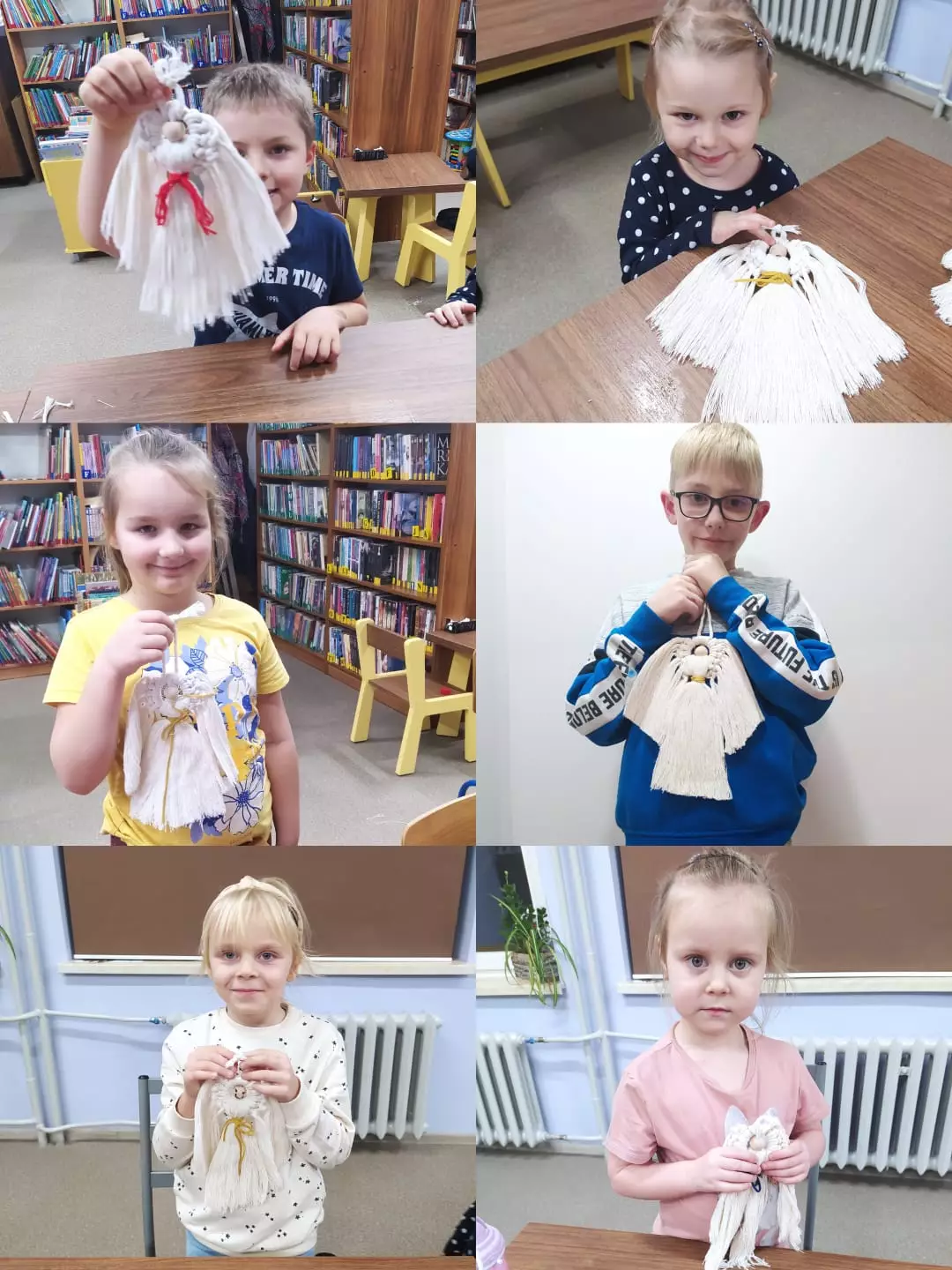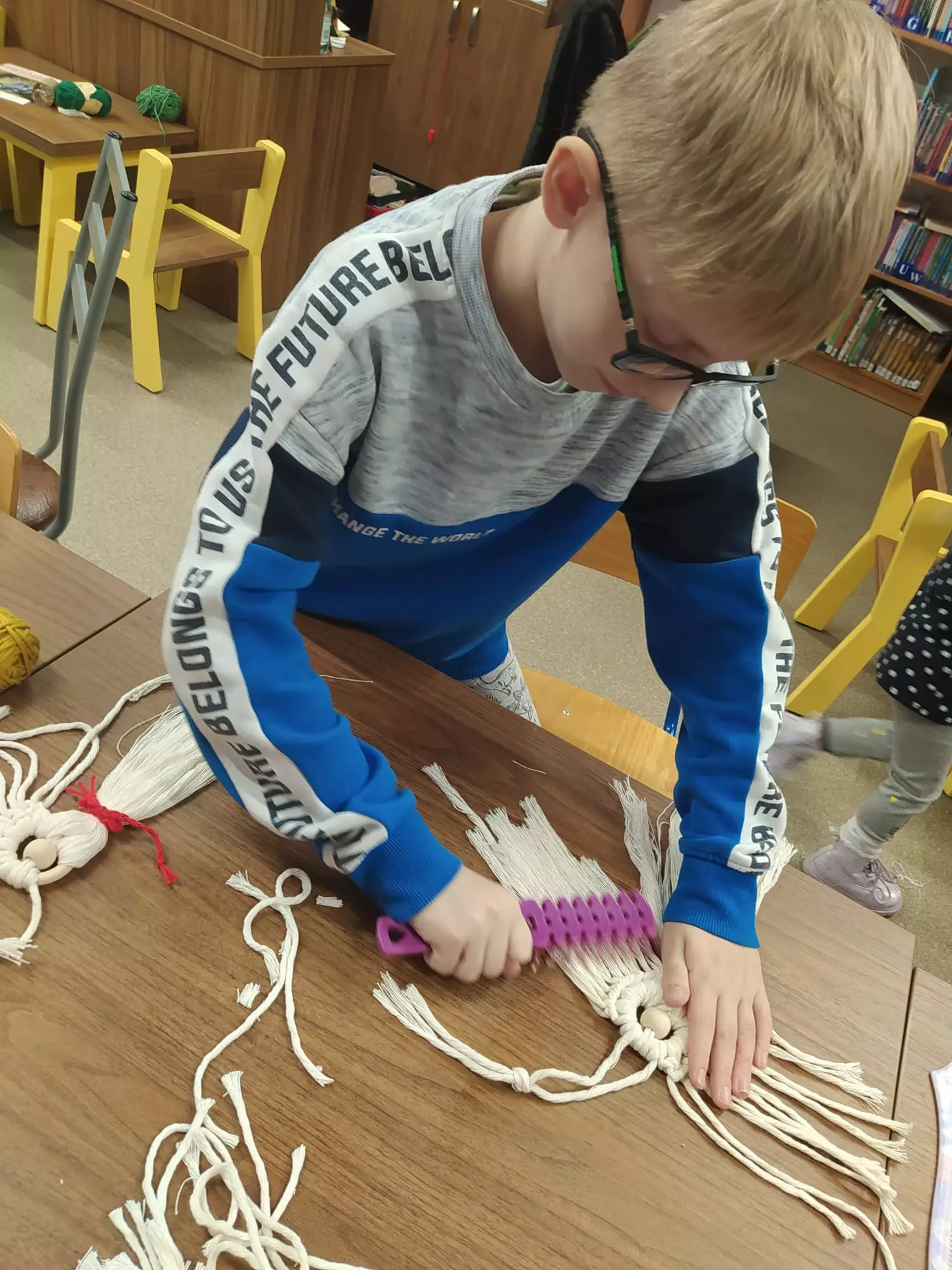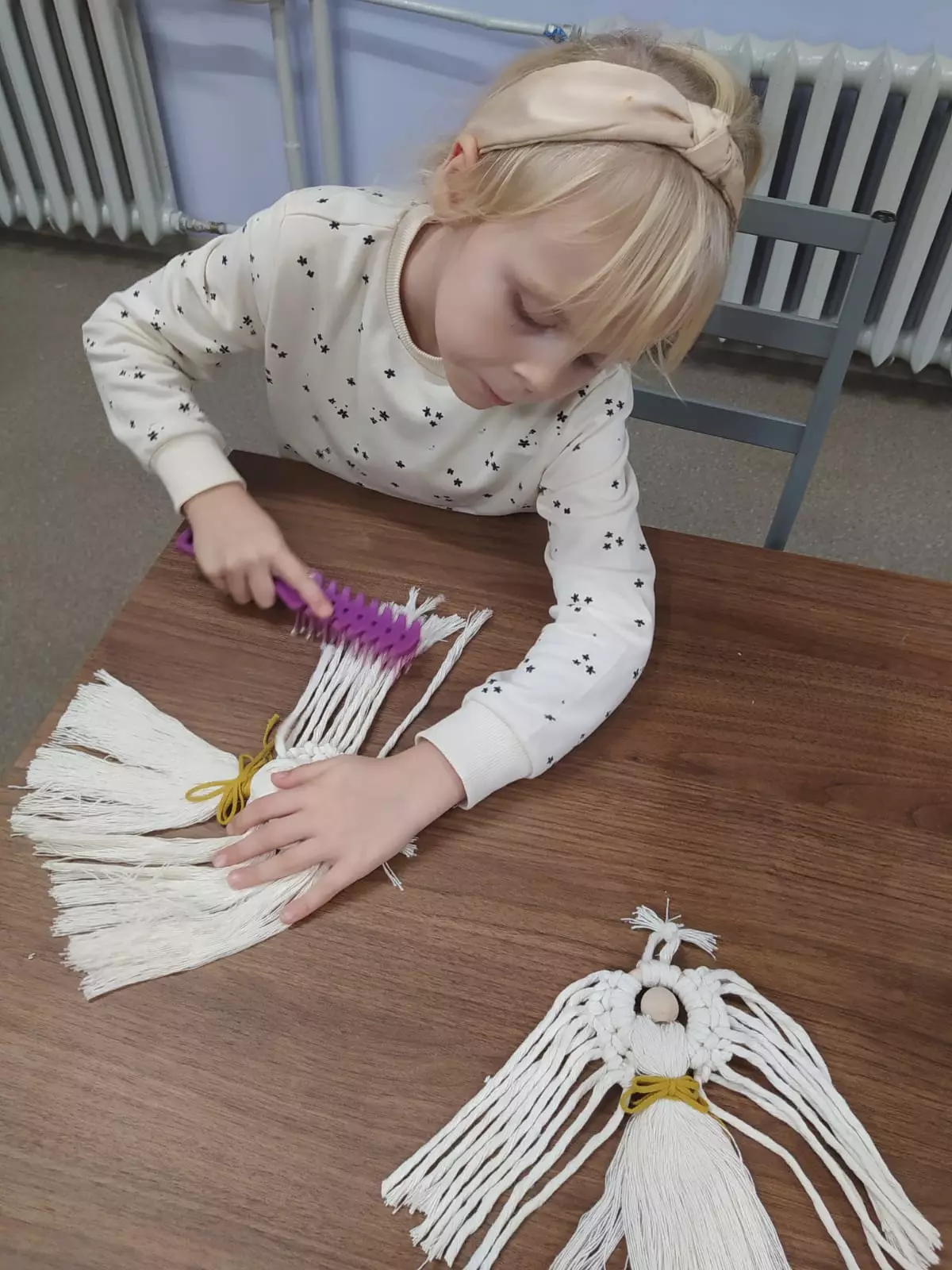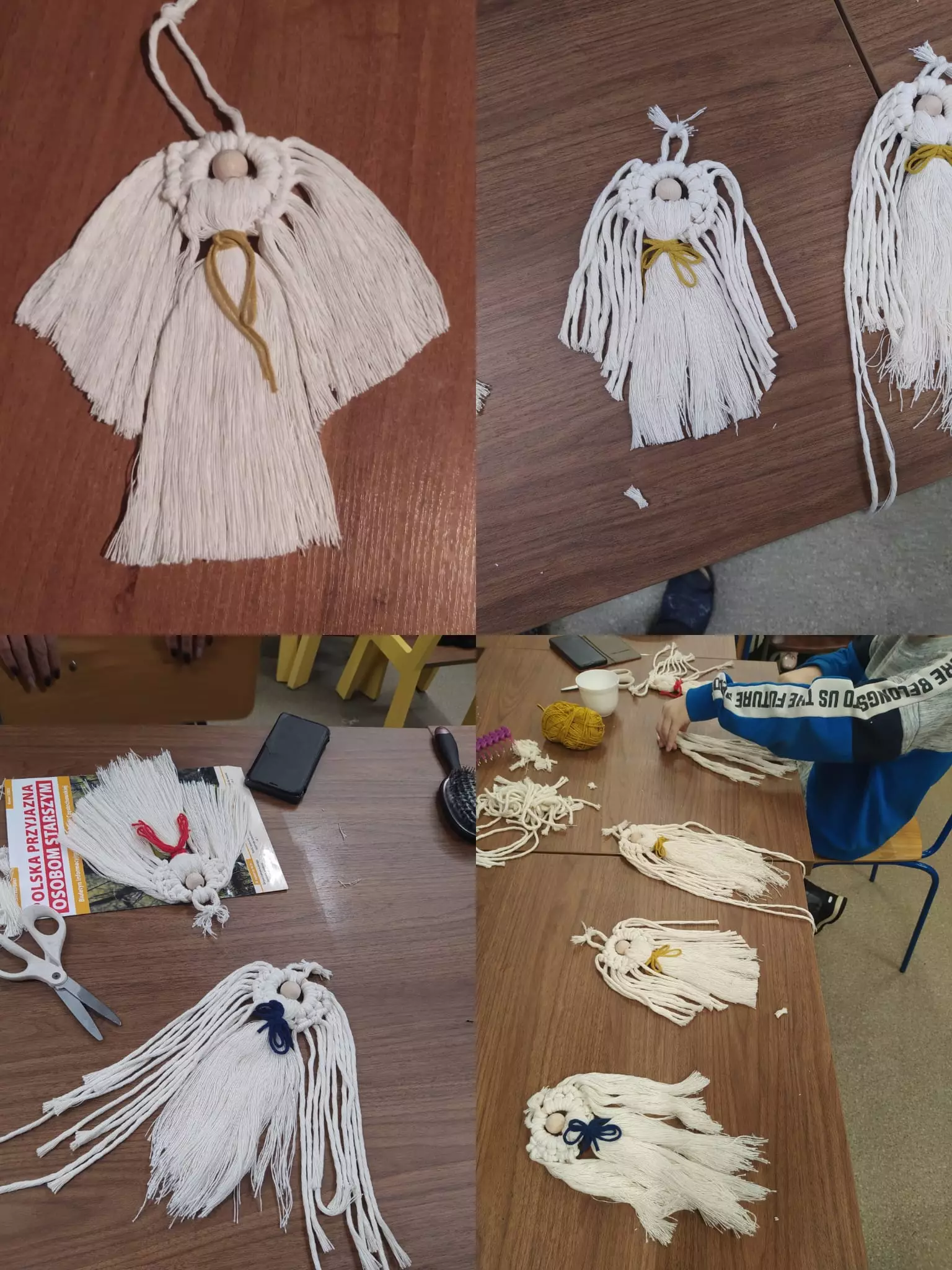 Dziewczynka wyczesuje wełnę tworząc makramowego aniołka.Makramowy aniołek.Chłopak wyczesuje wełnę tworząc aniołka z makramy.Uczestnicy tworzą aniołki metodą makramy.Uczestnicy wykonują aniołki ze sznurka.Uczestnicy wykonują aniołki ze sznurka.Uczestnicy wykonują aniołki ze sznurka.Uczestnicy zajęć wykonują aniołki ze sznurka.Kolaż zdjęć po zajęciach w bibliotece.