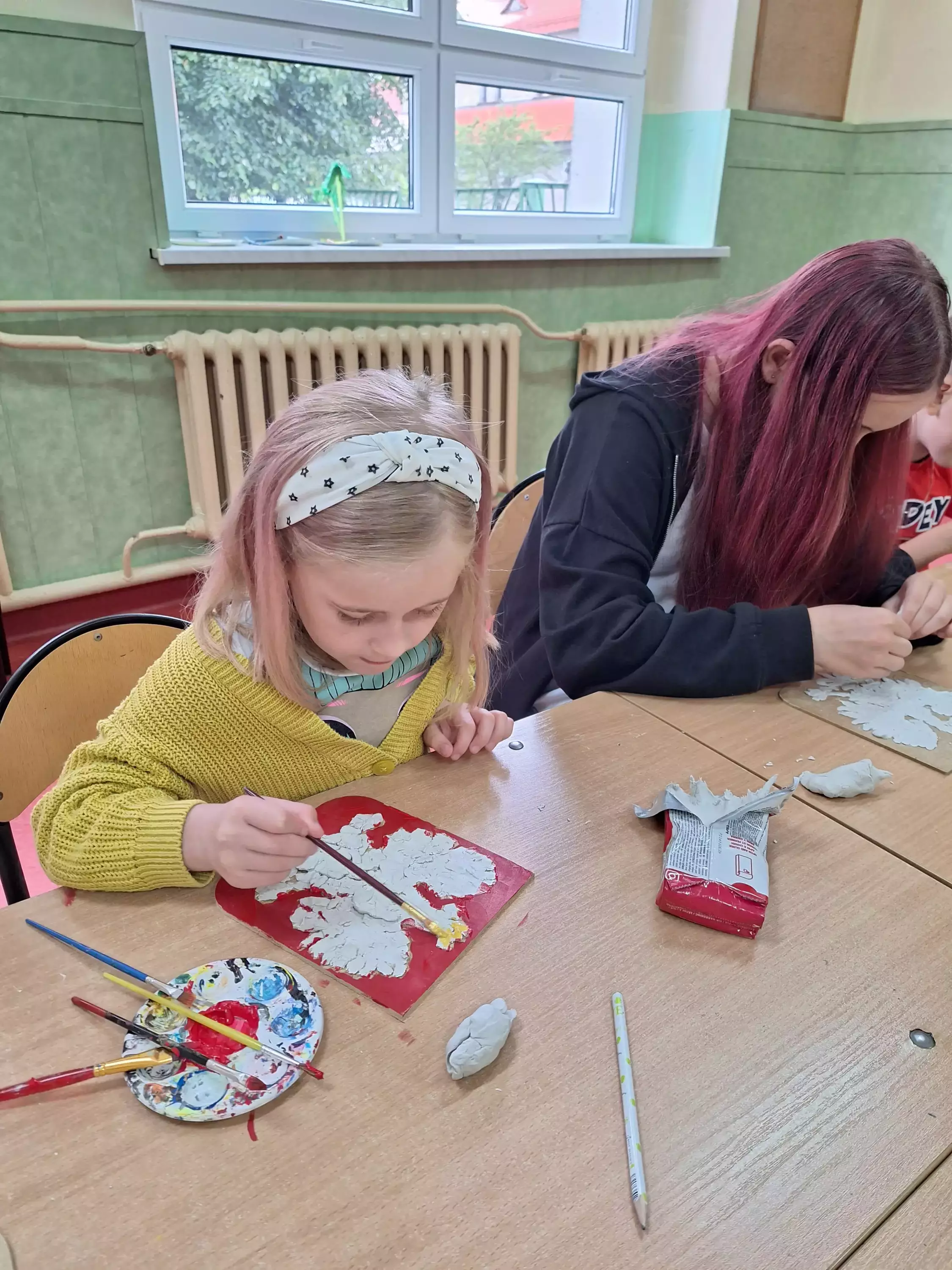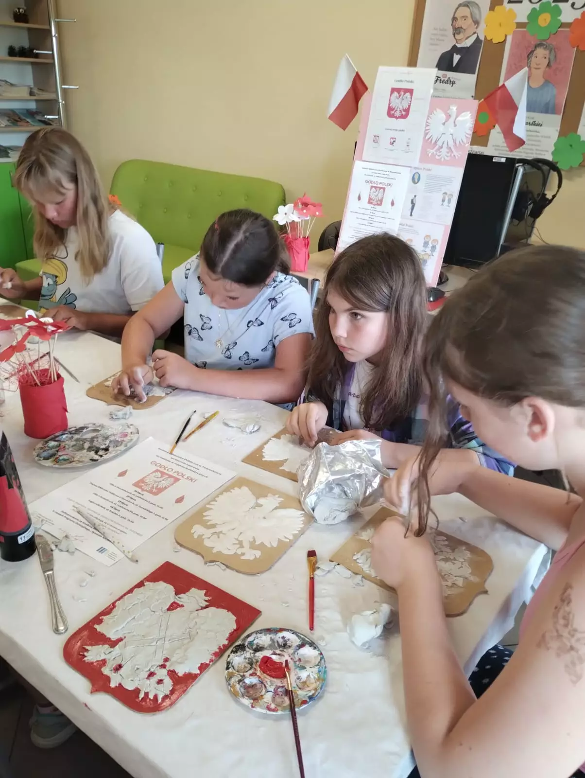 Dziewczyny malują farbami godło Polski.Zdjęcie grupowe po zajęciach plastycznych.Uczestnicy spotkania malują farbami godło Polski.Zdjęcie grupowe po zajęciach plastycznych.Uczestnicy zajęć malują farbami godło Polski.Dziewczyny siedzą przy stole i malują farbami godło Polski.Uczestnicy zajęć wyklejają masą plastyczną orła.Uczestnicy warsztatów wyklejają masą plastyczną godło Polski.Uczestnicy zajęć patriotycznych wyklejają masą modelarską orzełka.Wspólne zdjęcie po warsztatach plastycznych.Gazetka.