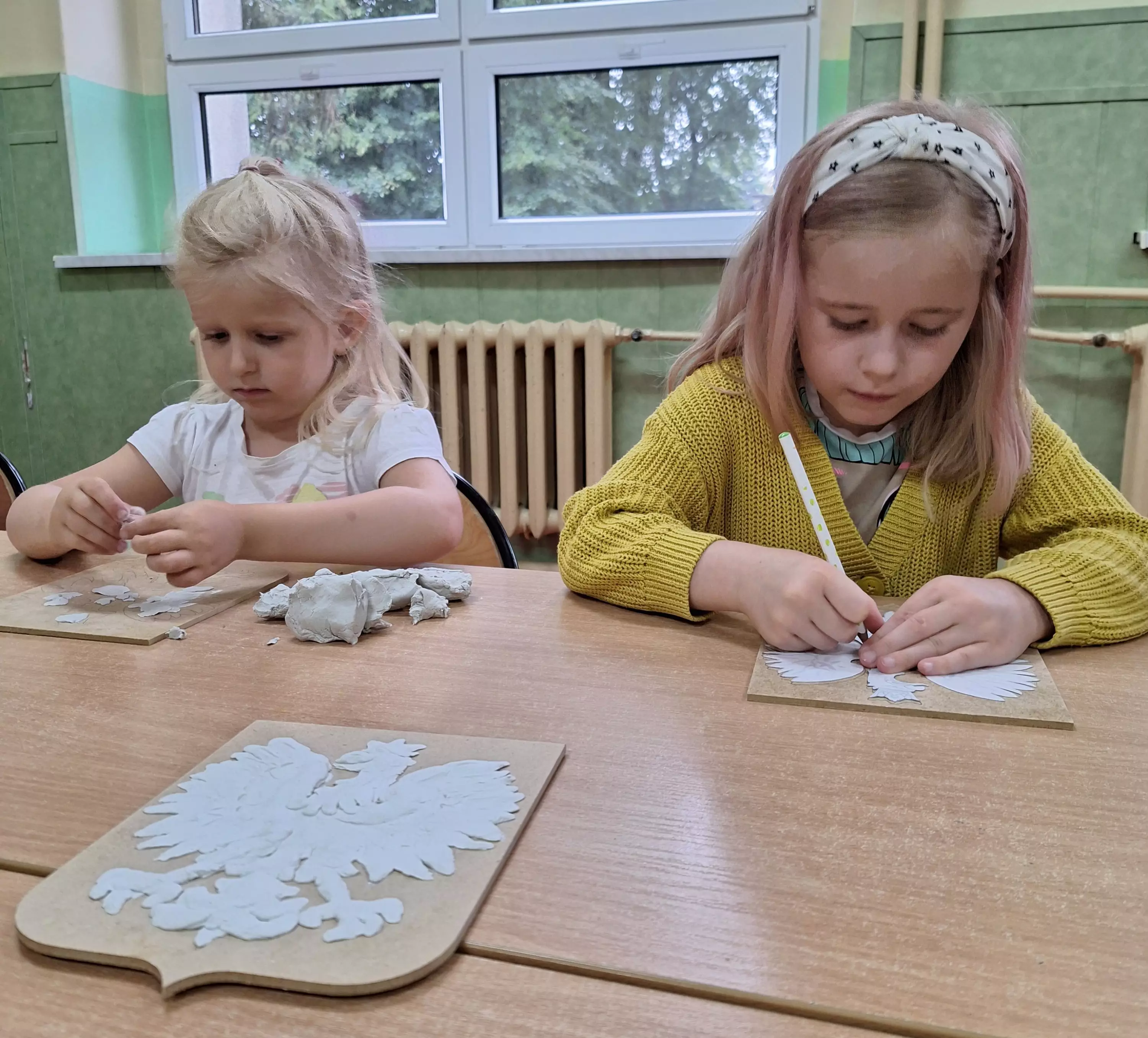 Dzieci siedzą przy stole i wyklejają masą plastyczną postać orła.Dziewczynki siedzą przy stole i wykonują godło polski.Wspólne zdjęcie po zajęciach plastycznych.Dziewczynki wyklejają z masy modelarskiej postać orła białego.Uczestnicy warsztatów plastycznych wyklejają godło Polski.