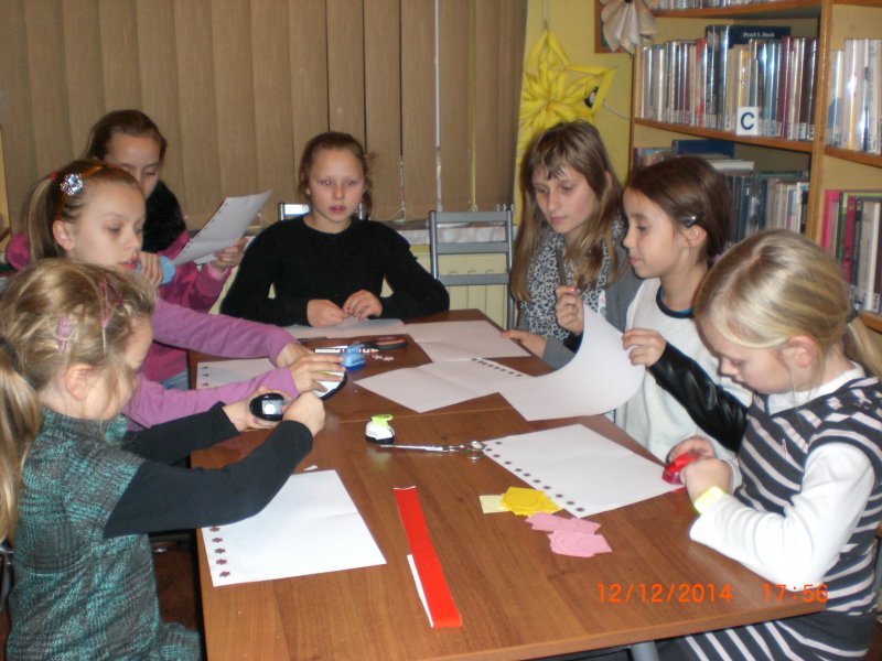 Dnia 12.12.2014 w GBP filii w Gwździanach podczas zajęć plastycznych w bibliotece dzieci własnoręcznie wykonywały ozdoby na choinkę bożonarodzeniową.Z prac dzieci powstały piękne białe anioły z uśmiechniętymi buziami. Podczas zajęć dzieci spotkały się też z Mikołajem.