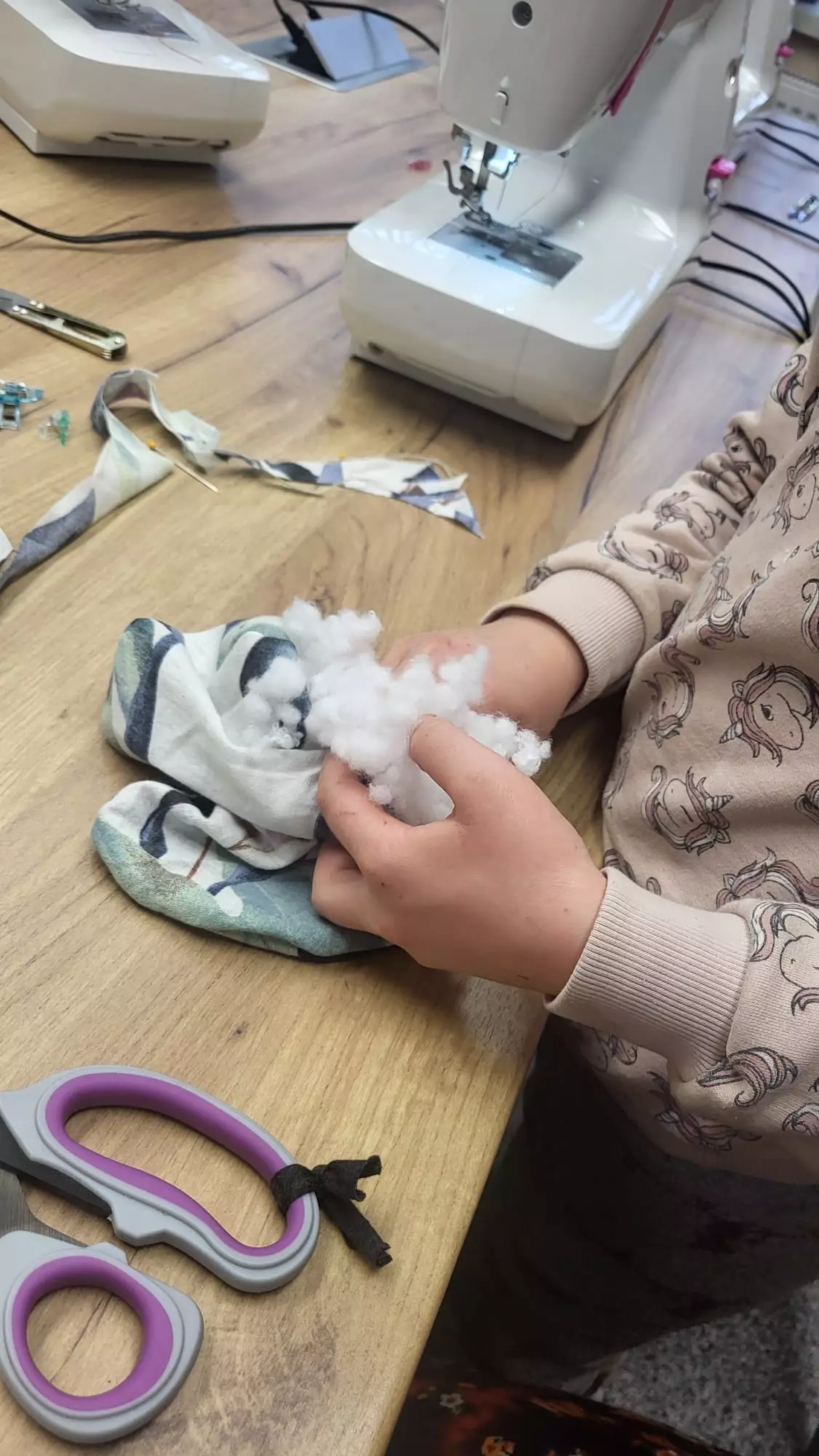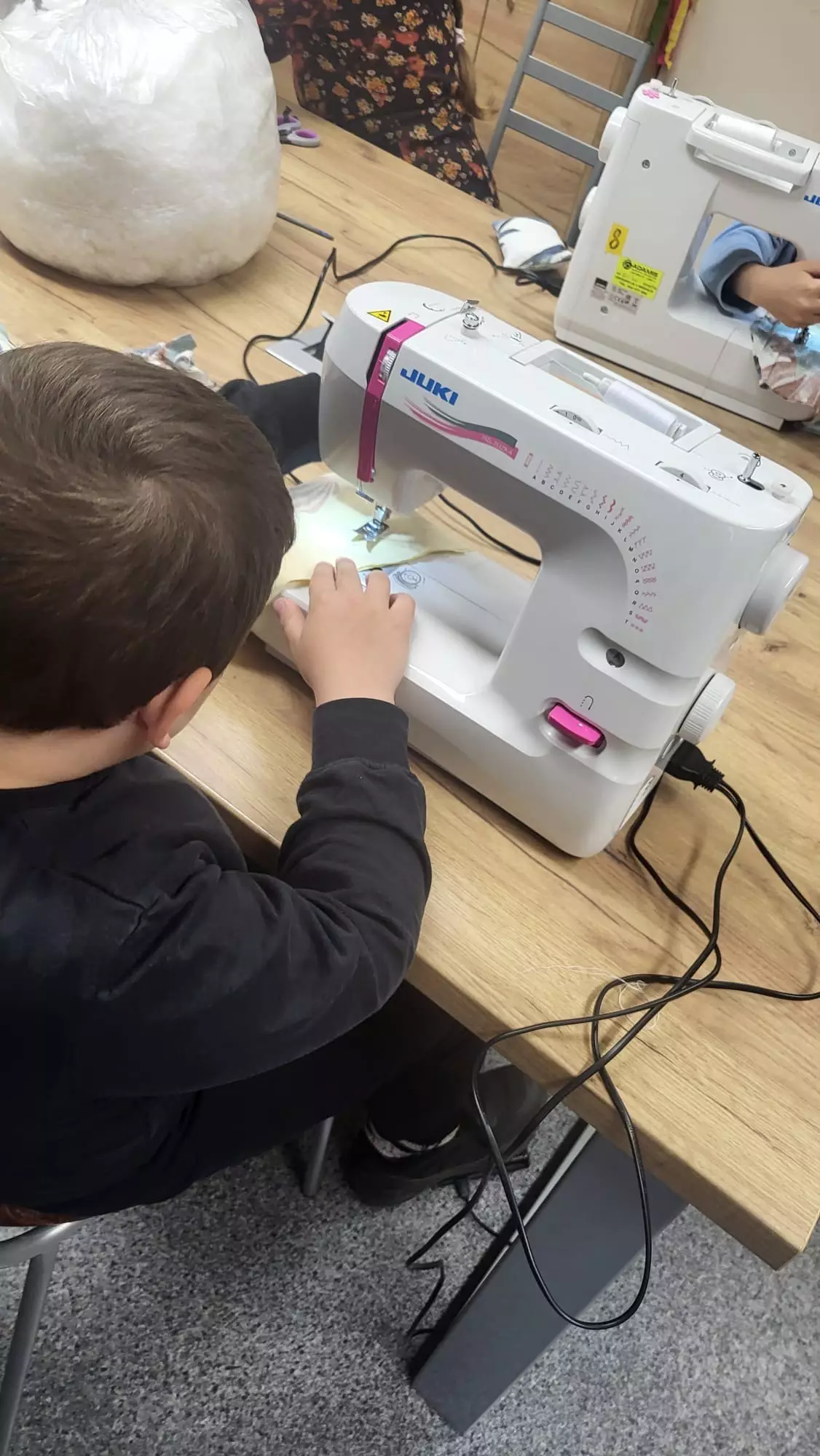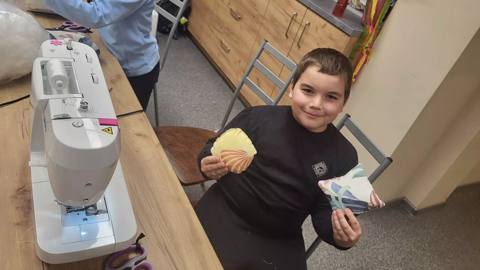 Uszyte prace.Uczestnik wypełniaczem wypełnia uszyty kształt.Uczestniczka zajęć ze swoją pracą.Uczestnik zajęć ze swoją pracą.Dziewczynka szyje na maszynie.Dziewczynka szyje na maszynie.Chłopczyk siedzi pezy stole obok maszyny ze swoją uszytą pracą.Chłopczyk szyje na maszynie.Dziewczynka szyje na maszynie.