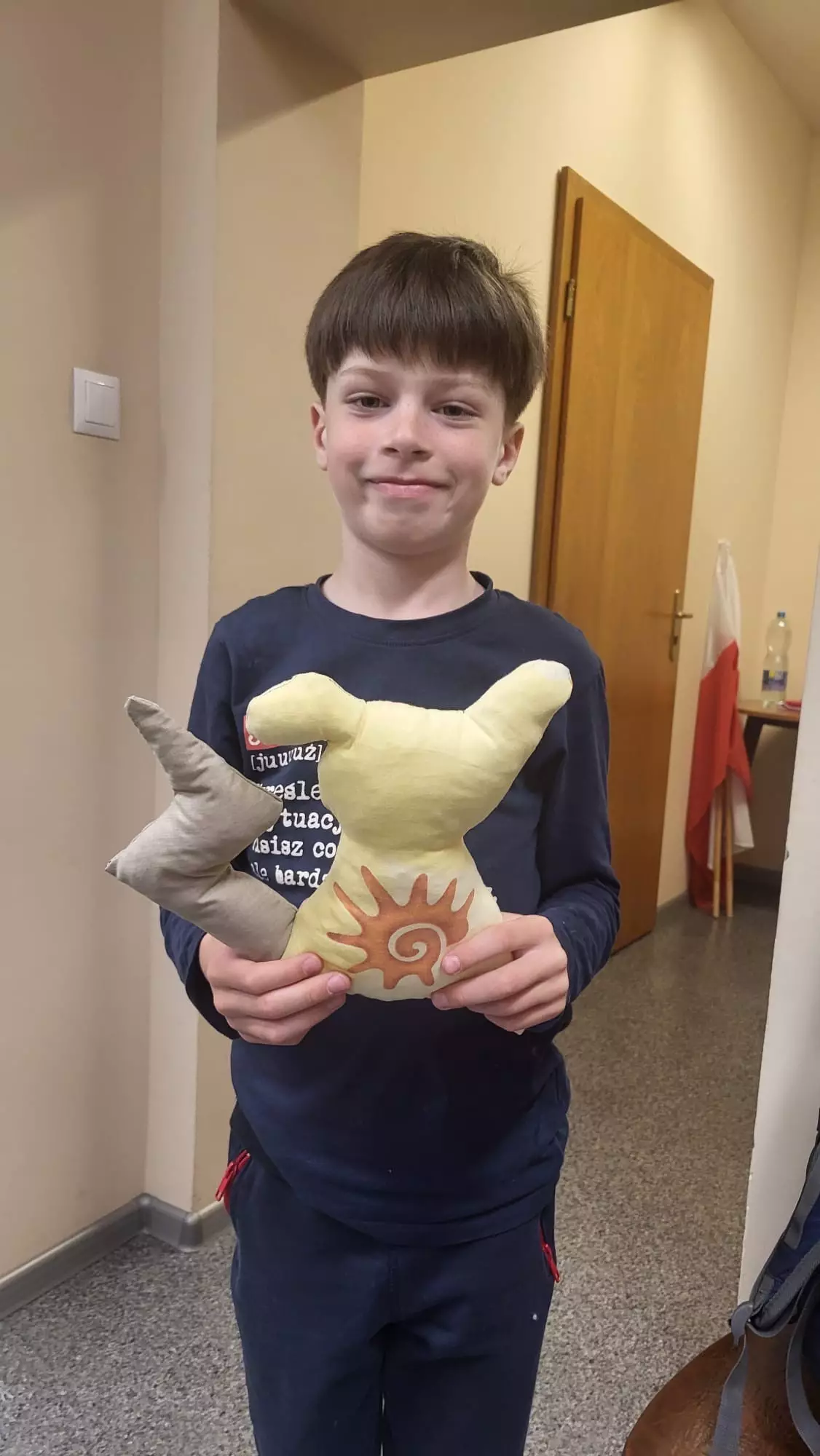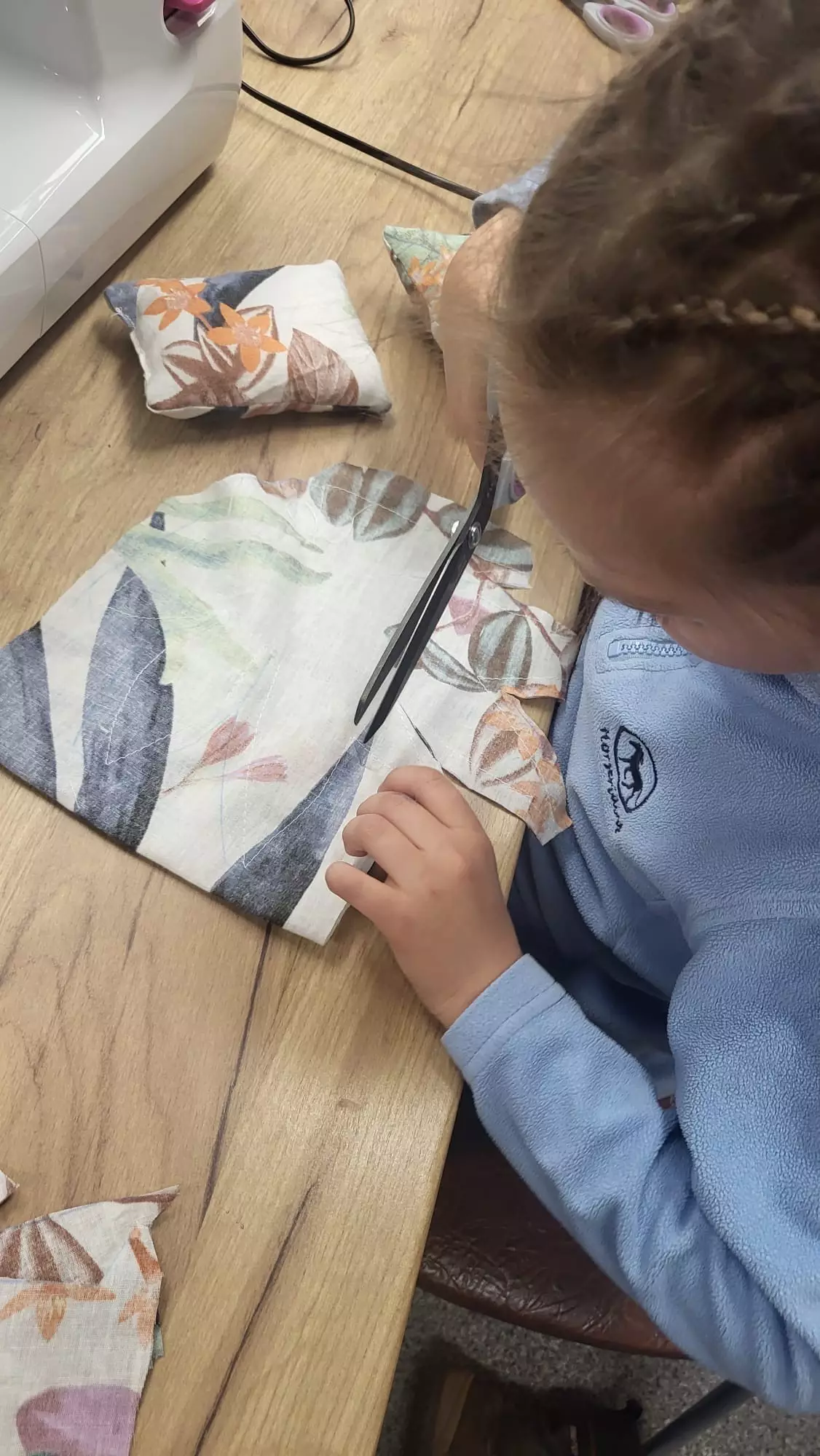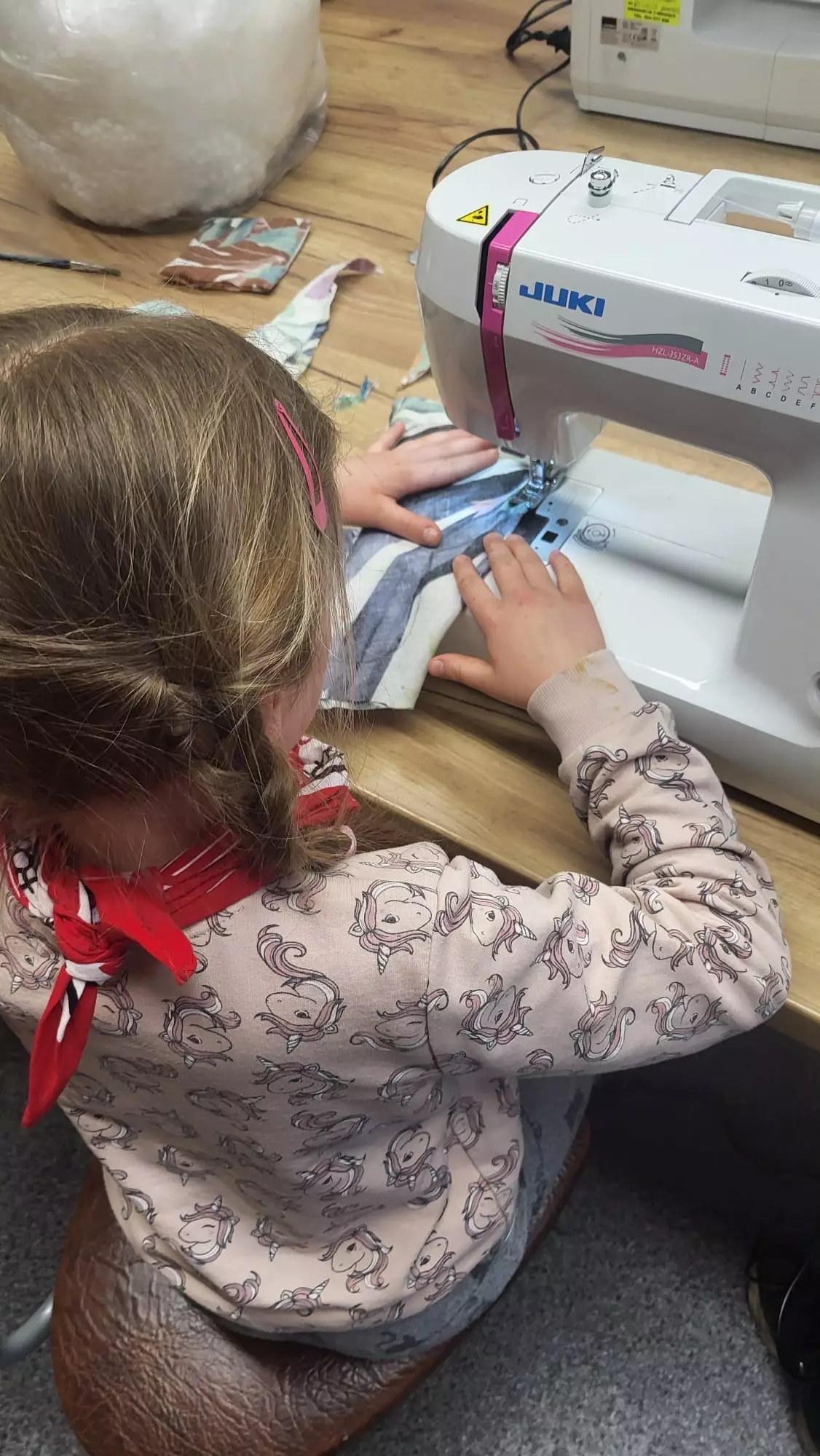 Uszyte prace.Uczestnik wypełniaczem wypełnia uszyty kształt.Uczestniczka zajęć ze swoją pracą.Uczestnik zajęć ze swoją pracą.Dziewczynka szyje na maszynie.Dziewczynka szyje na maszynie.Chłopczyk siedzi pezy stole obok maszyny ze swoją uszytą pracą.Chłopczyk szyje na maszynie.Dziewczynka szyje na maszynie.