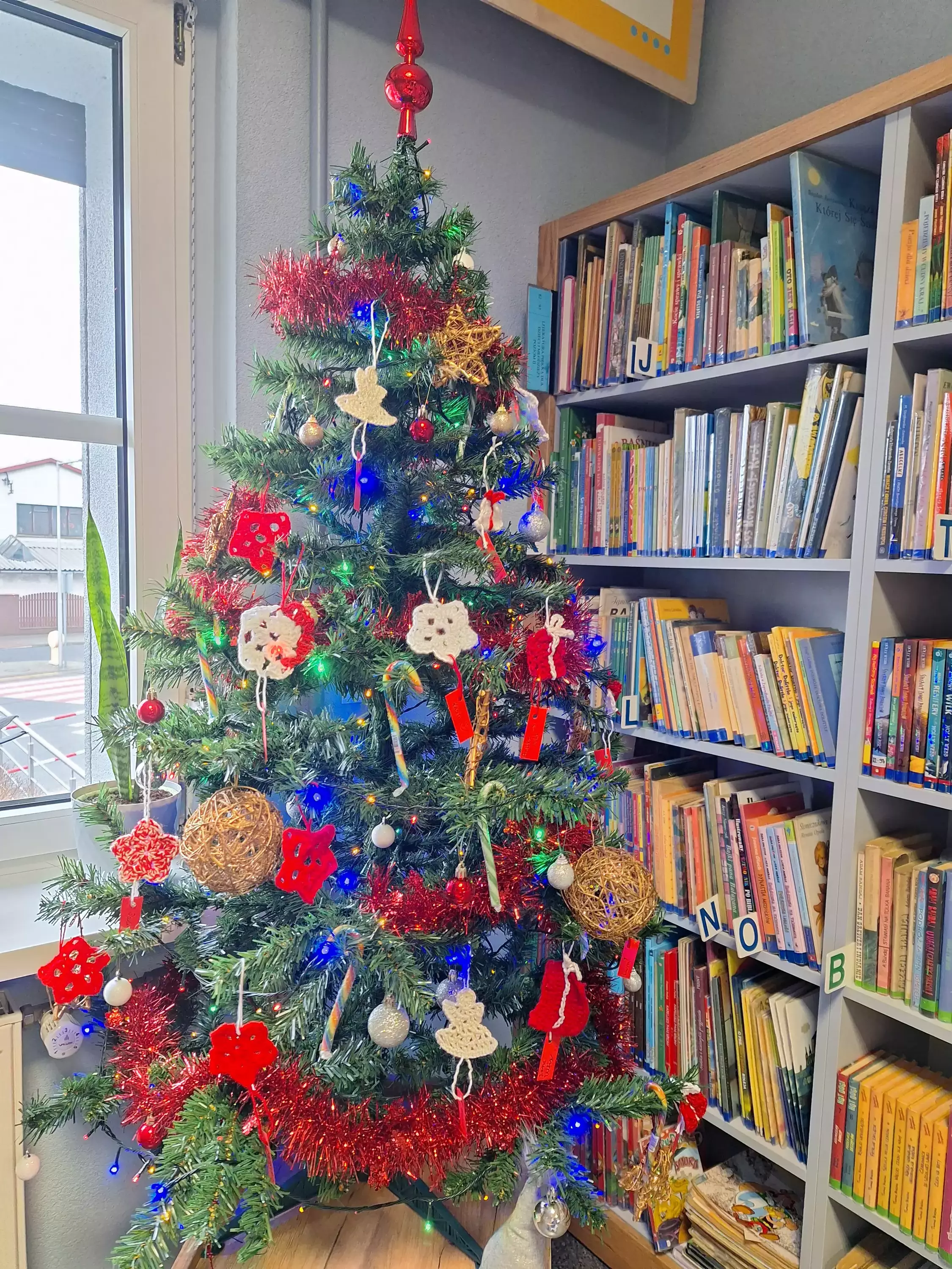 Choinka ubrana w szydełkowe ozdoby.