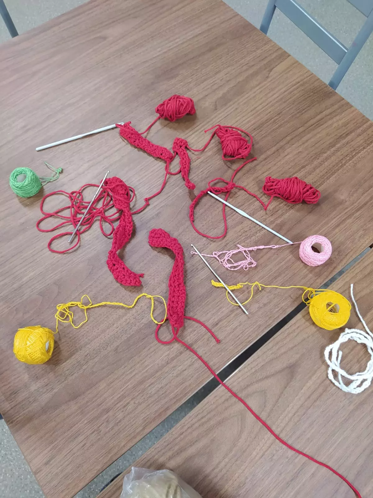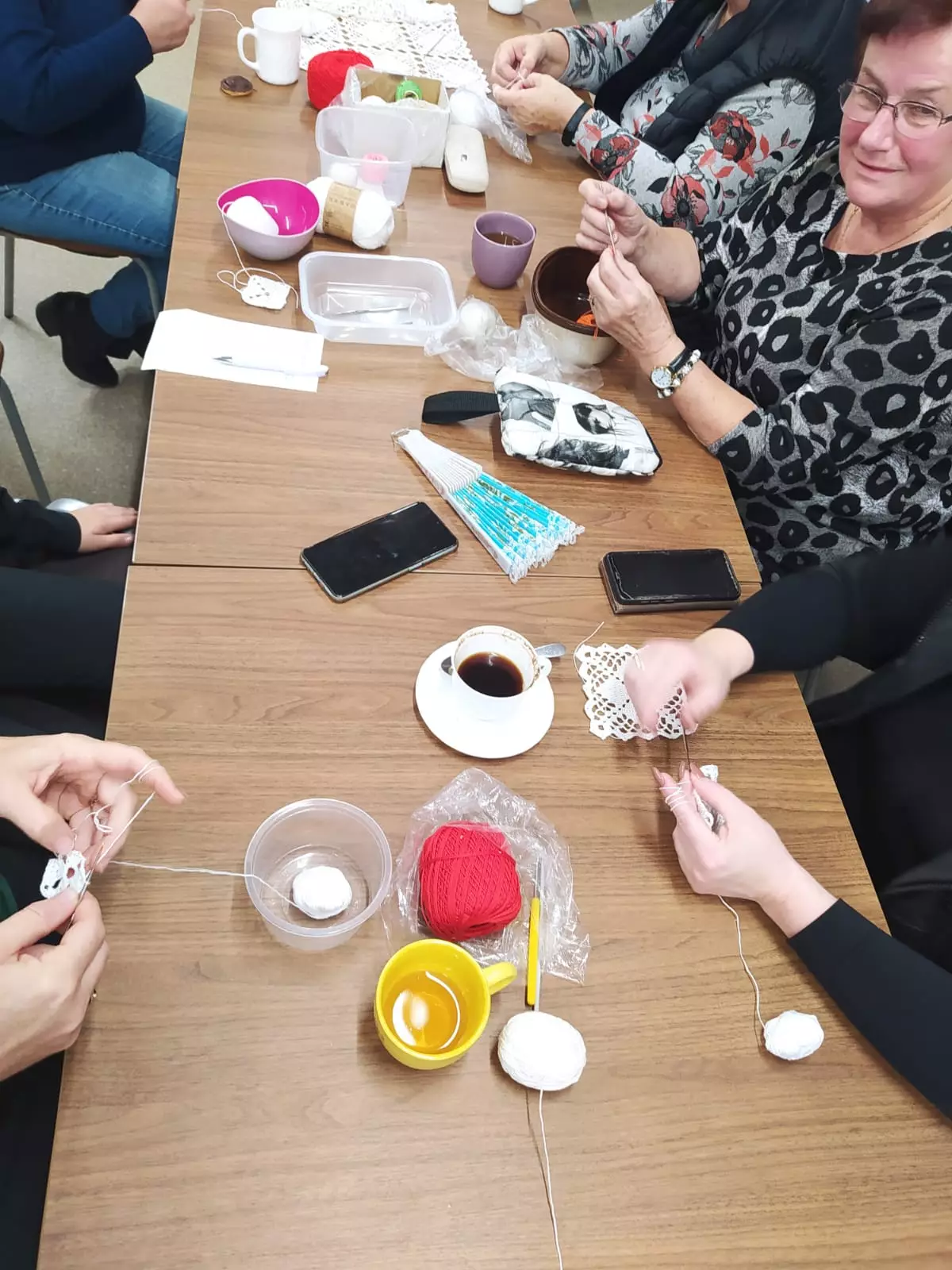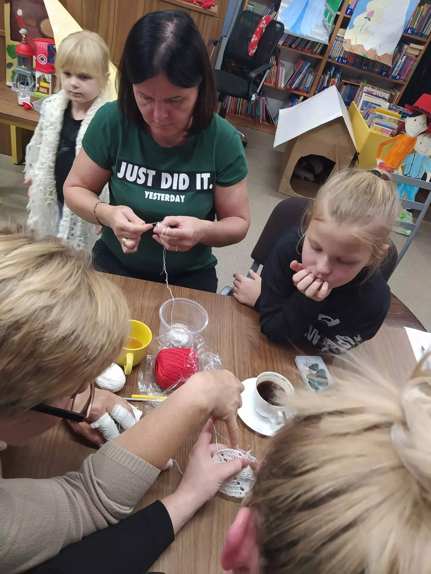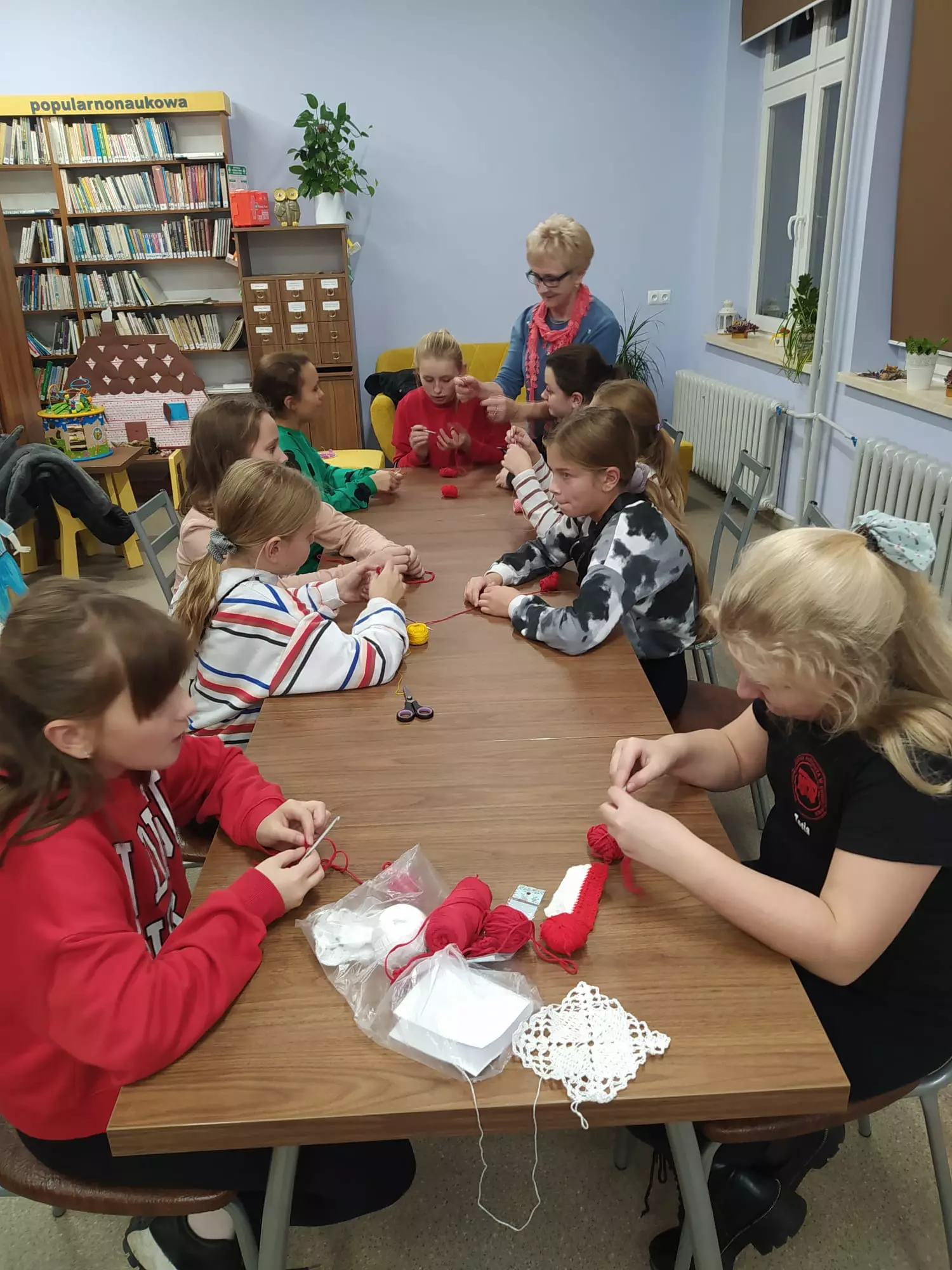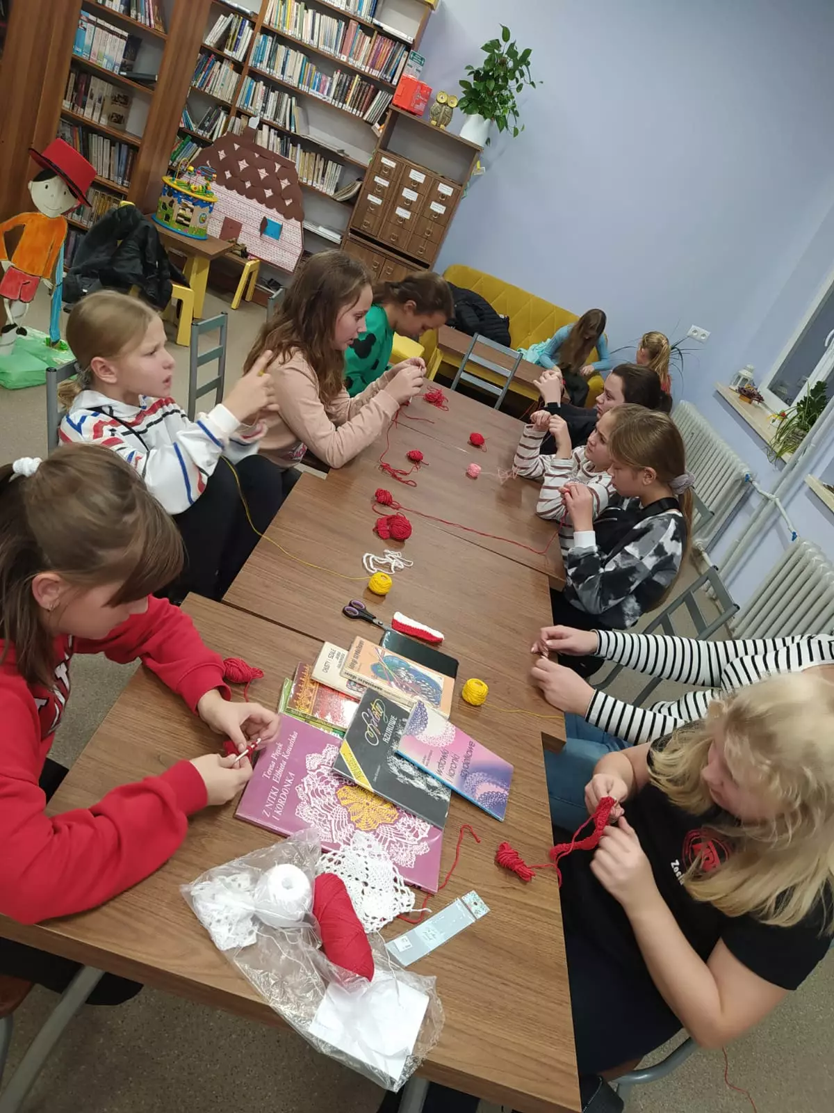 Panie siedzą przy stole i szydełkują.Uczestniczki siedzą przy stole w bibliotece i szydełkują.Uczestniczki szydełkują w bibliotece.Panie tworzą prace na szydełku w bibliotece.Panie szydełkują ozdoby w bibliotece.Prace wykonane na szydełku.Włóczka i szydełko.Uczestnicy szydełkują przy wspólnym stole.Młodzież szydełkuje w bibliotece.