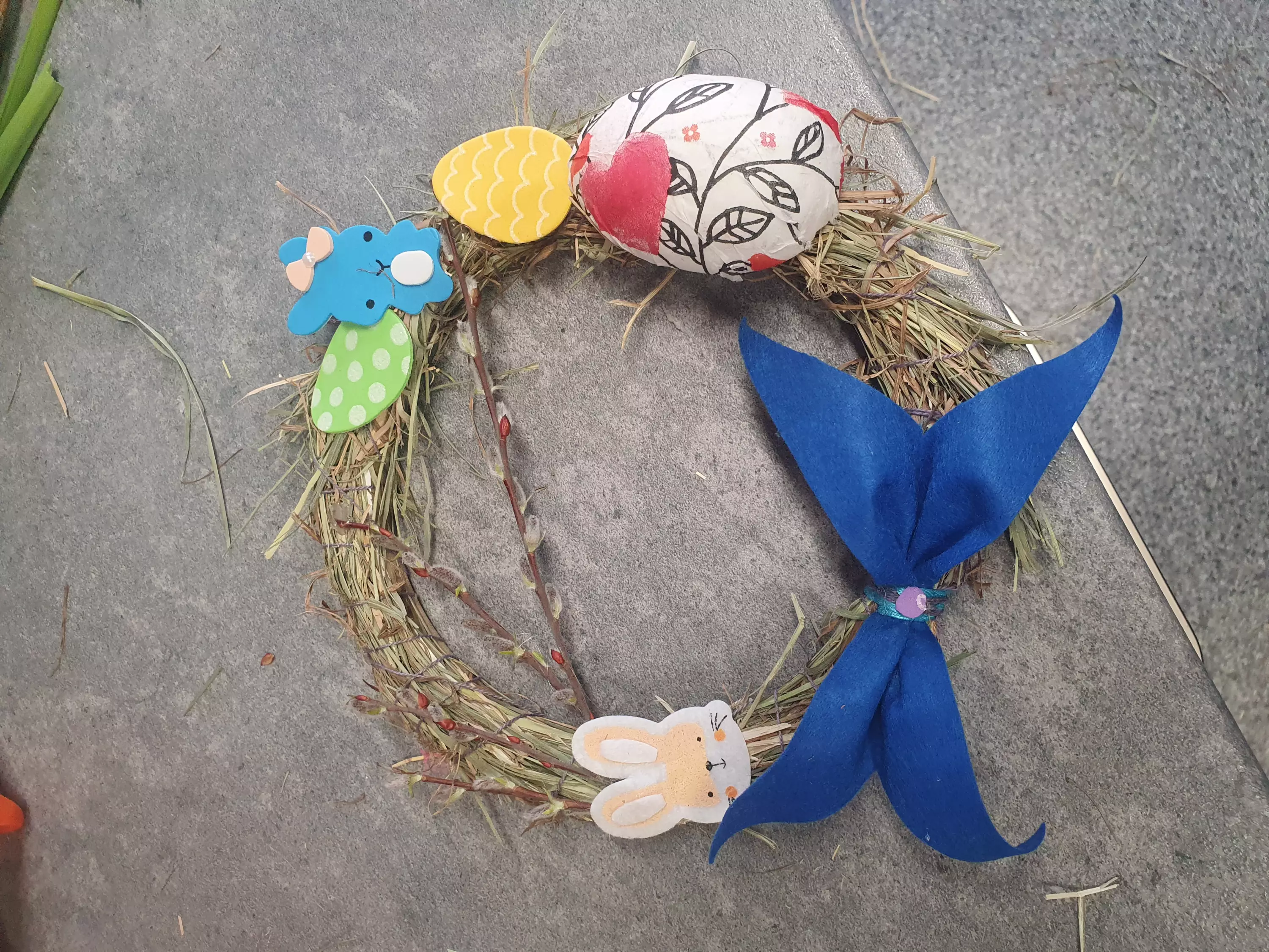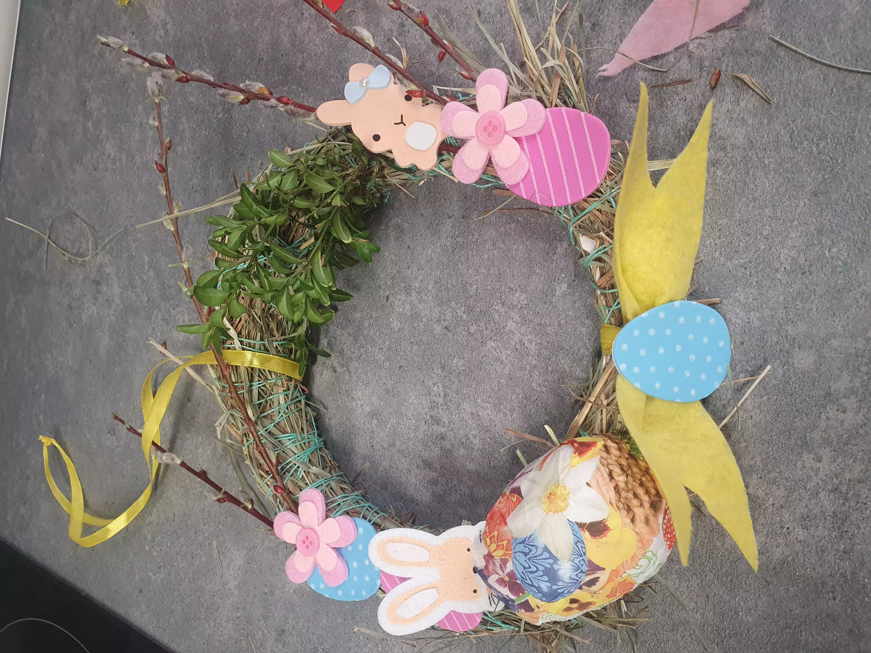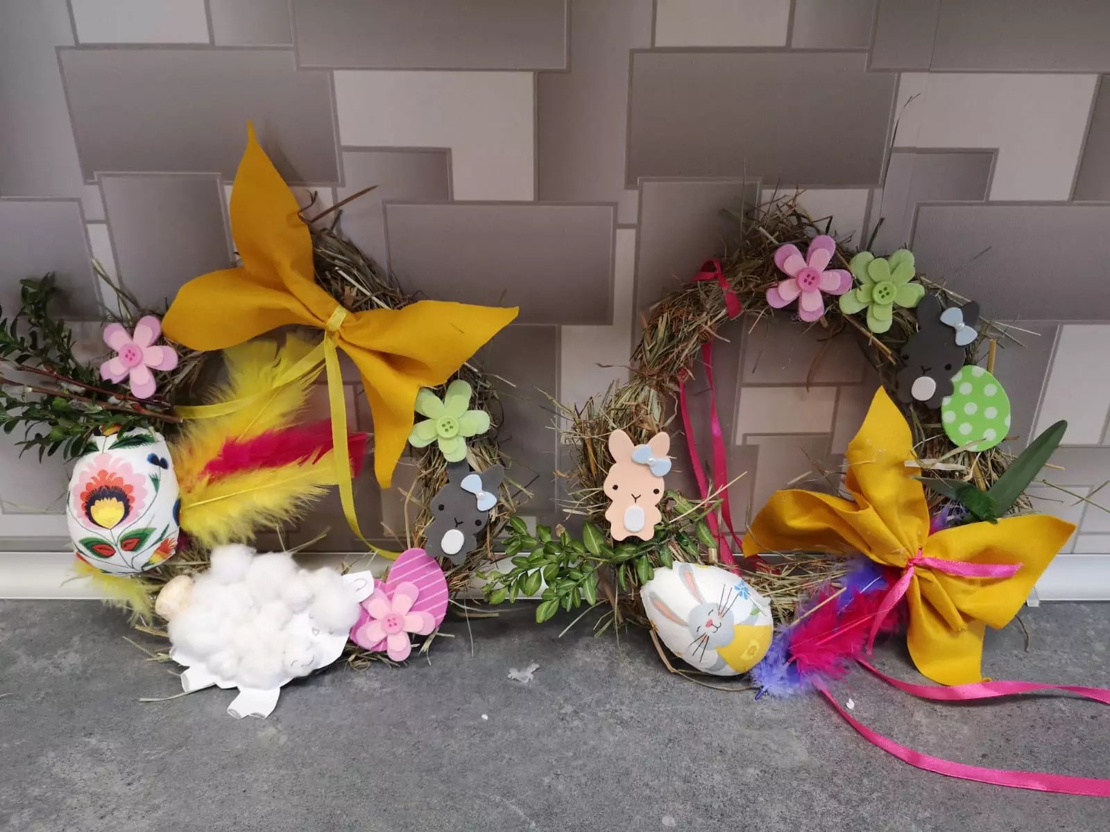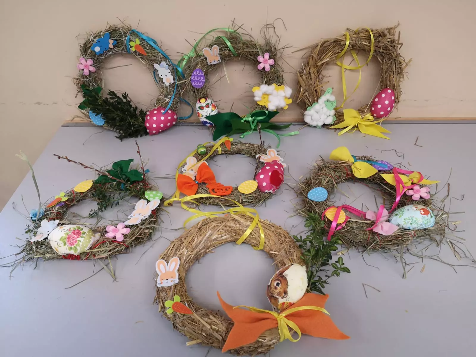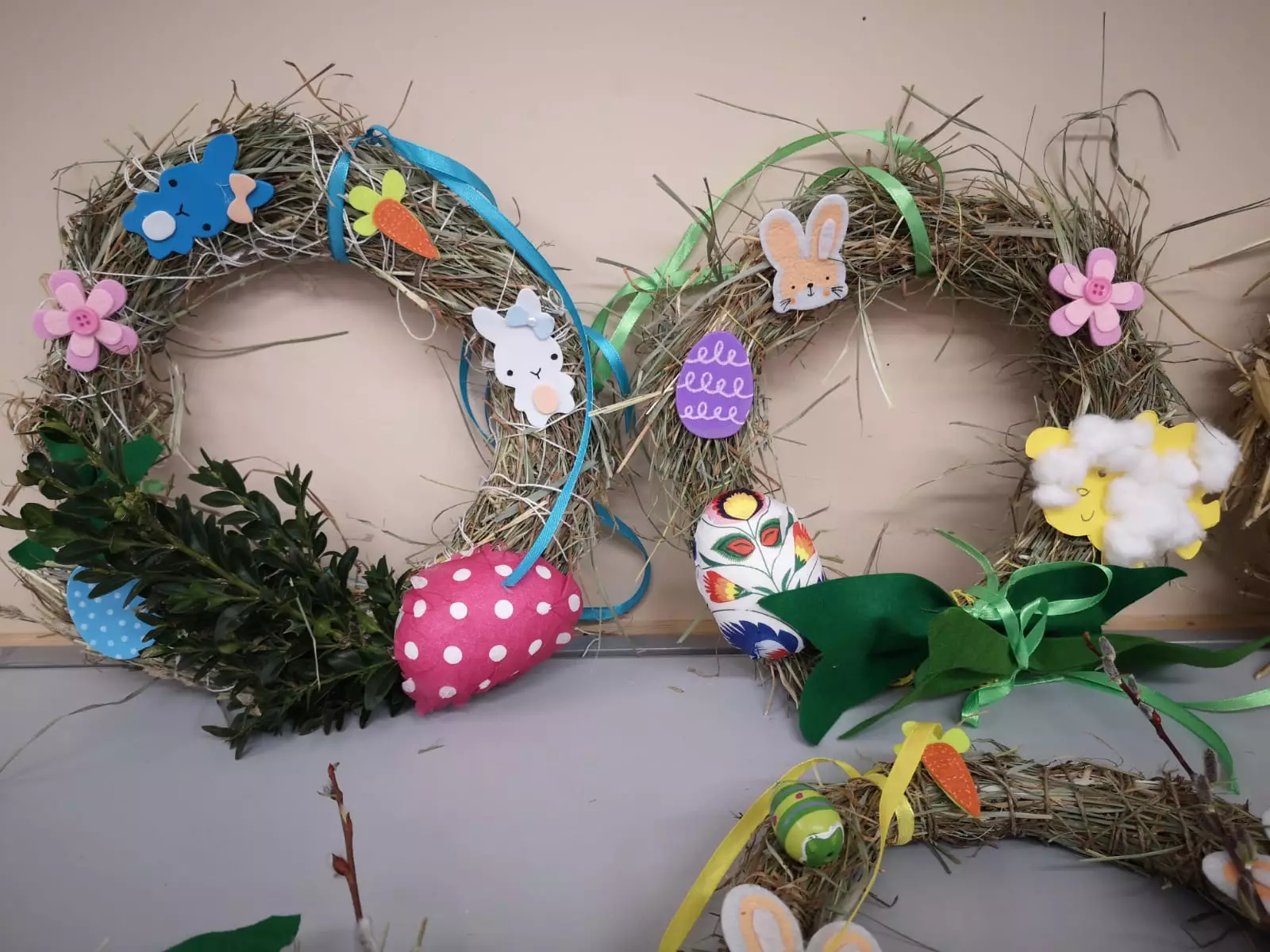 Do ich wykonania wykorzystaliśmy siano i słomę oraz elementy, takie jak: jajeczka, wstążki, baranki, kurczaczki, zajączki i piórka.