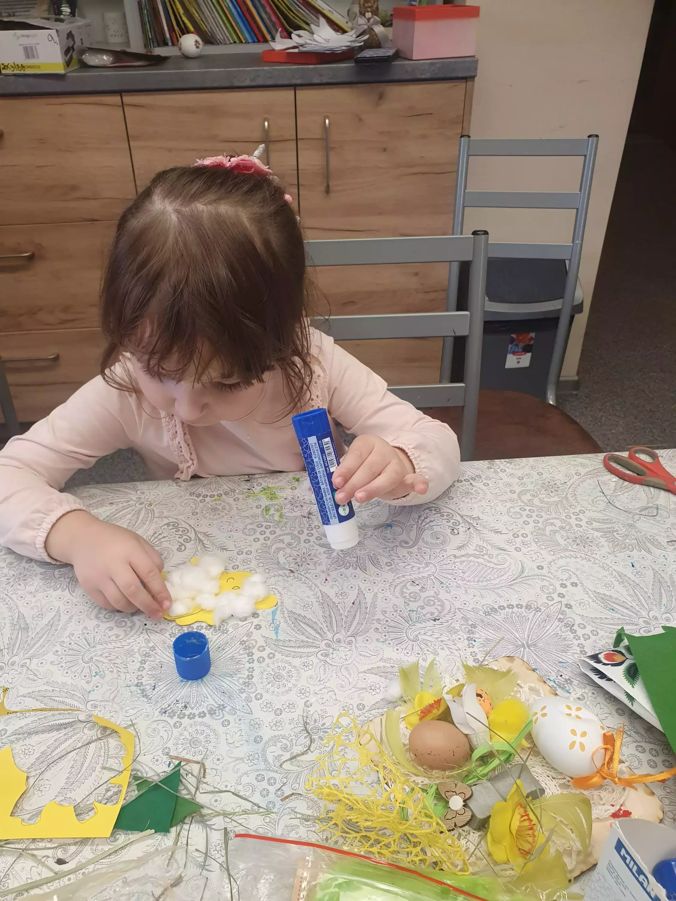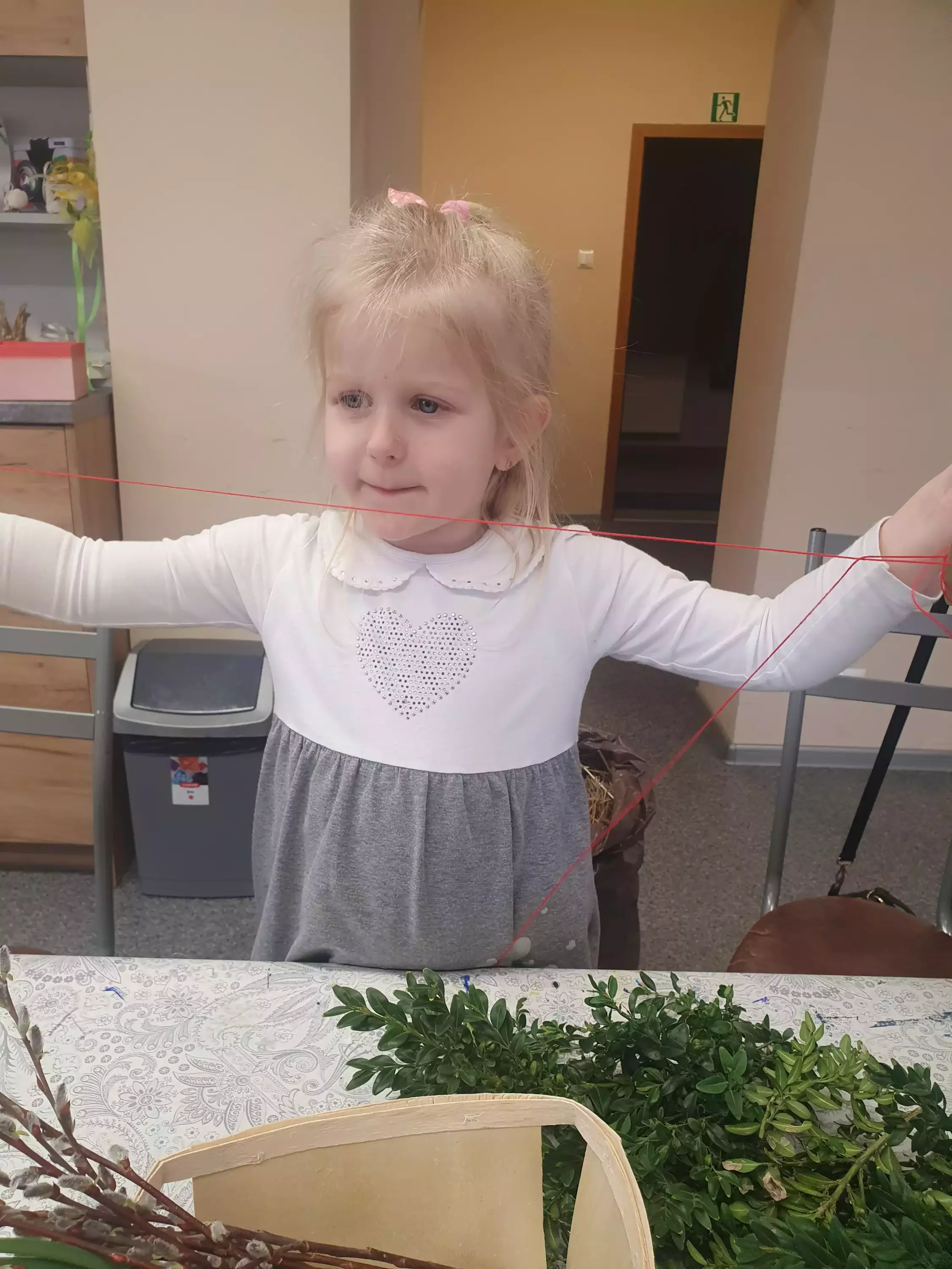 Dziewczynka stoi przy stole i trzyma w ręce wełnę.