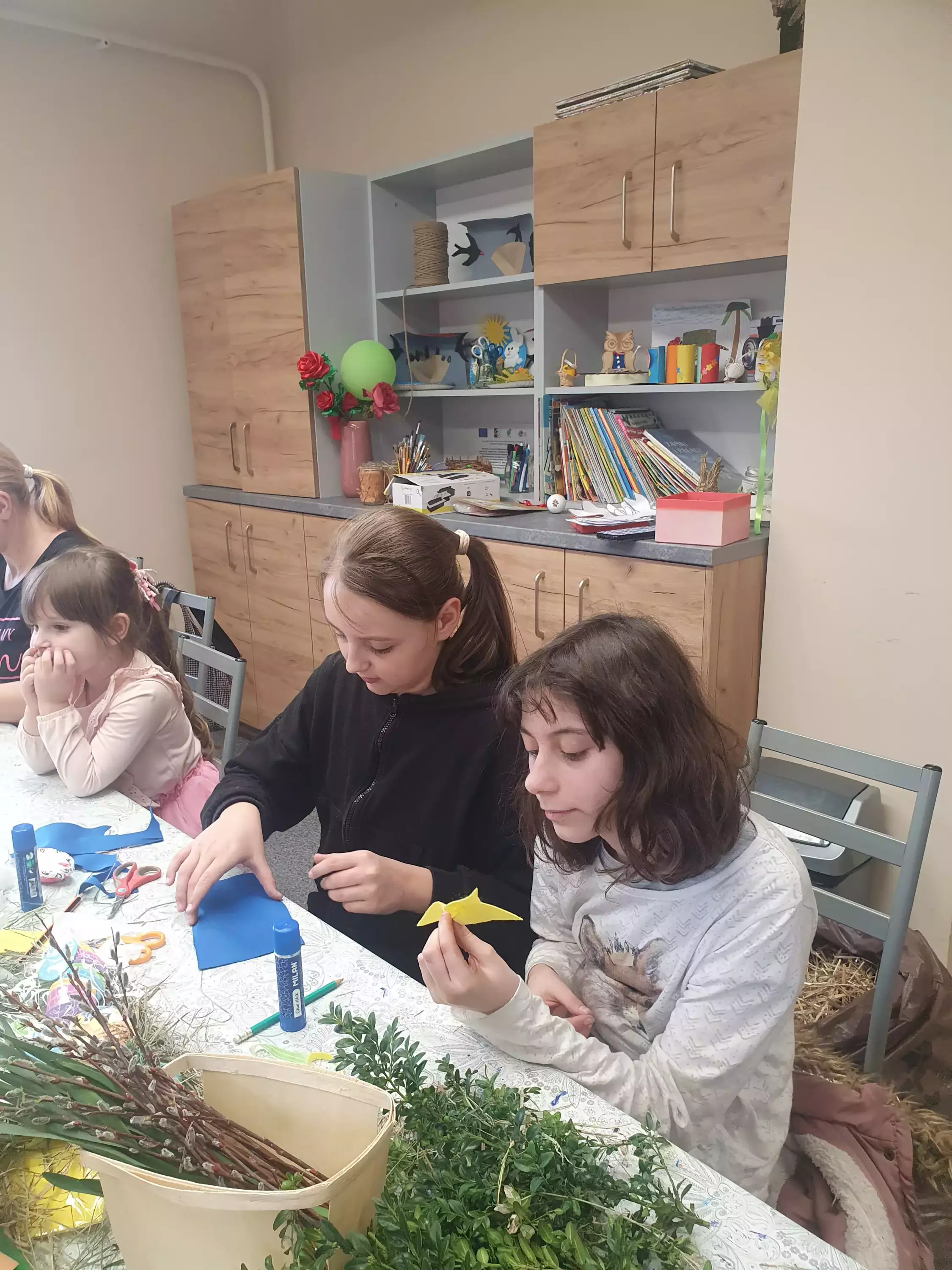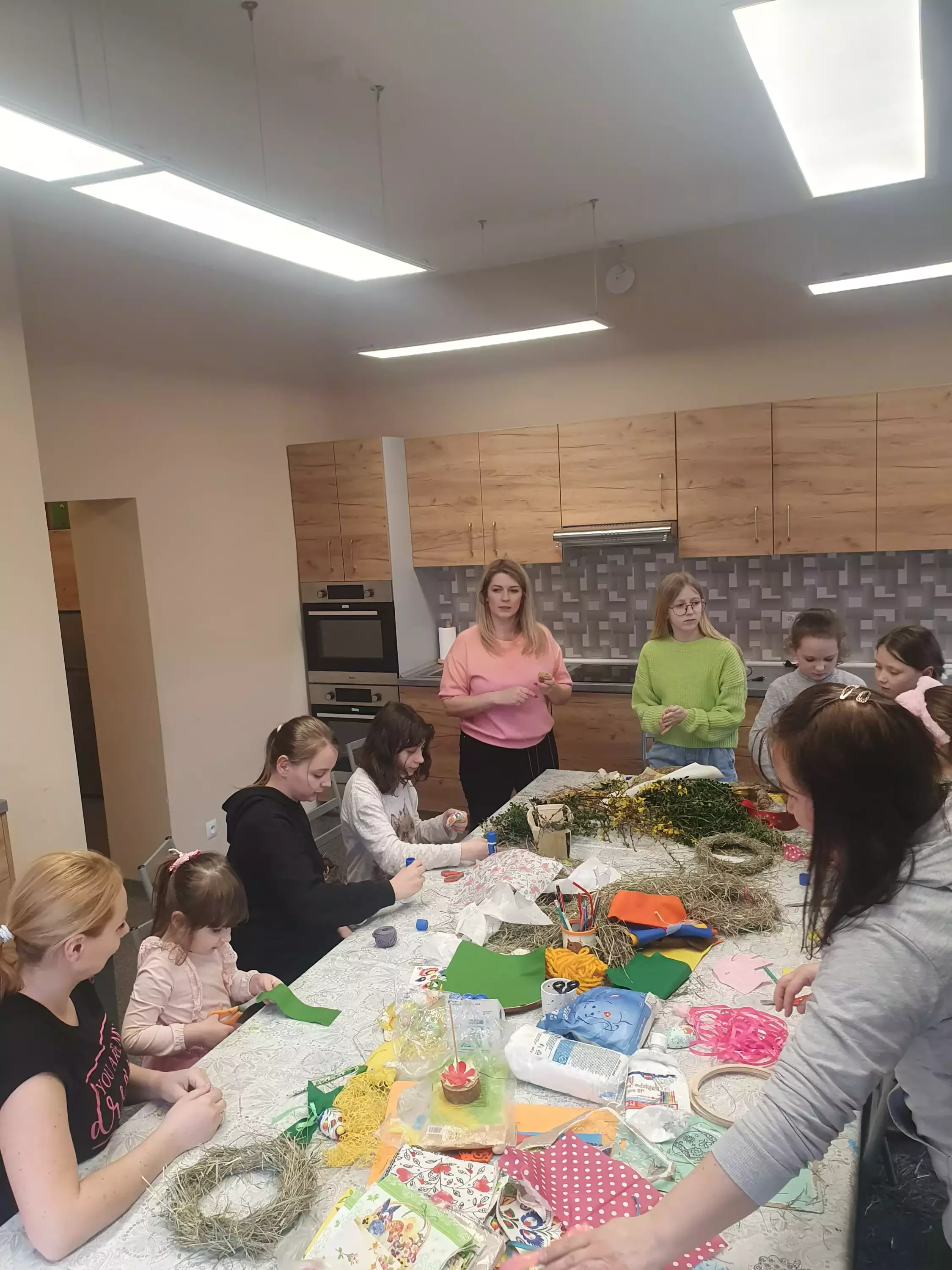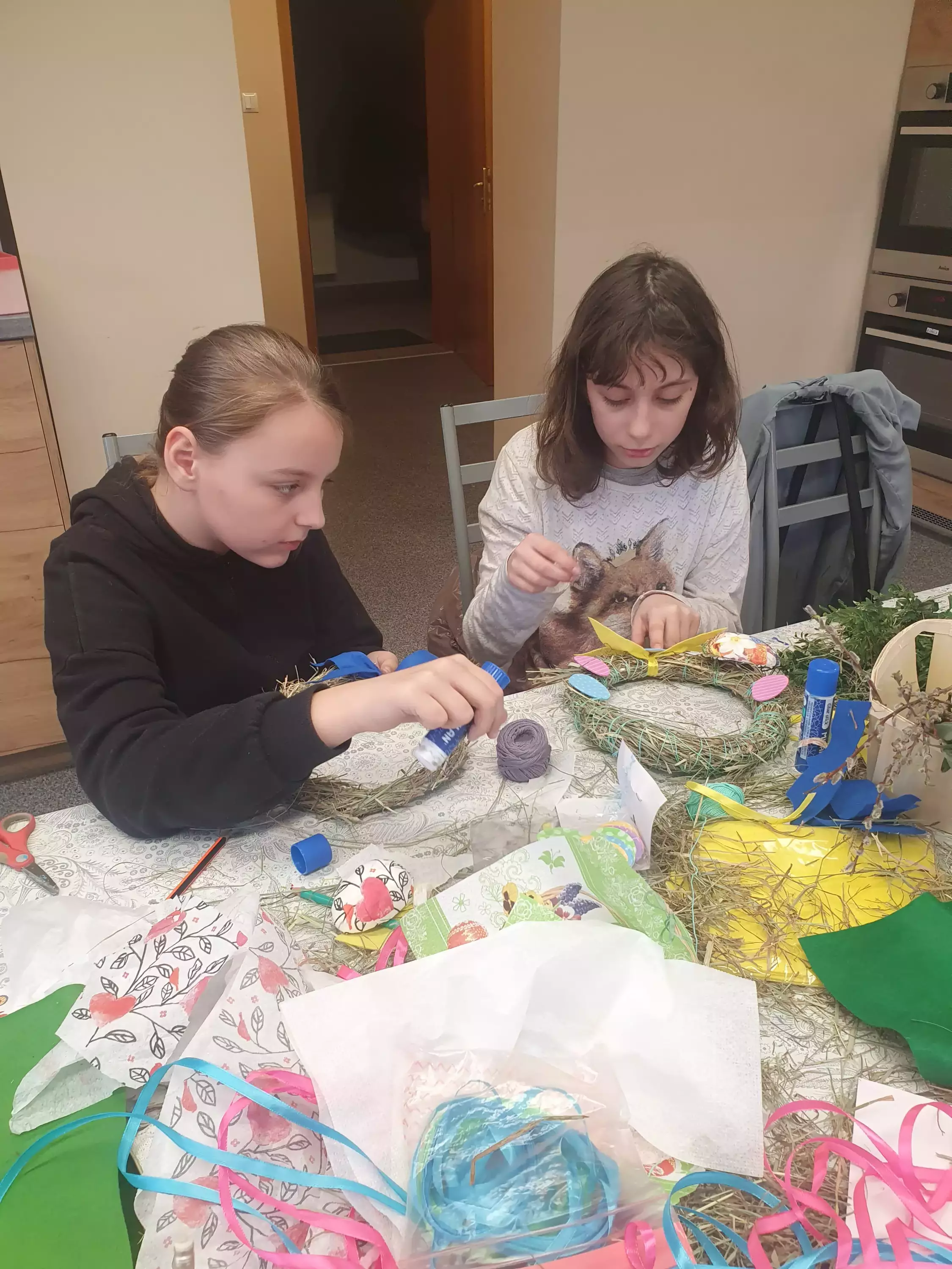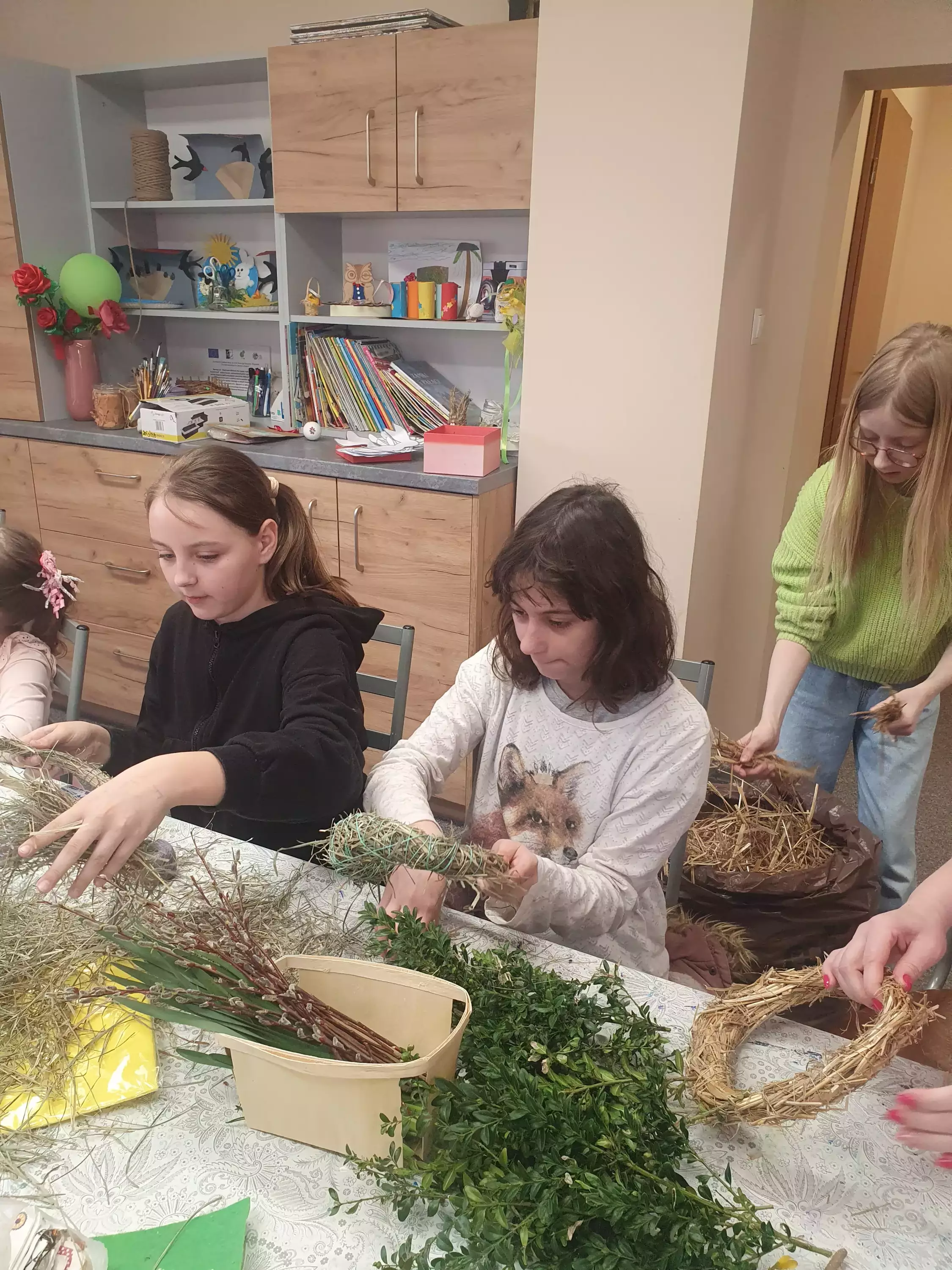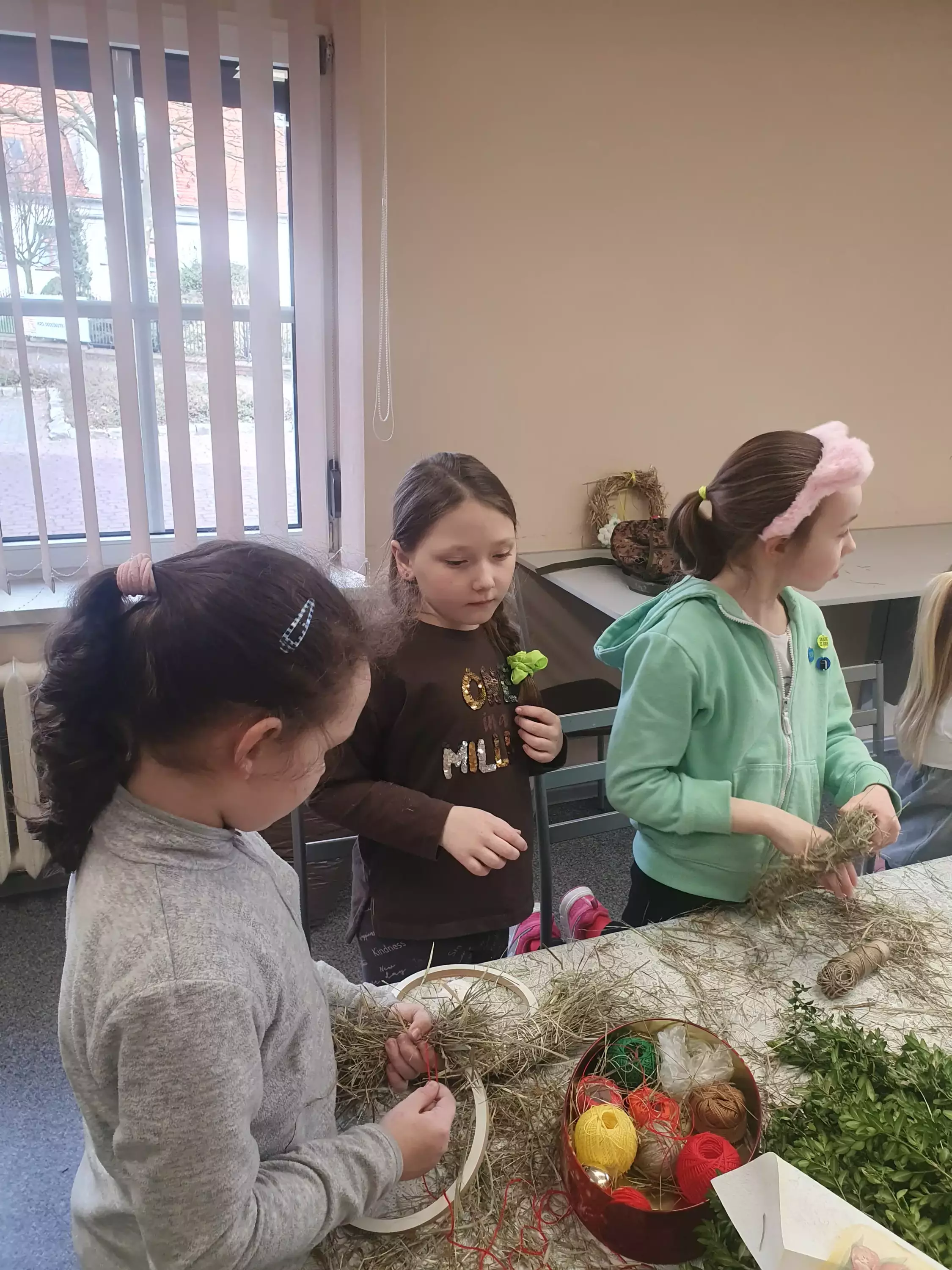 Uczestnicy warsztatów siedzą przy stole i owijają drewniane kółko sianem.Uczestnicy owijają kółko słomą tworząc wianek.Dziewczyny owijają kółko słomą tworząc wianek.Dziewczynki owijają kółko słomą.Uczestnicy warsztatów wykonują wianki wielkanocne ze słomy i siana.Dziewczynki owijają wianek kolorową wełną.Dzieci przy wspólnym stole wycinają ozdoby na wianek.Dziewczyny siedzą przy stole i wycinają kokardy z filcu.Dziewczyny siedzą przy stole i owijają wianki wielkanocne.Dziewczynka siedzi przy stole i wykleja baranka.Wianek wielkanocny.Wianek wielkanocny.Wianki wielkanocne.wIANKI WIELKANOCNE.Wianki wielkanocne.