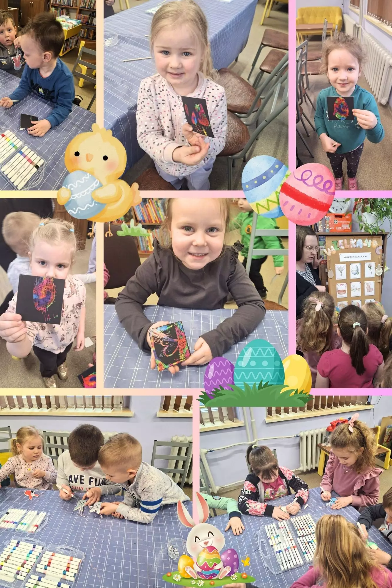 Kolaż zdjęć. Dzieci w trakcie robienia swoich zajączków i skrobanych pisanek.Prace dzieci.Przedszkolaki słuchają o tradycjach wielkanocnych.