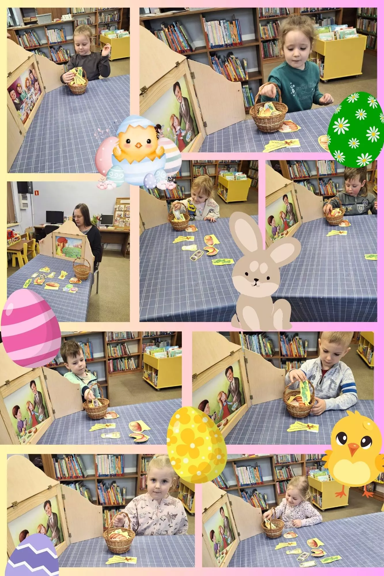 Kolaż zdjeć. Uzupełnianie koszyczka w trakcie czytania bajki pt. Idzie wiosna, Wielkanoc tuż tuż za pomocą teatrzyku kamishibai.