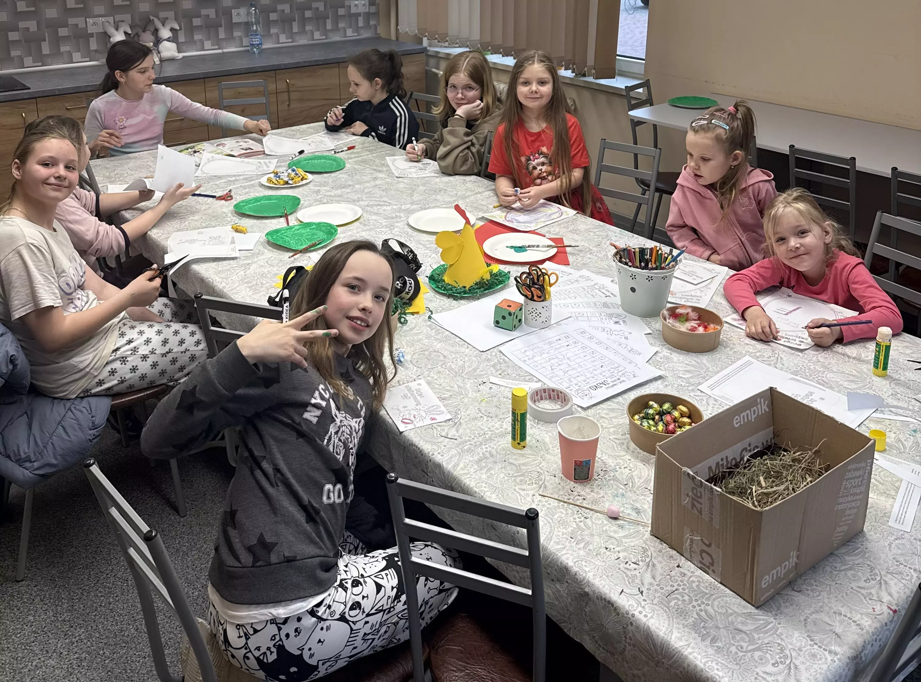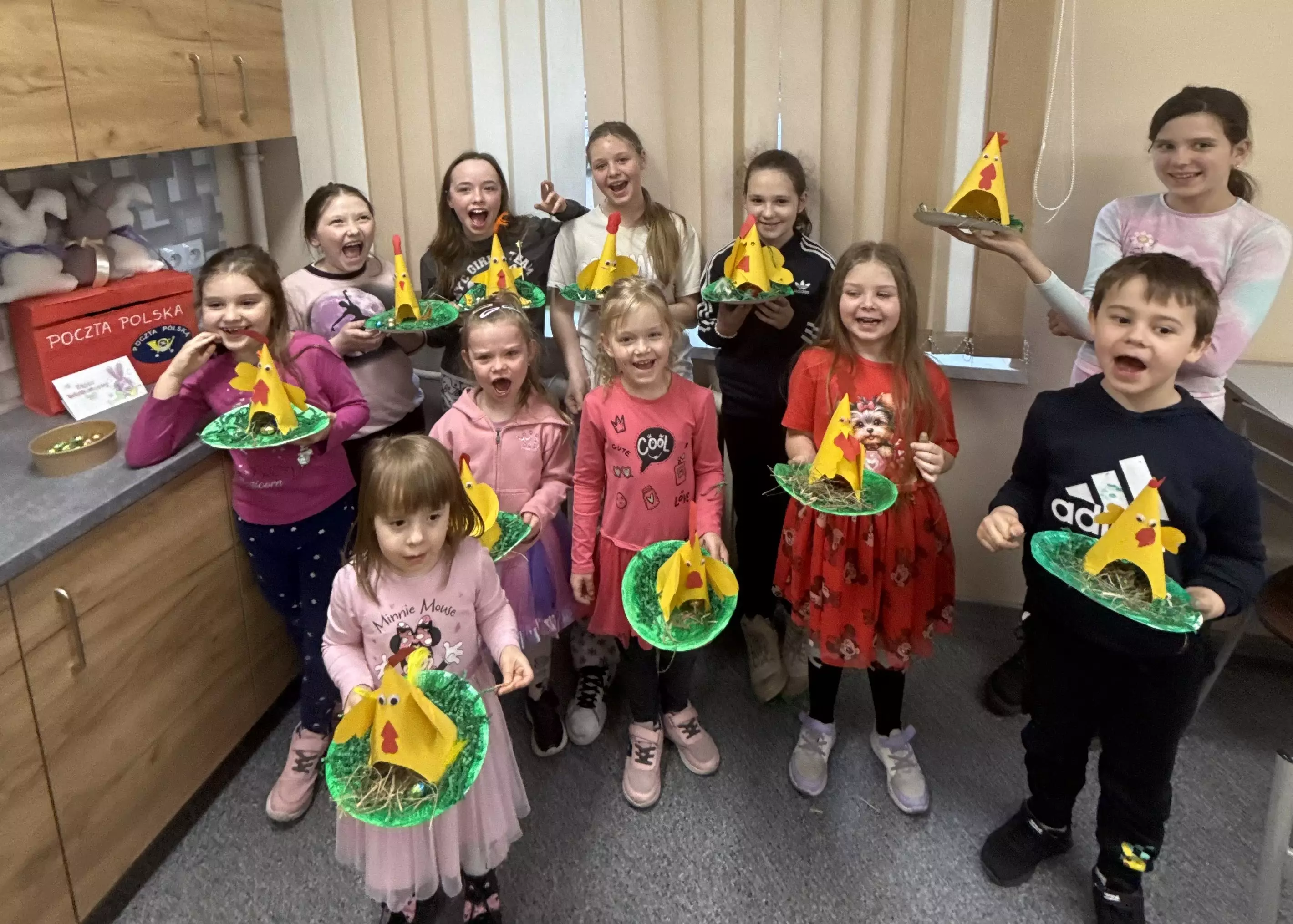Uczestniczki zajęć piszą list do zajączka.Uczestniczki zajęć piszą list do zajączka.Uczestniczki zajęć wrzucają list do zajączka do skrzynki pocztowej.Uczestniczki zajęć wrzucają list do zajączka do skrzynki pocztowej.Uczestniczki zajęć wrzucają list do zajączka do skrzynki pocztowej.Wspólne zdjęcie po zajęciach bibliotecznych. Dzieci trzymają w rękach papierowe kurki.