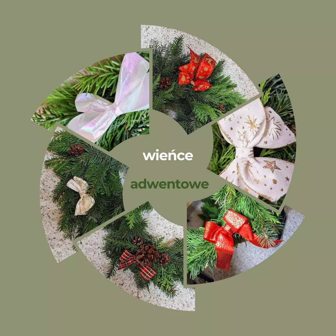 Kolaż zdjęć w kształcie wieńca, przedstawiający wieńce adwentowe zrobione przez uczestników warsztatów.