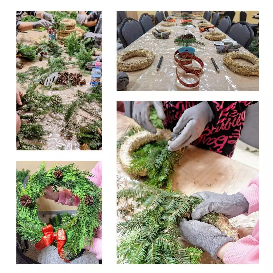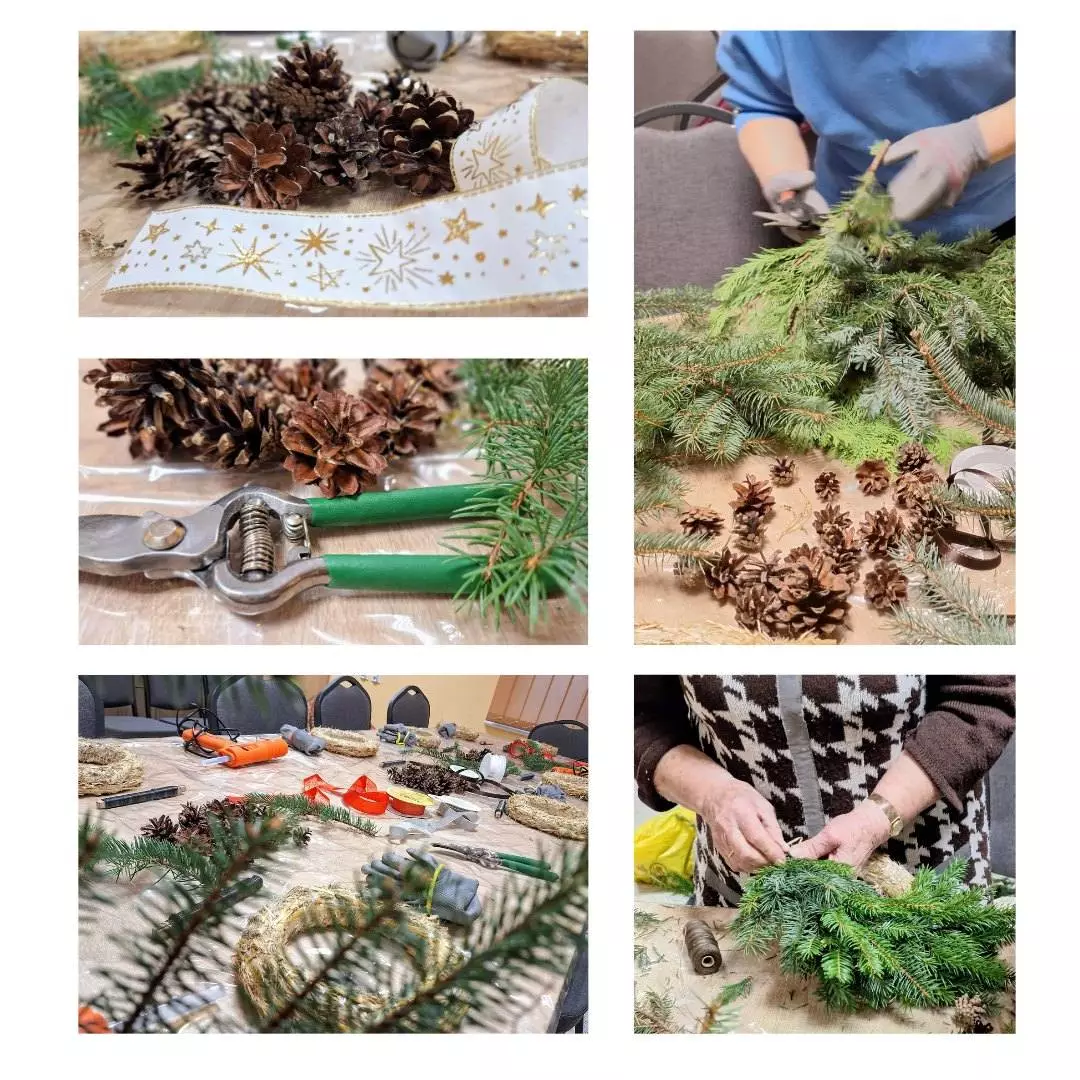 Kolaż zdjęć w kształcie wieńca, przedstawiający wieńce adwentowe zrobione przez uczestników warsztatów.Kolaż zdjęć, przedstawia zrobione przez uczestników wieńce.Kolaż zdjęć, pokazuje jak tworzyły się wieńce.Kolaż zdjęć, pokazuje jak powstawał wieniec.Kolaż zdjęć. Akcesoria wykorzystane do zrobienia wieńca.Kolaż zdjęć, pokazuje jak powstawał wieniec.