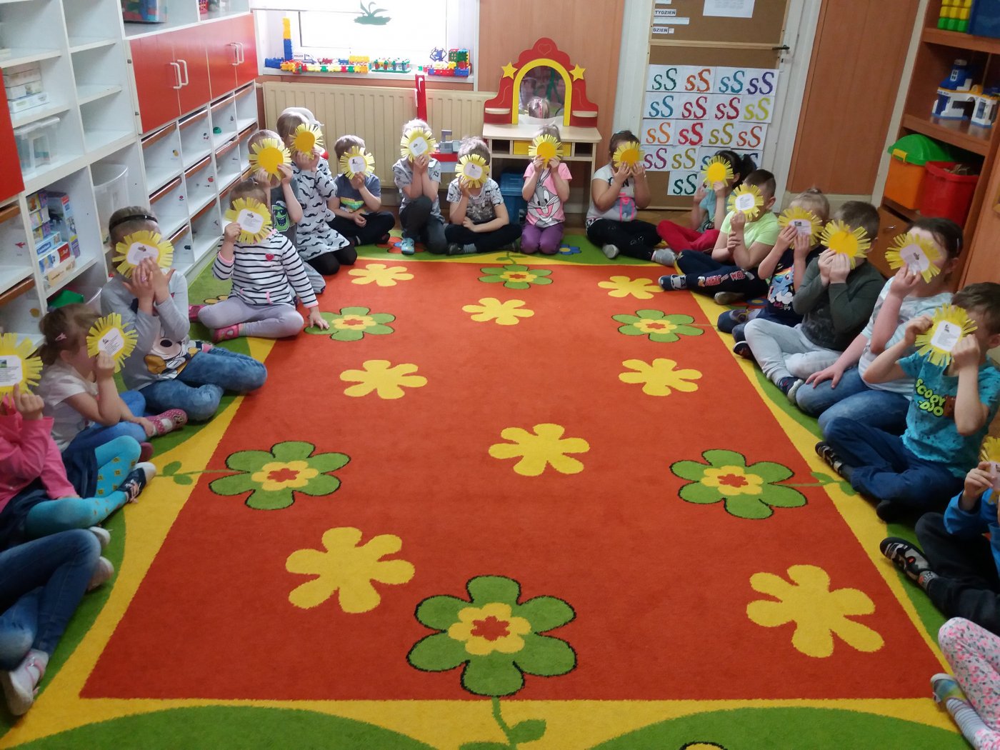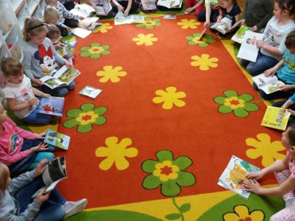 Pani bibliotekarka zaprezentowała też książeczki dla najmłodszych, którymi bardzo się zainteresowały. Na zakończenie każde dziecko otrzymało wiosenne słoneczko z mottem o książkach.