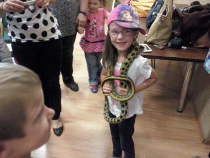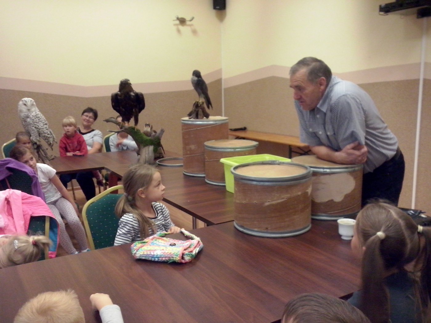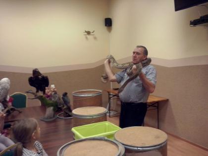 W Pawonkowie spotkaliśmy się z panem Andrzejem Pająkiem i jego zwierzętami. Tym razem były to ptaki szponiaste i gady.