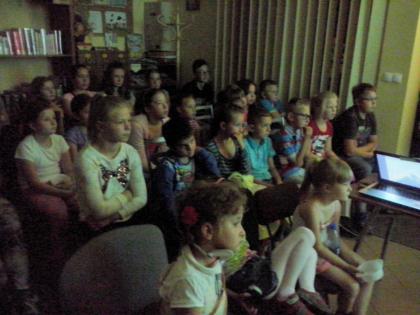 Natomiast w sierpniu odbywały się warsztaty i spotkania już u nas. Oglądaliśmy bajki z diaskopu, teatrzyk kamishibai, rysowaliśmy, uczyliśmy się oprawiać folią książki, bawiliśmy się plasteliną, włóczką, kolorowymi papierami a nasze prace można było obejrzeć na wystawce. Była również wycieczka na lody do pobliskiej lodziarni.