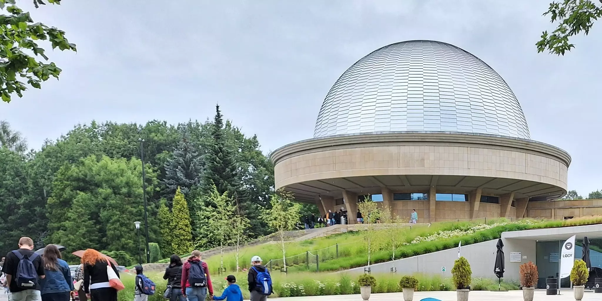 Budynek Planetarium w Chorzowie w kształcie kopuły na lekkim wzniesieniu. Idzie do niego grupa ludzi.