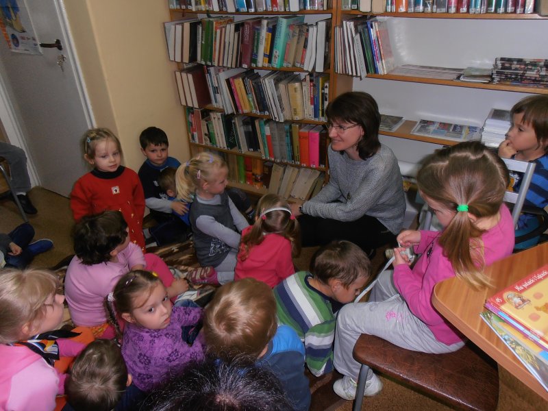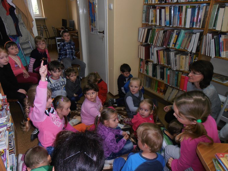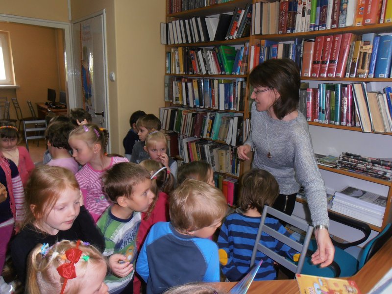 Przedszkolaki odwiedziły Gminną Bibliotekę Publiczną w Pawonkowie. w trakcie spotkania dzieci słuchały czytanych bajeczek przez panią bibliotekarkę.