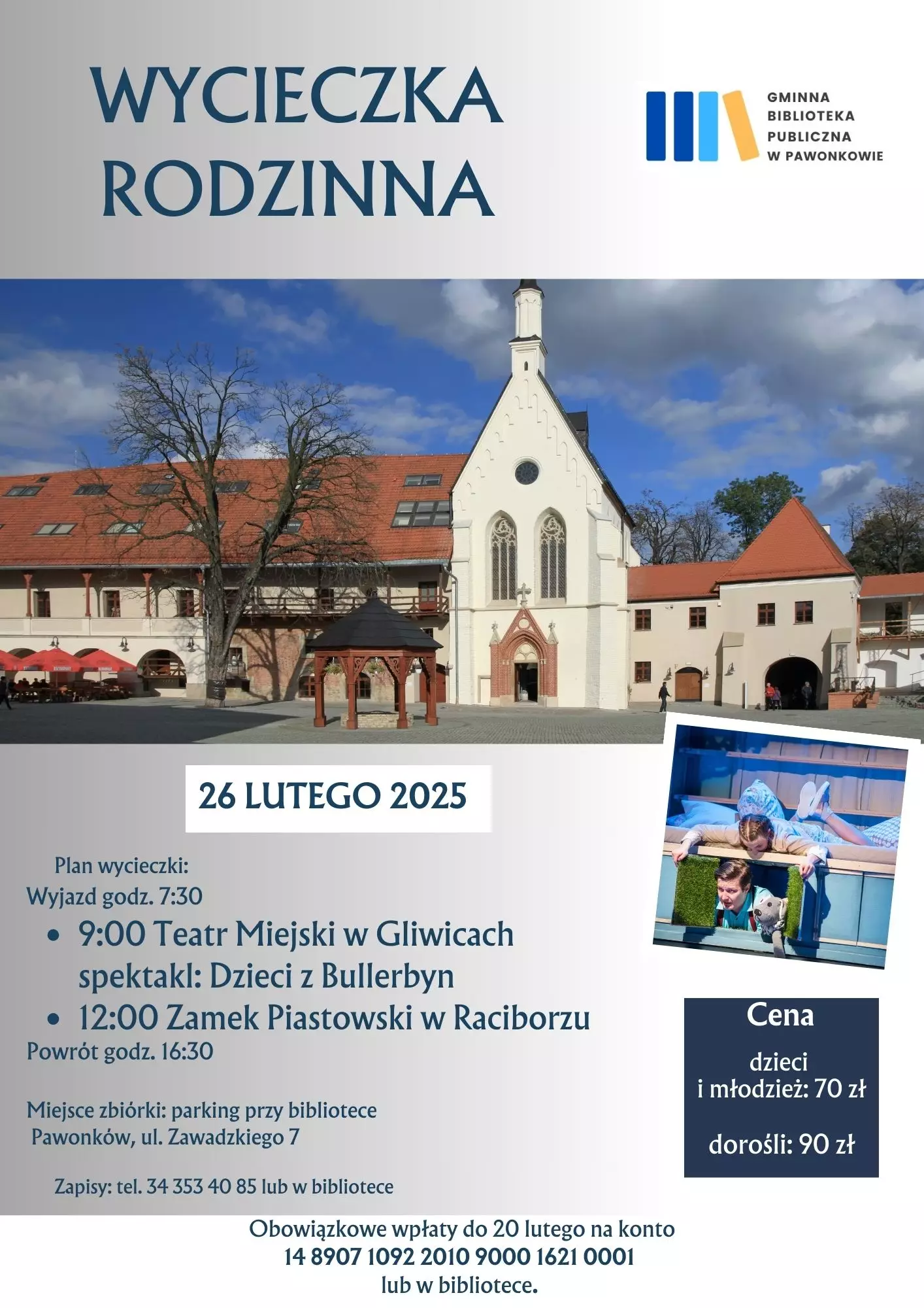 Wyjazd godz. 7:30 9:00 Teatr Miejski w Gliwicach spektakl: Dzieci z Bullerbyn 12:00 Zamek Piastowski w Raciborzu Powrót godz. 16:30 Miejsce zbiórki: parking przy bibliotece Pawonków, ul. Zawadzkiego 7