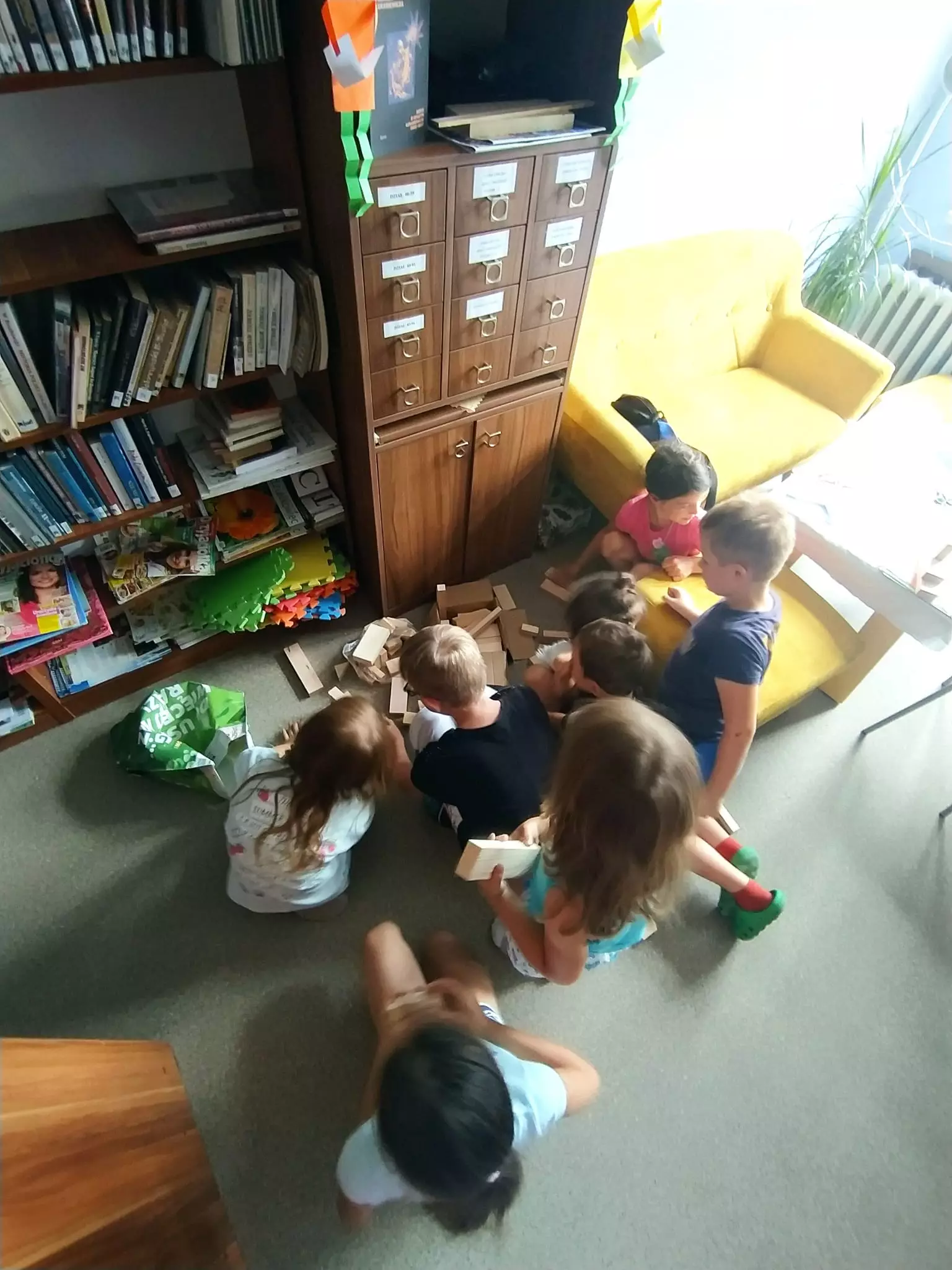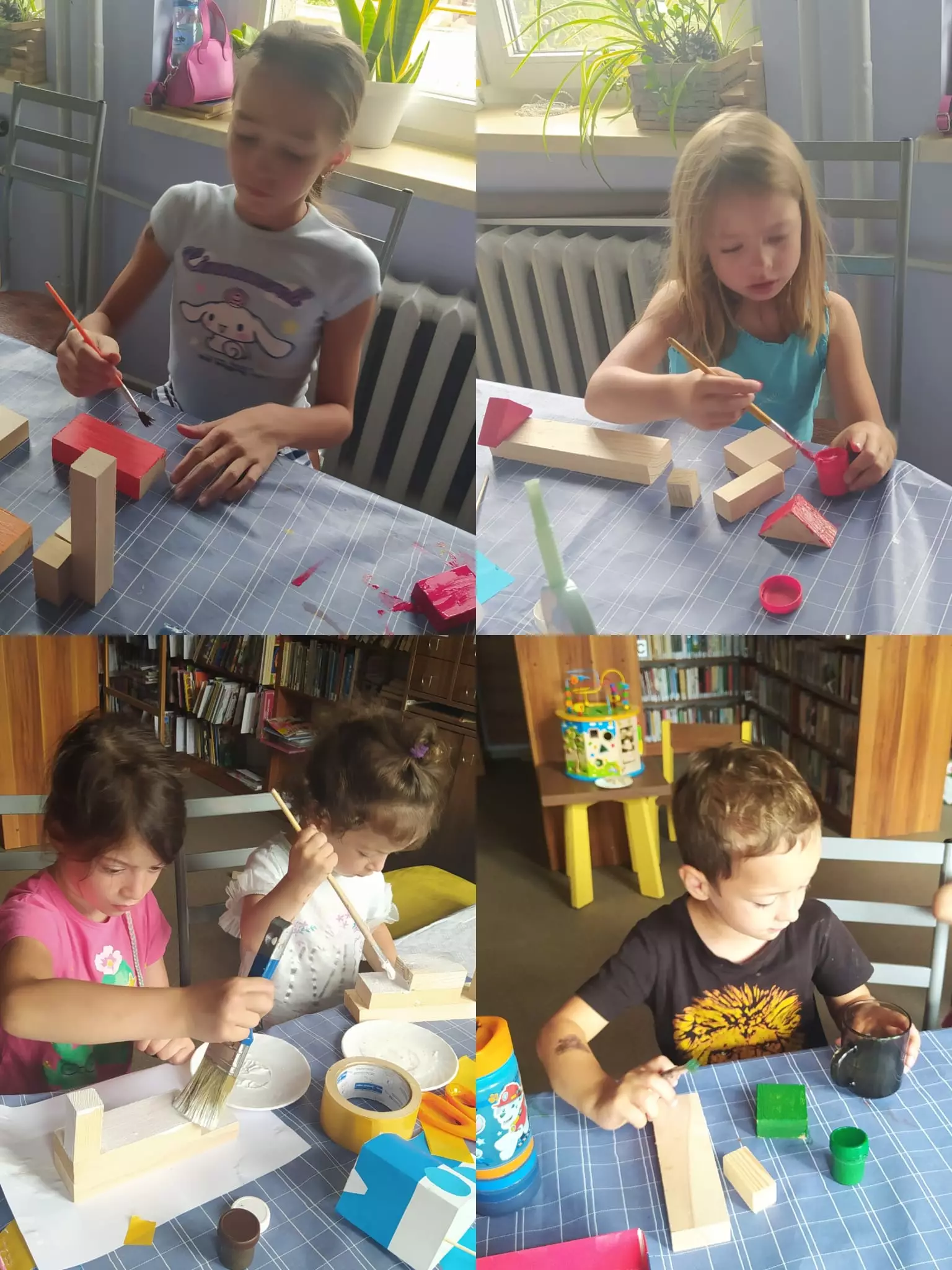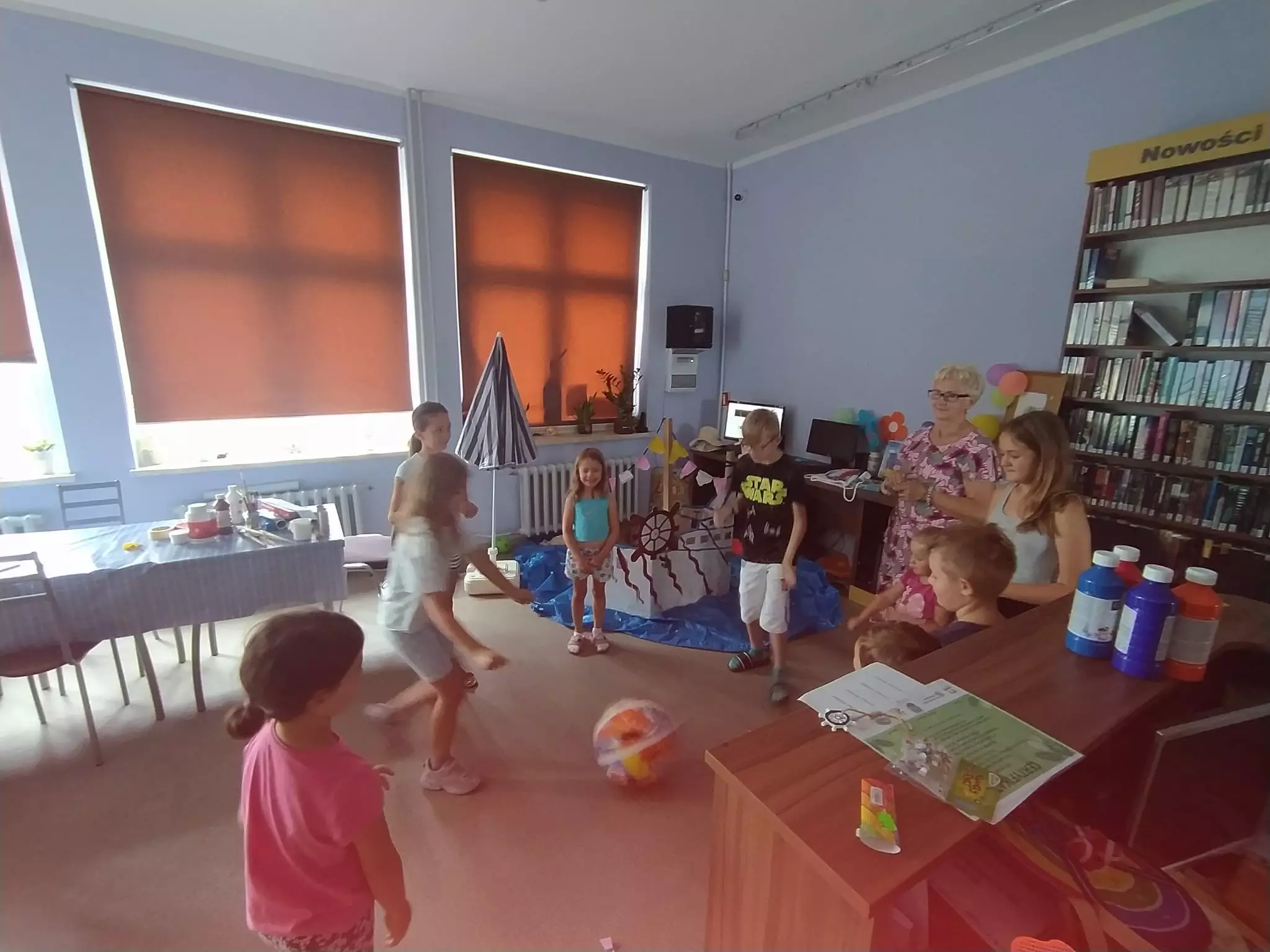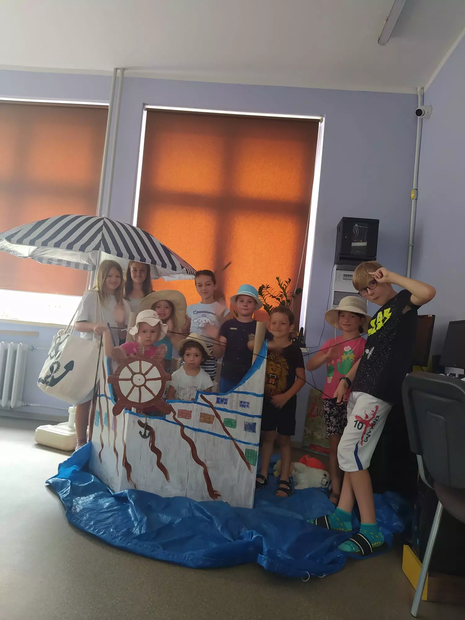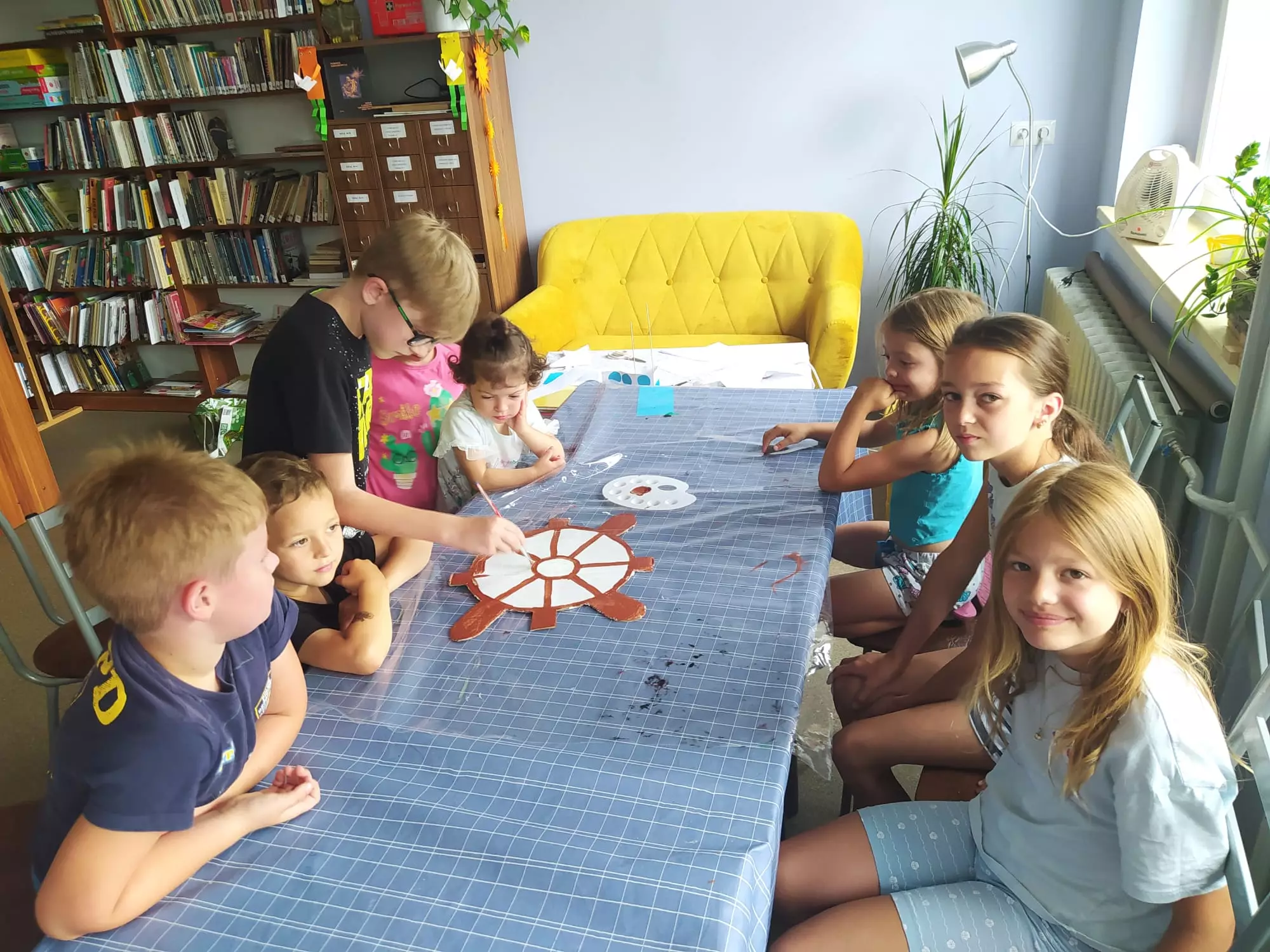 Kolaż zdjęć ze zajęć plastycznych.Kolaż zdjęć ze zajęć plastycznych.Kolaż zdjęć ze zajęć plastycznych.Statki zbudowane z drewnianych klocków.Dzieci farbami malują ster statku.Dzieci znajdują się w dużym statku zrobionym z kartonu i pomalowanym farbami.Słodki poczęstunek po zajęciach plastycznych.Zabawy ruchowe z piłką w bibliotece.Dzieci siedzą na podłodze i wybierają klocki potrzebne do zbudowania statku.Statki zbudowane z drewnianych klocków.Uczestnicy zajęć pozują do zdjęcia siedząc przy stole w bibliotece ze swoimi pracami plastycznymi.