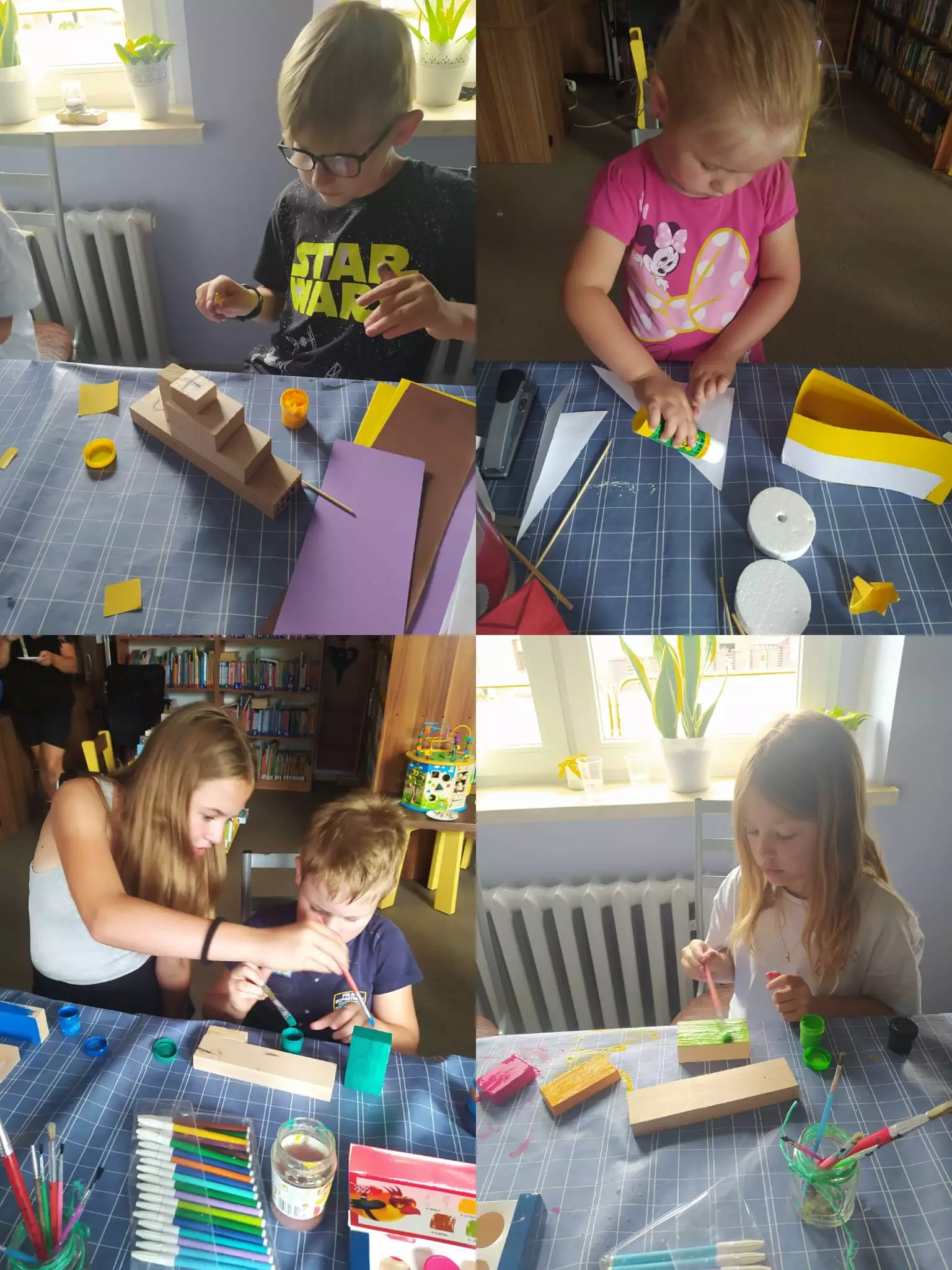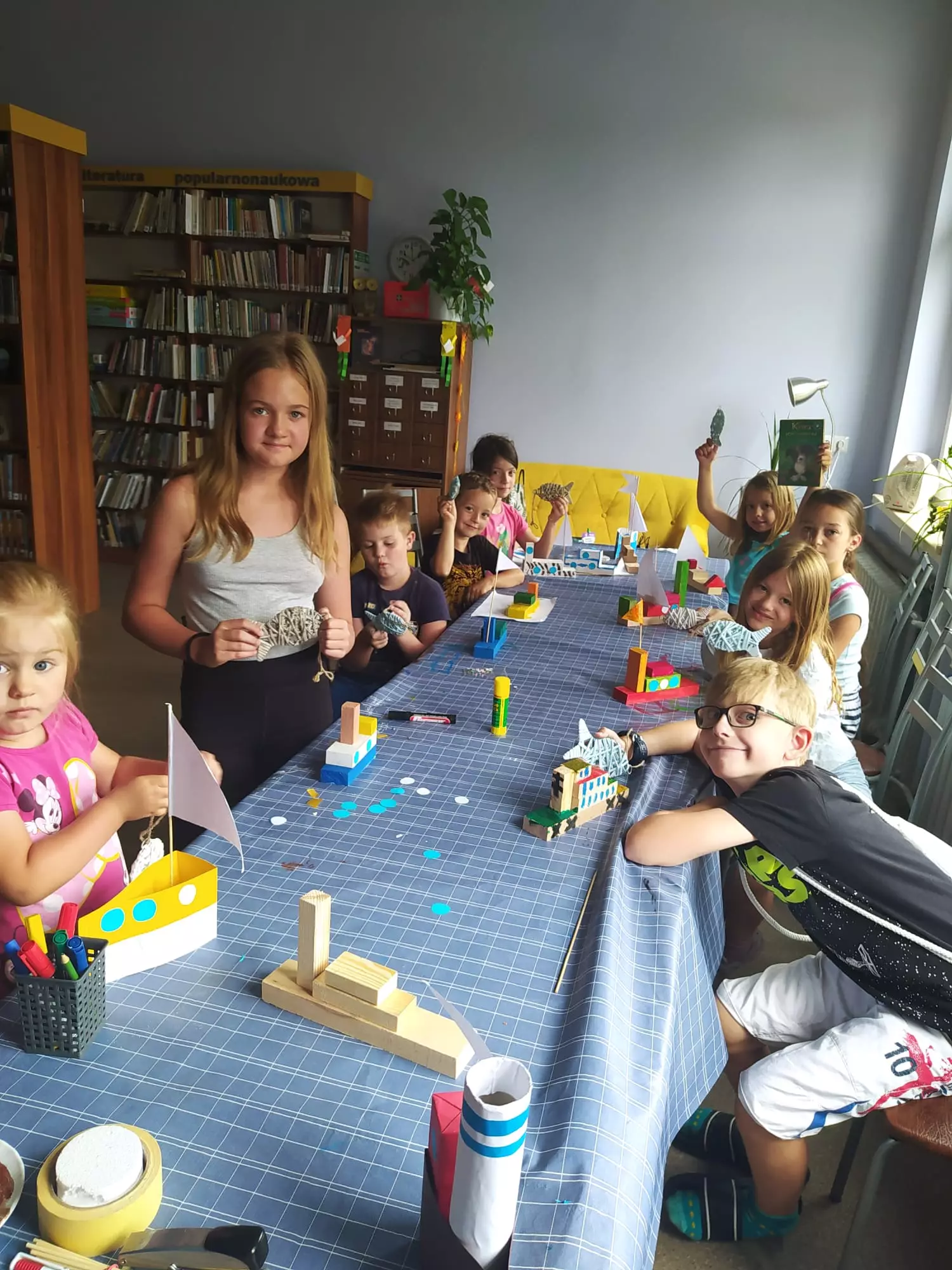 Podczas kolejnych wakacyjnych zajęć literacko-plastycznych w bibliotece w Gwoździanach, uczestnicy udoskonalili swój statek do podróży z Panem Kleksem.