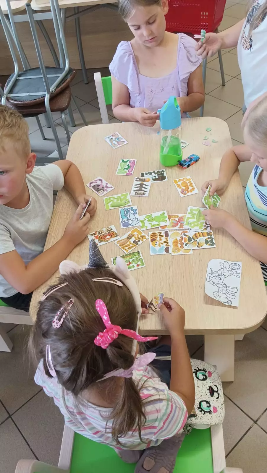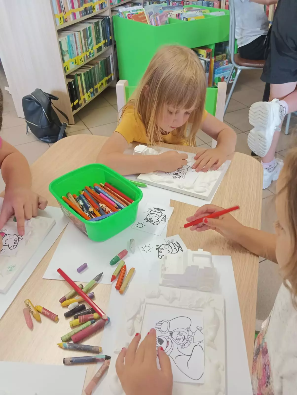 Dzieci kolorują kredkami obrazki.Dzieci kolorują kredkami obrazki.Dzieci siedzą przy stolikach i słuchają czytanej bajki przez bibliotekarkę.Wspólne zdjęci dzieci po zajęciach.Dzieci siedzą przy stoliku i układają karty.Uczestnicy zajęć częstują się chrupkami.Dzieci kolorują obrazki kolorowymi kredkami.Dzieci kolorują ramki gipsowe.
