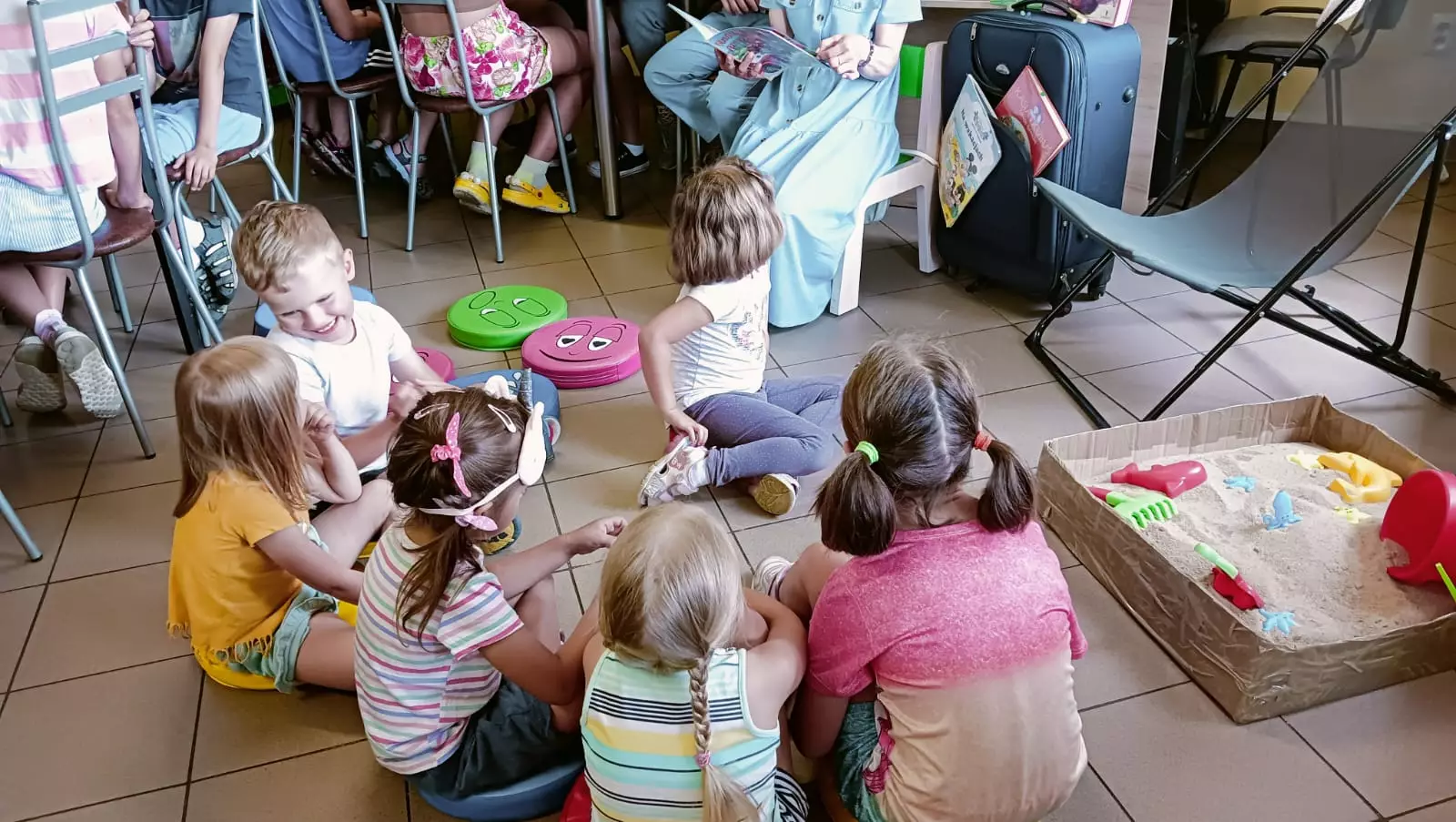 Dzieci słuchają bajki czytanej przez bibliotekarkę.