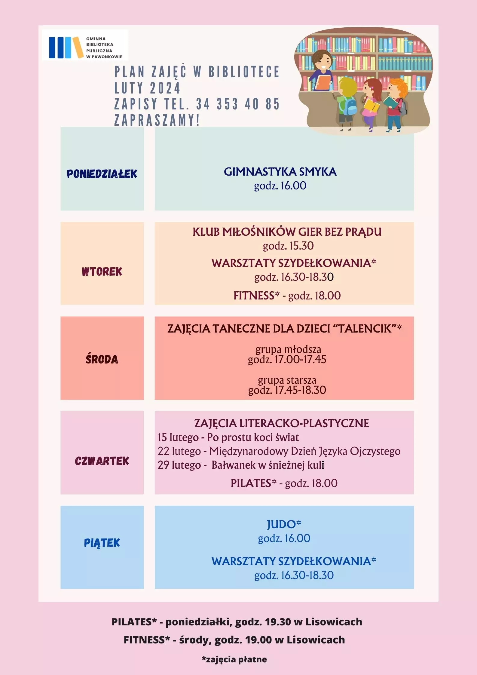 Plan zajęć w bibliotece Luty 2024 Zapisy tel. 34 353 40 85 ZAPRASZAMY!