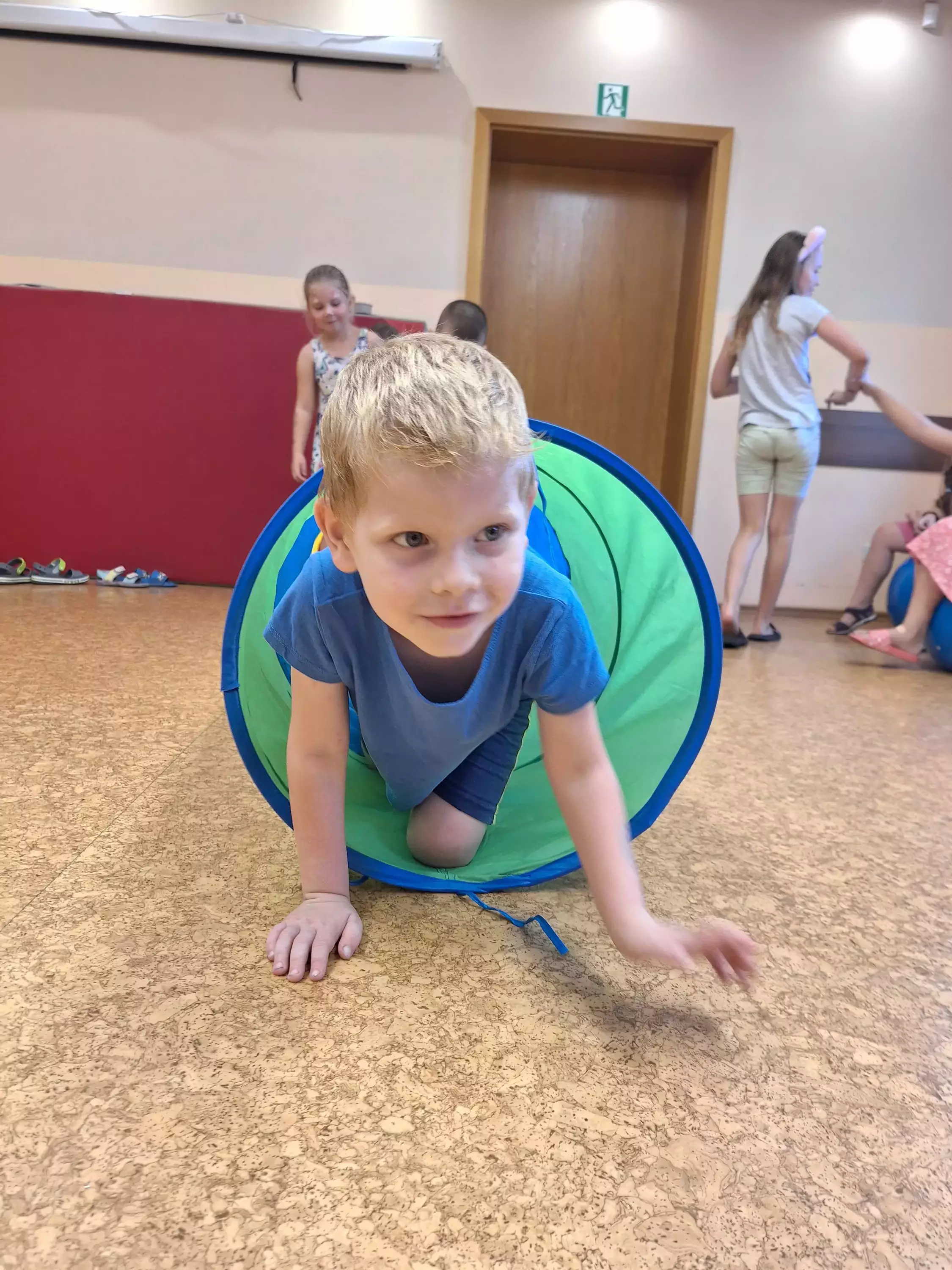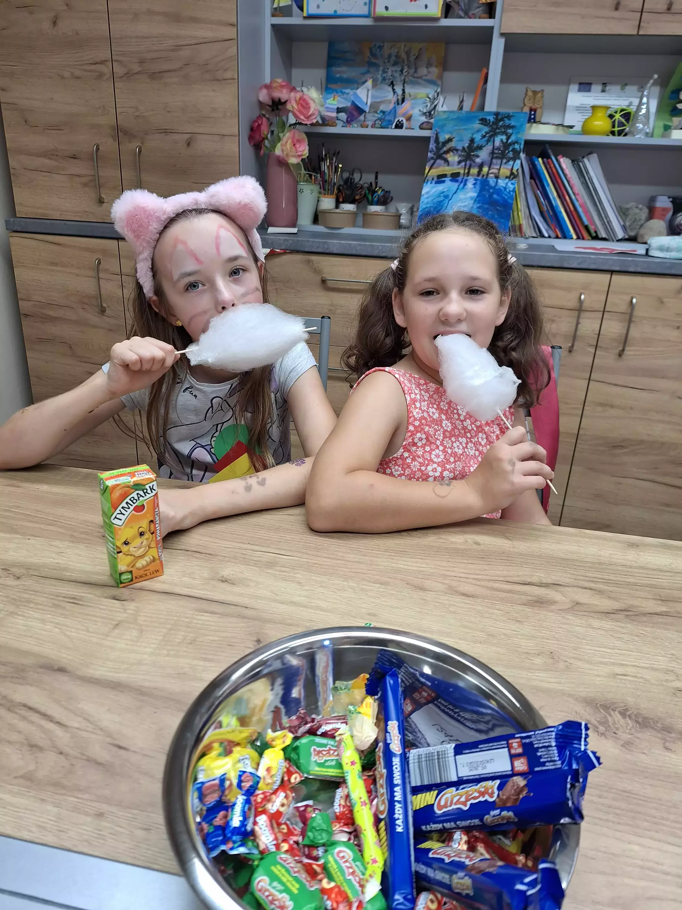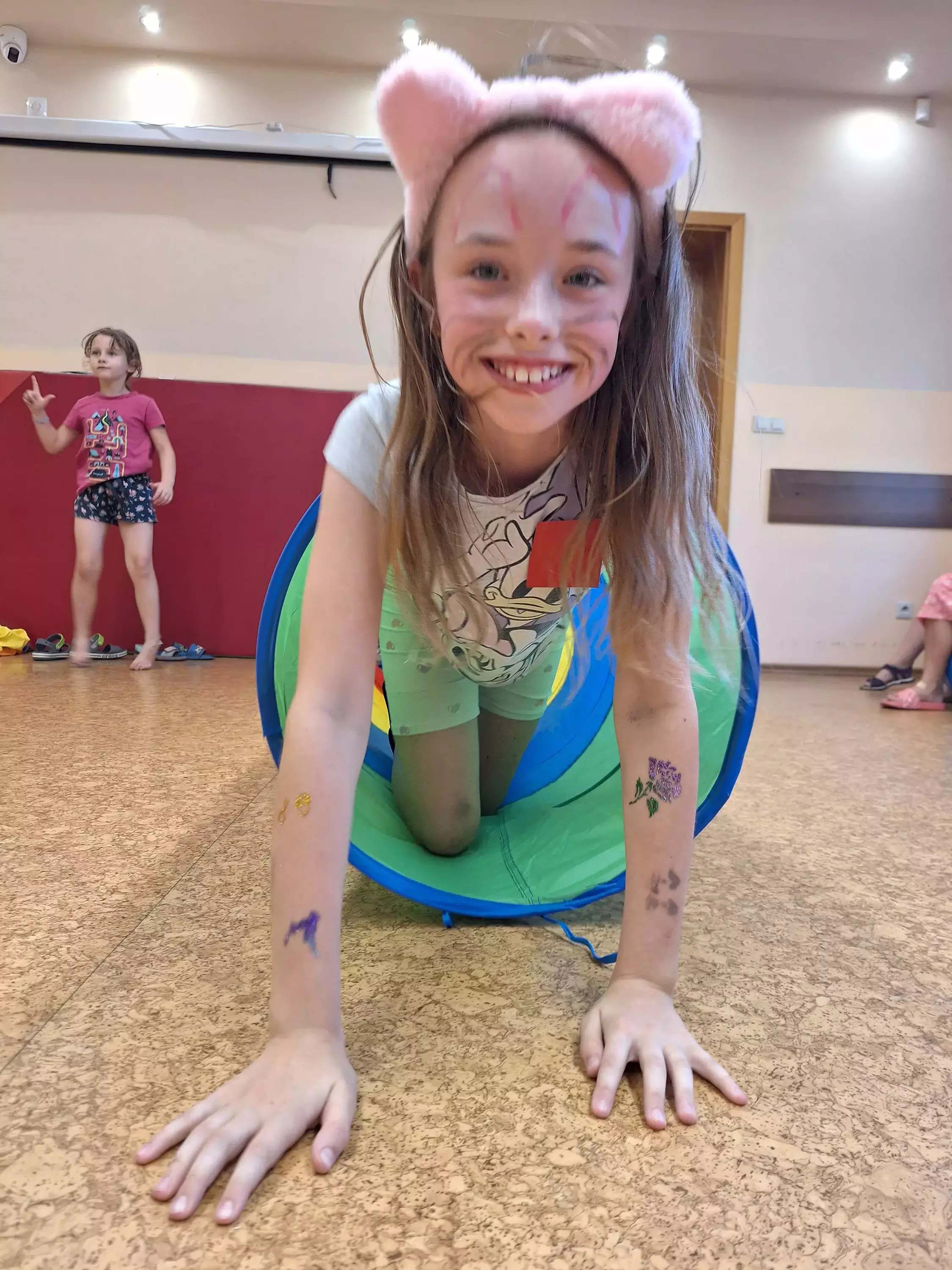 Chłopcy robią sobie nawzajem tatuaże na rękach.Dziewczynki malują sobie na rękach tatuaże brokatowe.Dziewczynka ma na twarzy pomalowanego motyla.Dwie dziewczynki z pomalowanymi buziami w kotki.Dzieci biegają po sali gimnastycznej.Dziewczynka na sali gimnastycznej przechodzi przez tunel.Chłopczyk przechodzi przez tunel na kolanach.Dziewczynki jedzą watę cukrową.Dzieci stoją w kolejce po watę cukrową.Dziewczynka z pomalowana buzia trzyma w ręce konika a w drugiej watę cukrowa.Dzieci trzymają w ręce rozciągnięta chustę animacyjną.