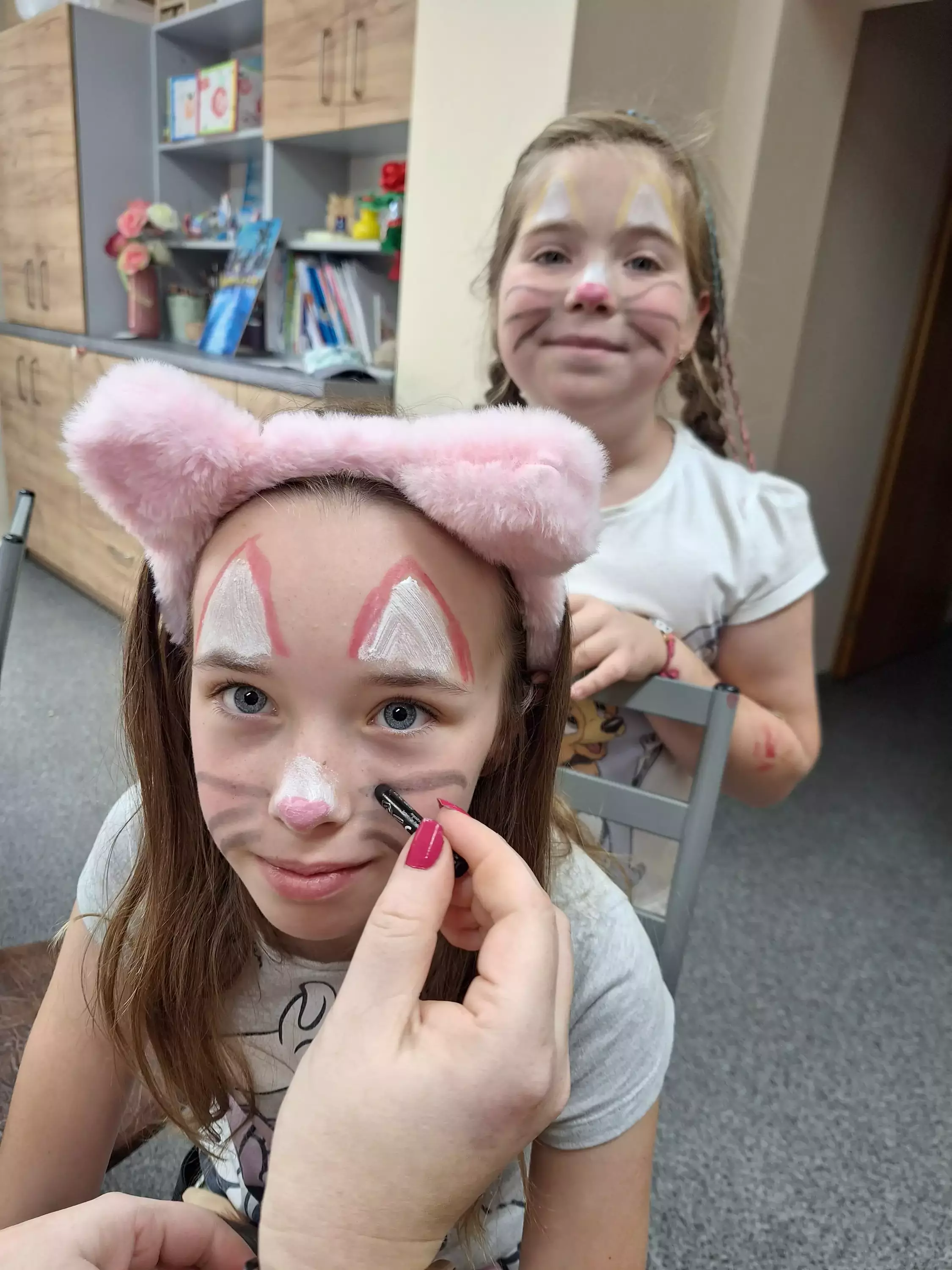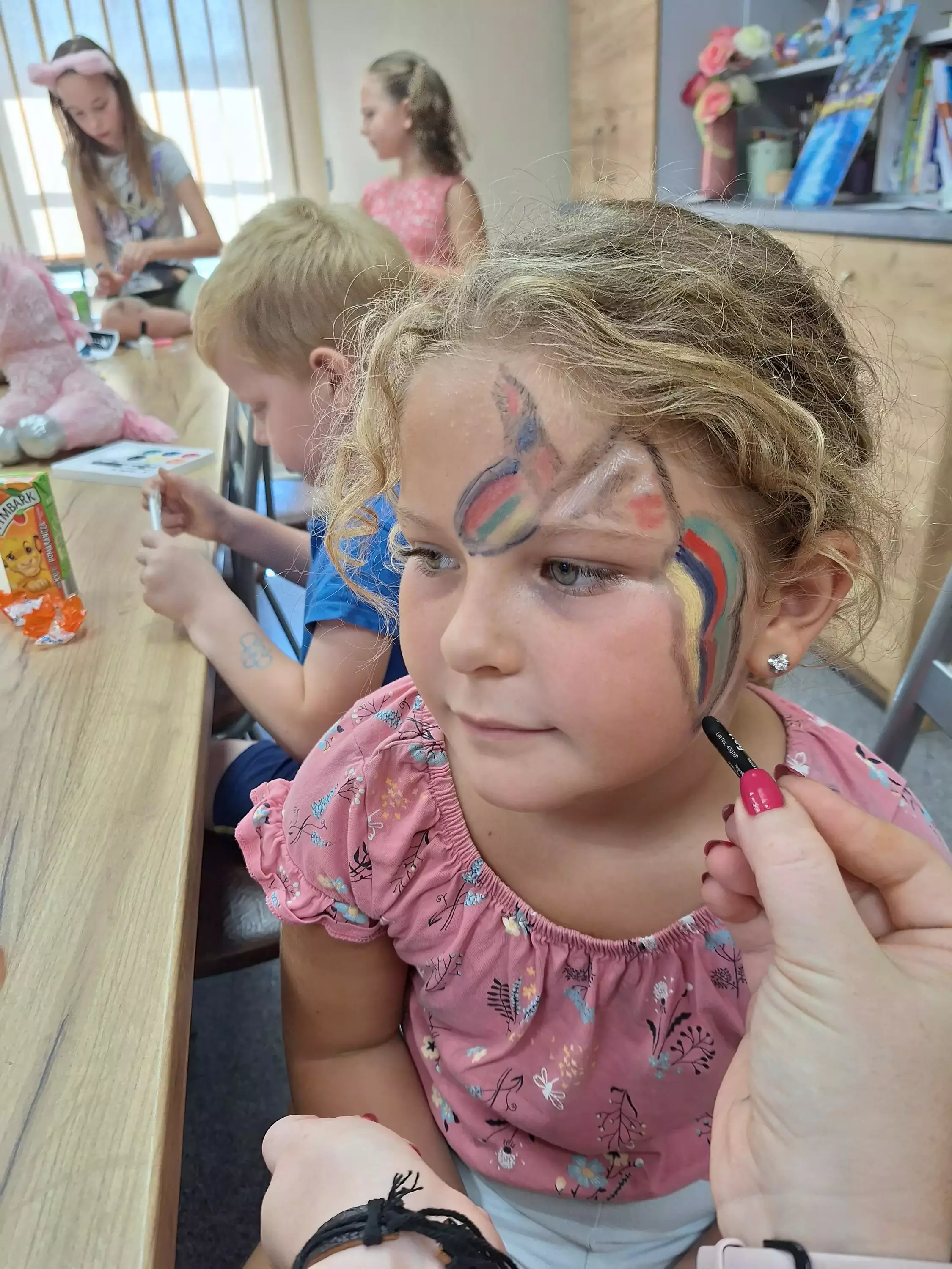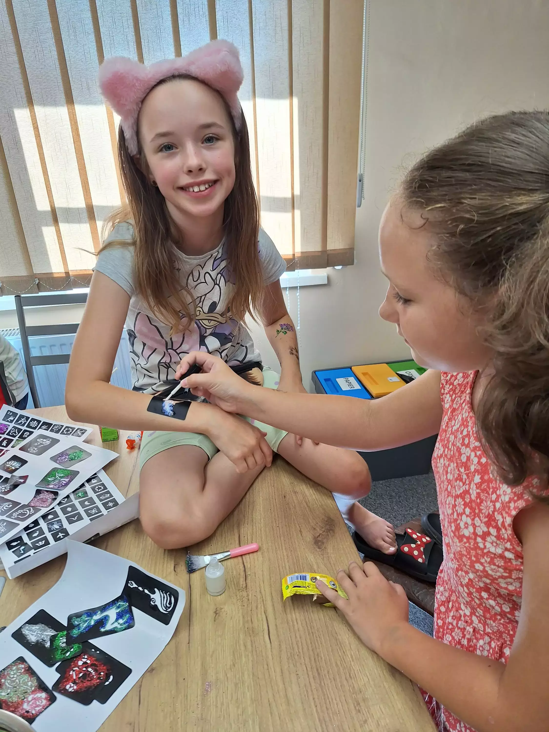 Chłopcy robią sobie nawzajem tatuaże na rękach.Dziewczynki malują sobie na rękach tatuaże brokatowe.Dziewczynka ma na twarzy pomalowanego motyla.Dwie dziewczynki z pomalowanymi buziami w kotki.Dzieci biegają po sali gimnastycznej.Dziewczynka na sali gimnastycznej przechodzi przez tunel.Chłopczyk przechodzi przez tunel na kolanach.Dziewczynki jedzą watę cukrową.Dzieci stoją w kolejce po watę cukrową.Dziewczynka z pomalowana buzia trzyma w ręce konika a w drugiej watę cukrowa.Dzieci trzymają w ręce rozciągnięta chustę animacyjną.