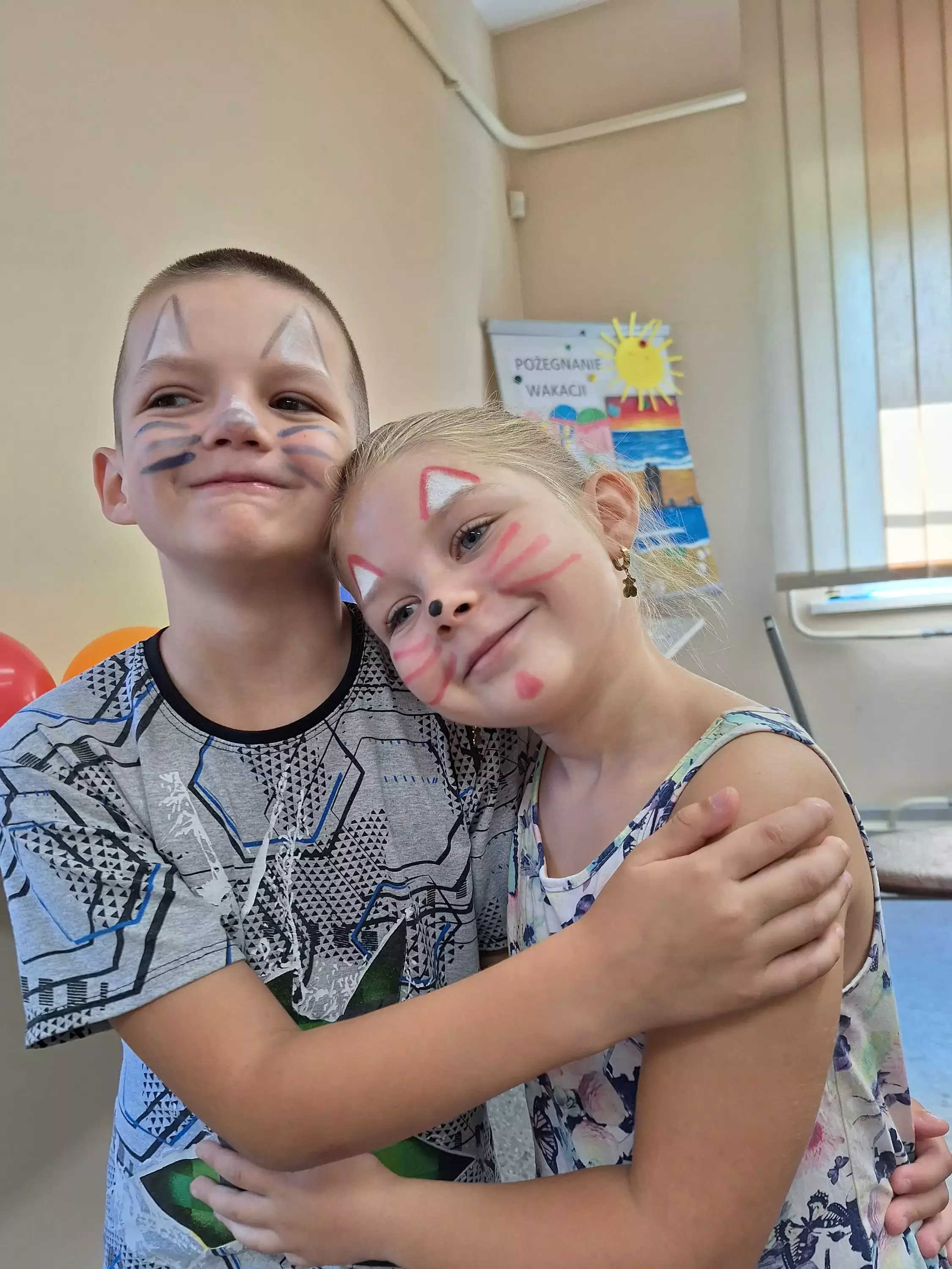 Chłopczyk i dziewczynka z pomalowanymi twarzami przytulają się do siebie.