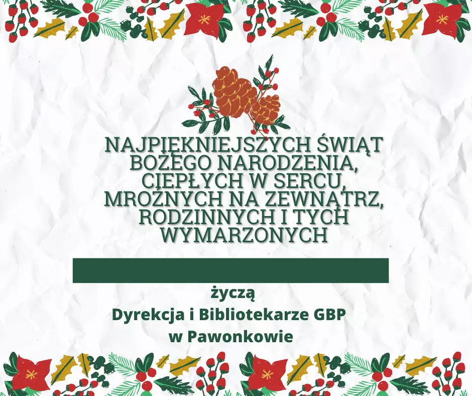 Najpiękniejszych Świąt Bożego Narodzenia, ciepłych w sercu, mroźnych na zewnątrz, rodzinnych i tych wymarzonych życzy Dyrekcja i Bibliotekarze GBP w Pawonkowie.